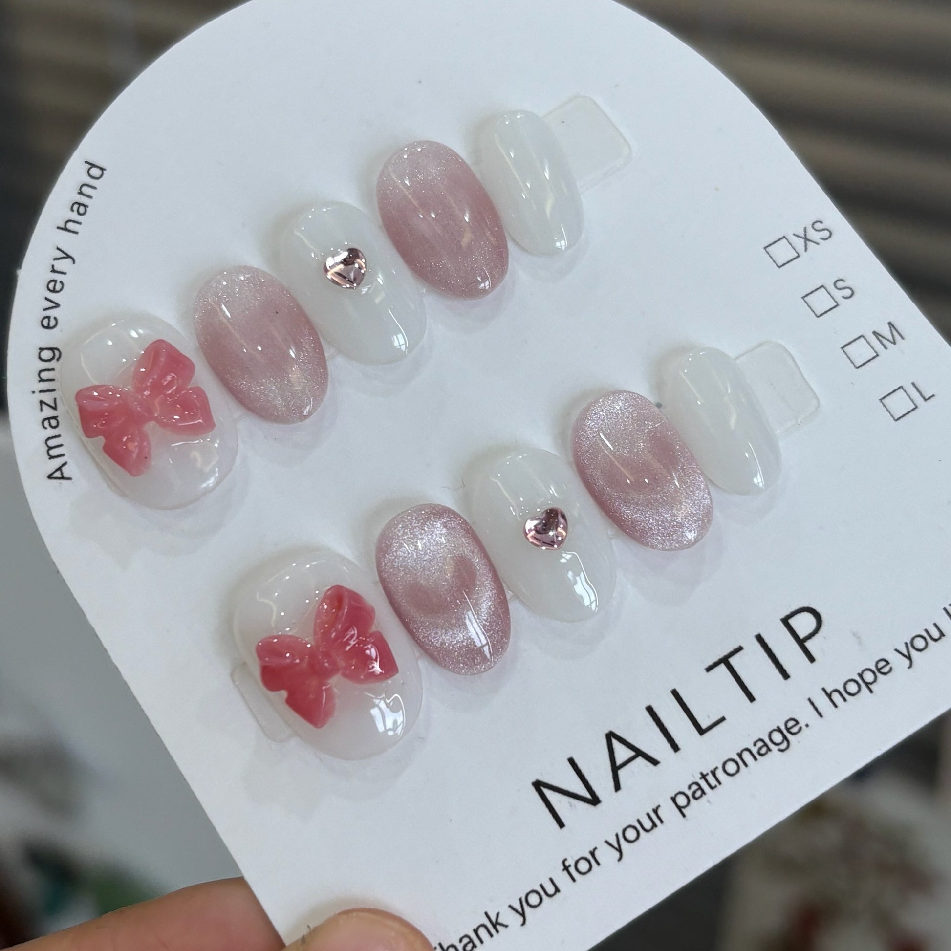 這款 「甜美蝴蝶結」 穿戴甲 💅 以 裸粉色、純白色為基調,搭配 立體粉色蝴蝶結與粉水晶愛心點綴,展現 夢幻甜美 的氛圍 ✨。