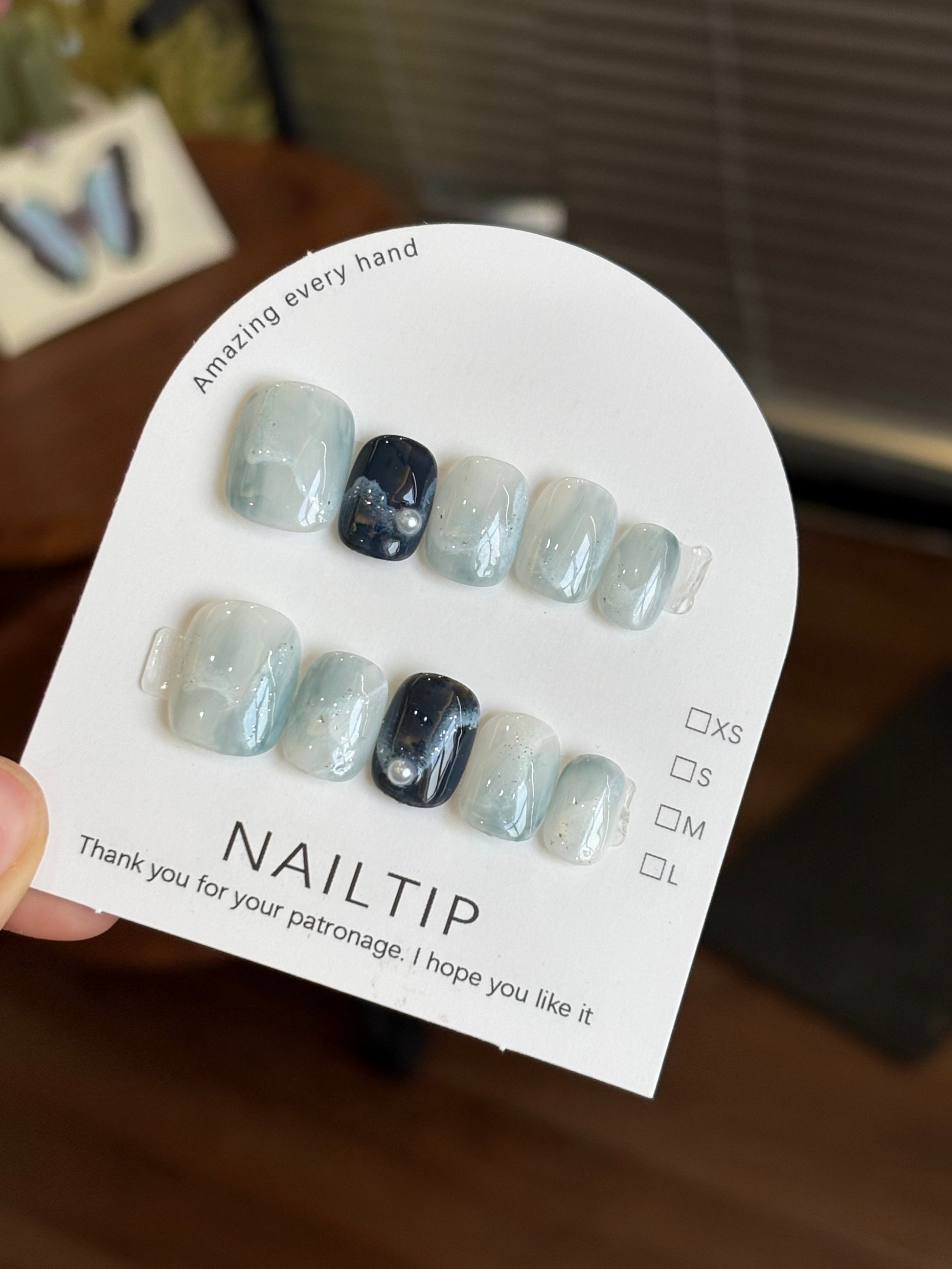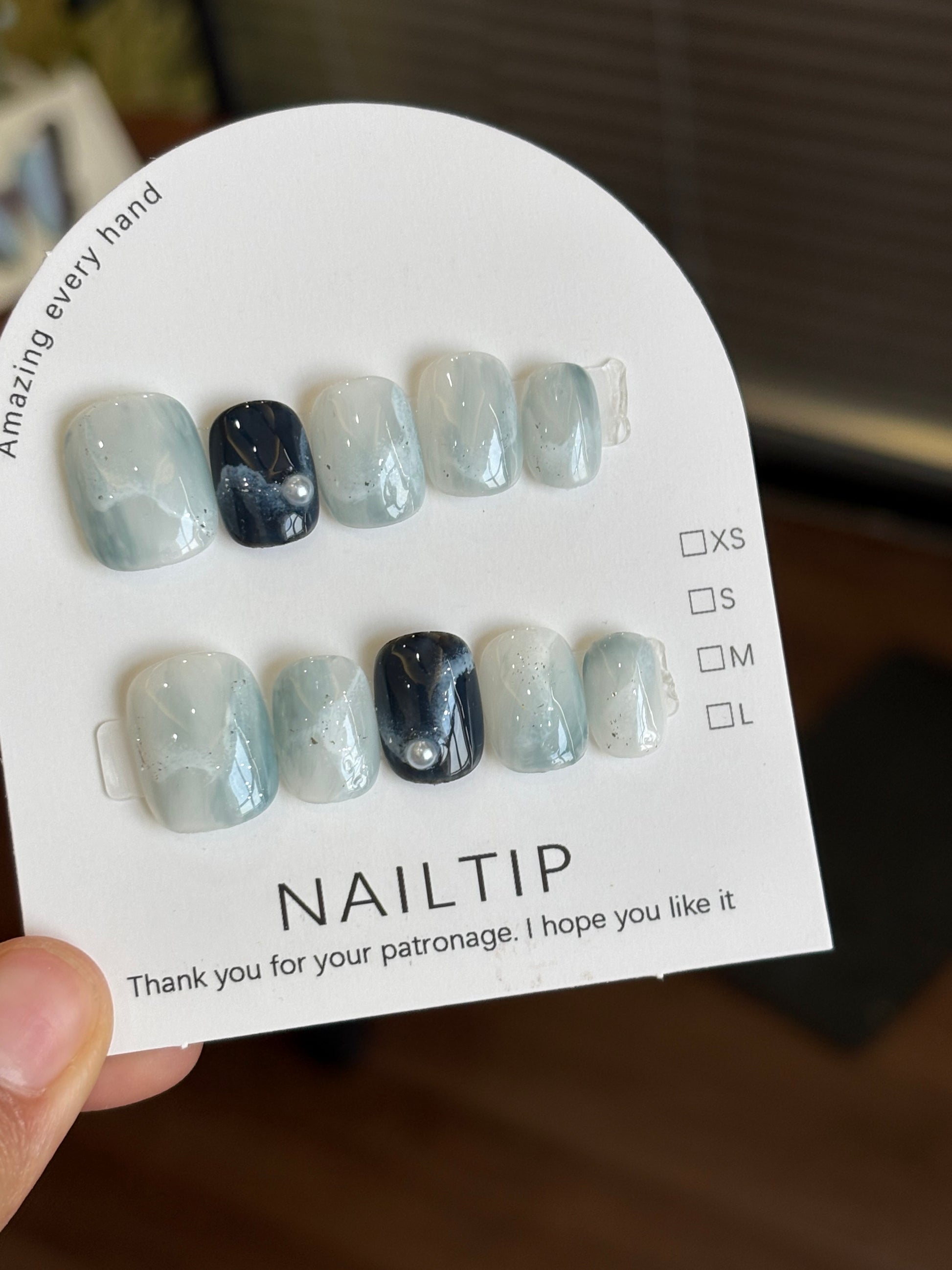 淡淡灰藍如水波暈開,閃爍著銀箔的微光,一顆珍珠靜靜點綴深藍指面,如夜海中的月影🫧。這款設計溫柔又神秘,適合追求質感與靜謐美感的你。