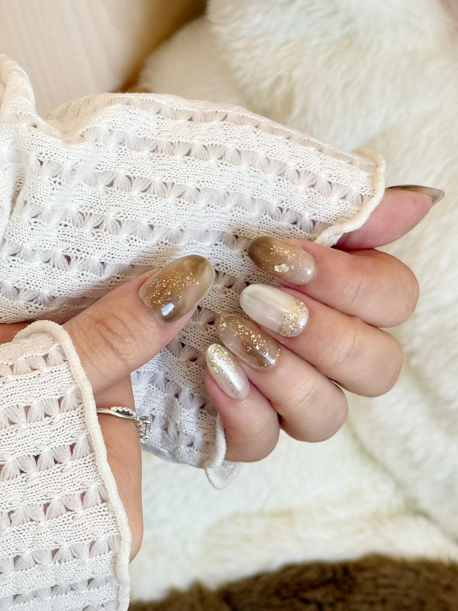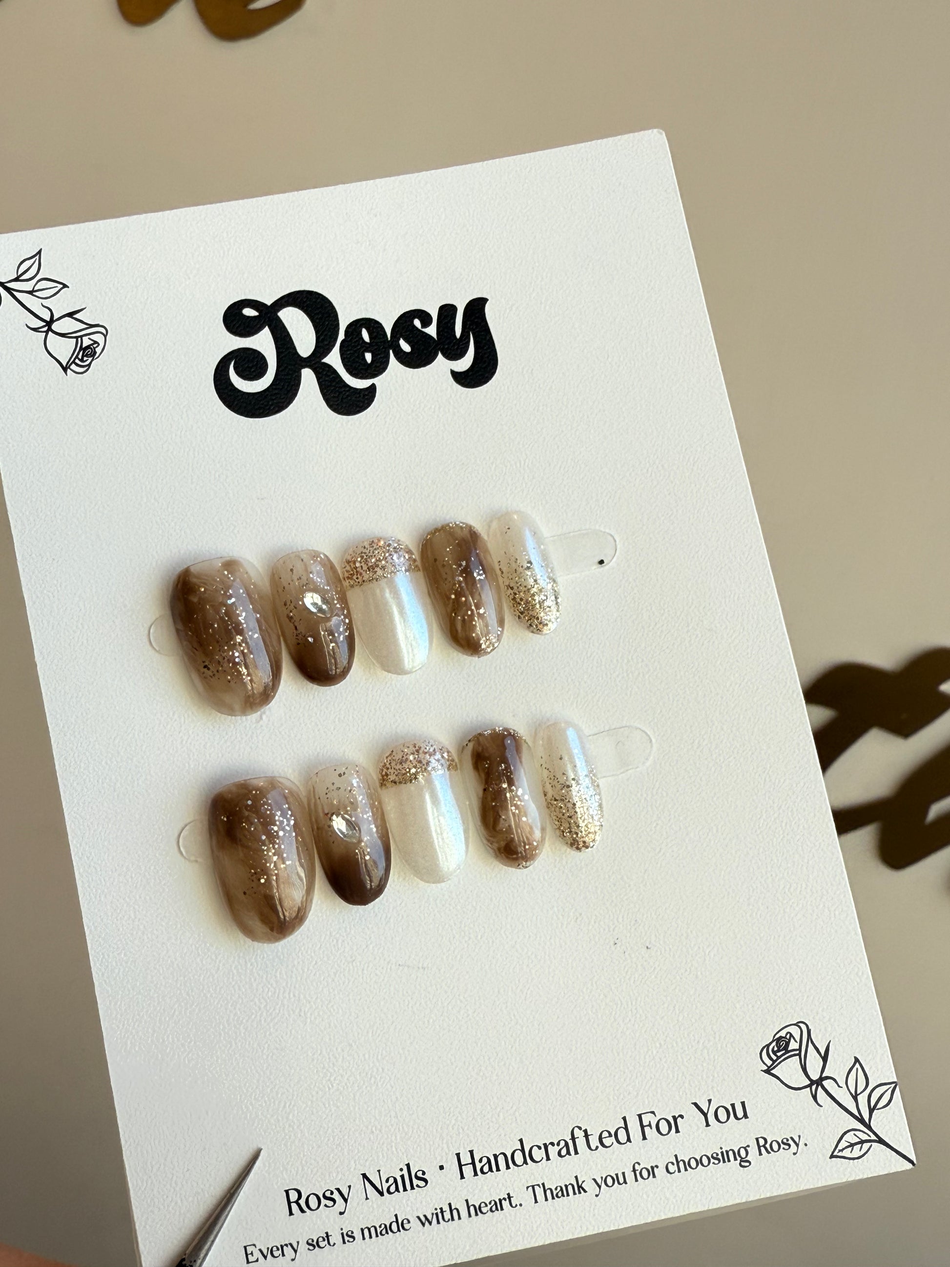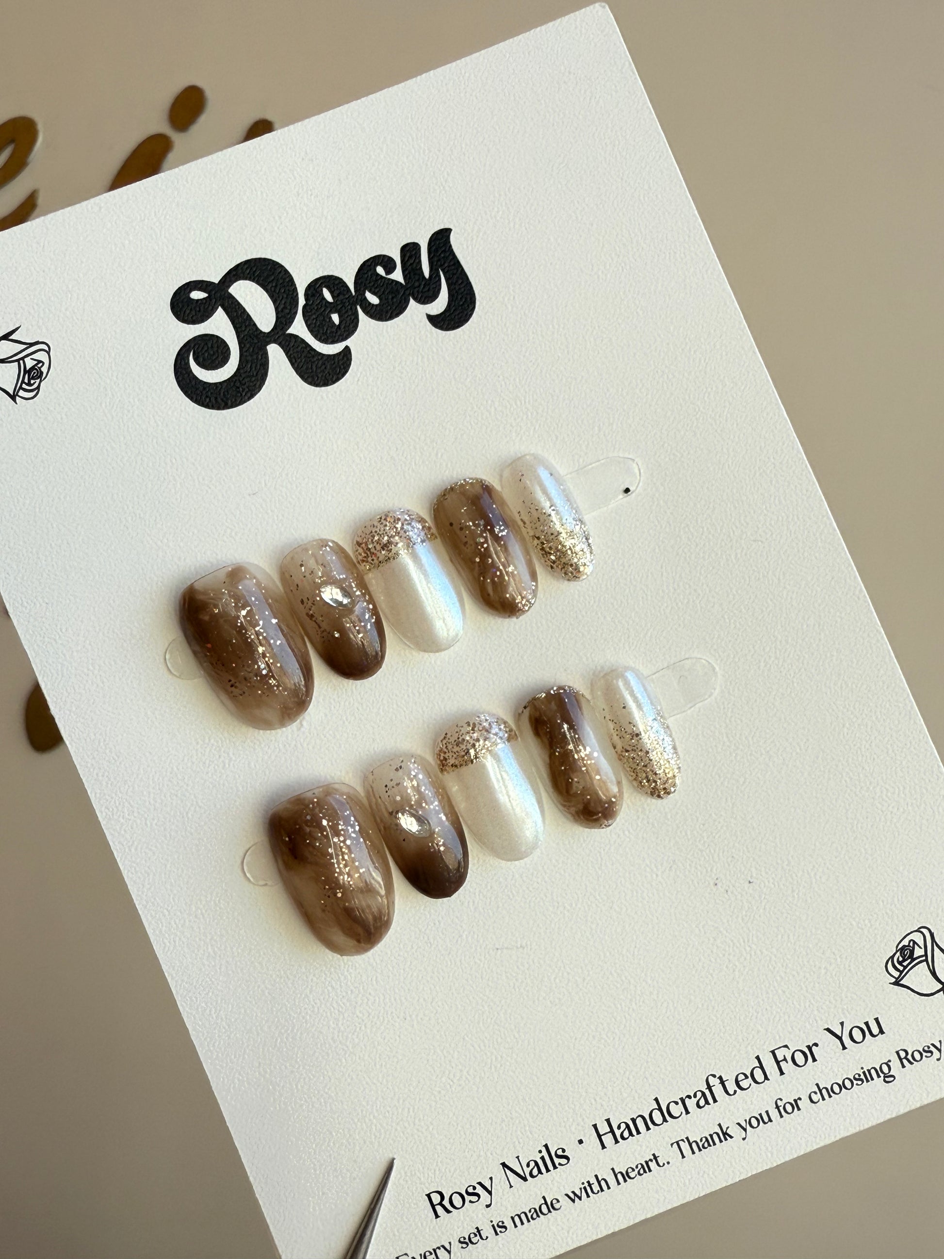 ☕ 琥珀濾光 · Amber Brew 描述|Description:以琥珀棕與奶金暈染為主調,交織出如咖啡漸層般的溫潤質感☕。金箔與閃粉細節如陽光穿過玻璃的光影,帶出秋冬獨有的沉穩高級感✨。 特點|Features: 琥珀棕 × 奶金暈染,層次柔和高雅🤎 金箔與亮粉點綴,閃耀而不浮誇✨ 顯白又顯手氣質,適合秋冬穿搭🍂 咖啡控與氣質女生必收款💫