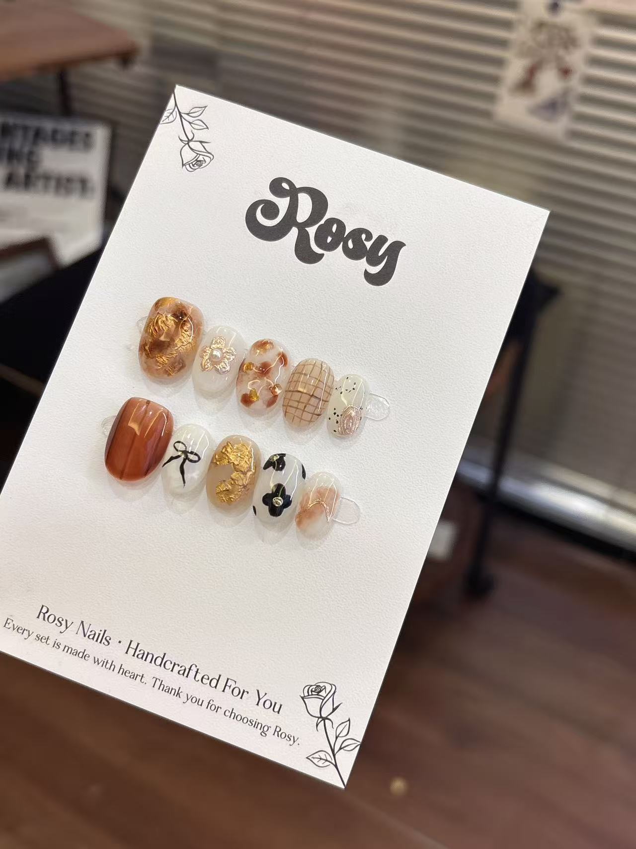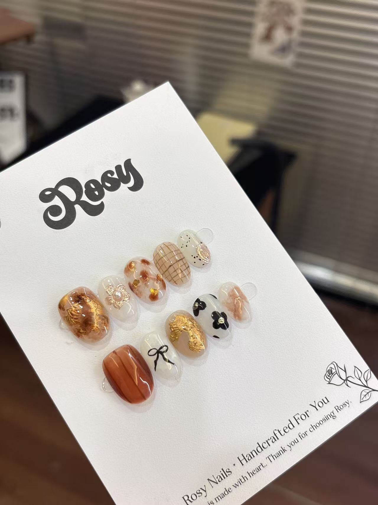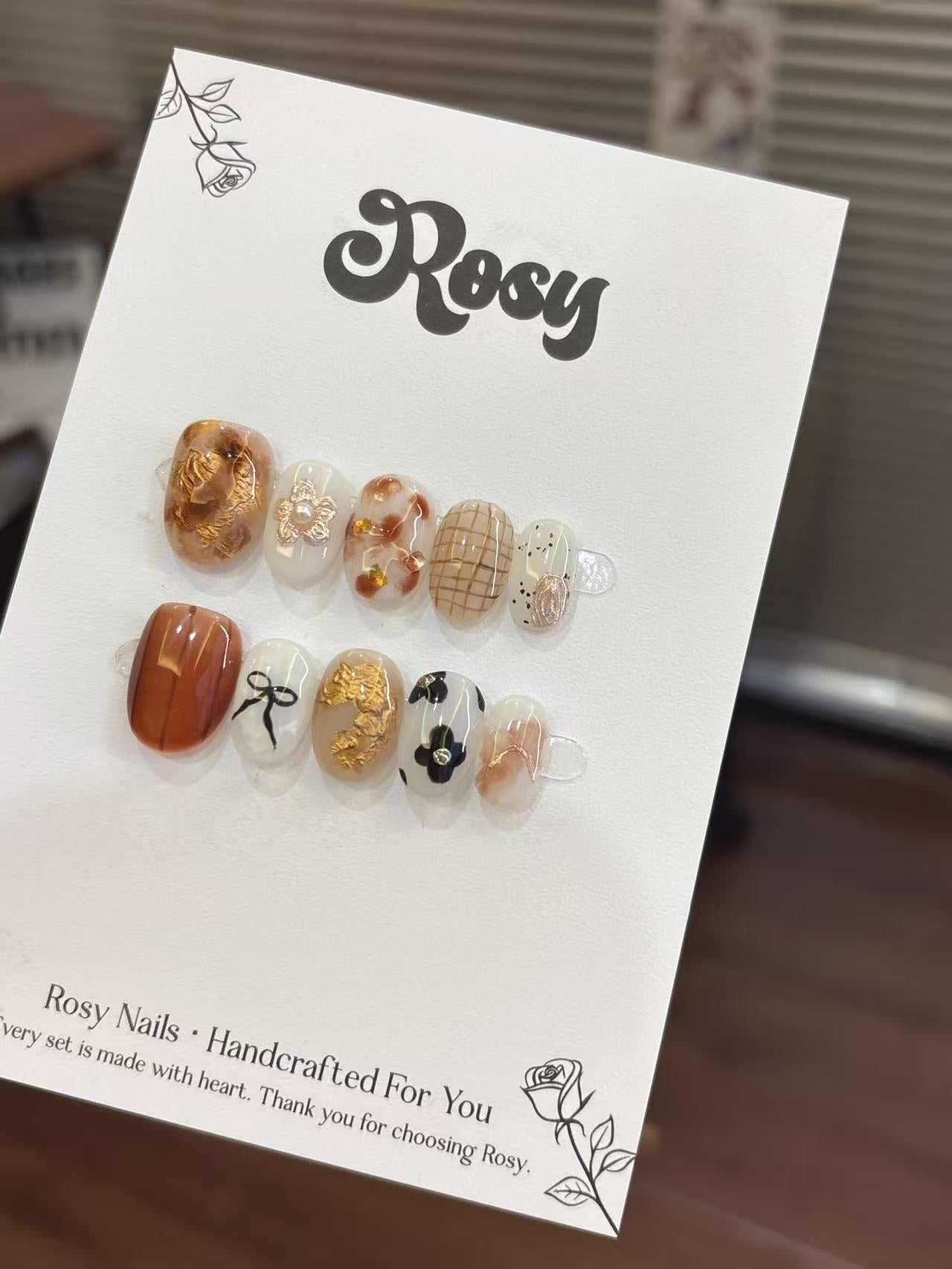 Rosy每副穿戴甲獨一無二,顏色深淺、紋路、飾品大小皆有少許差異