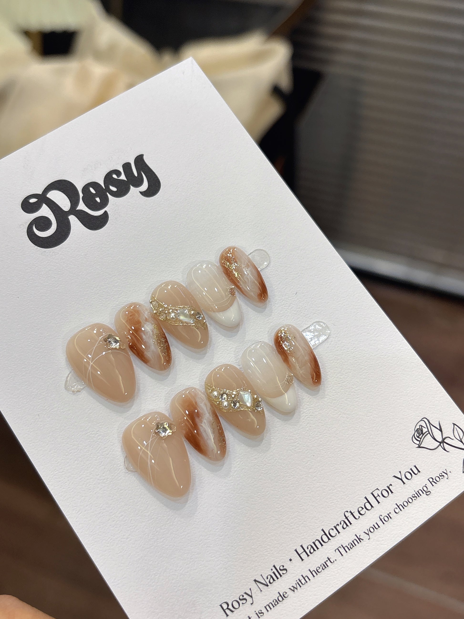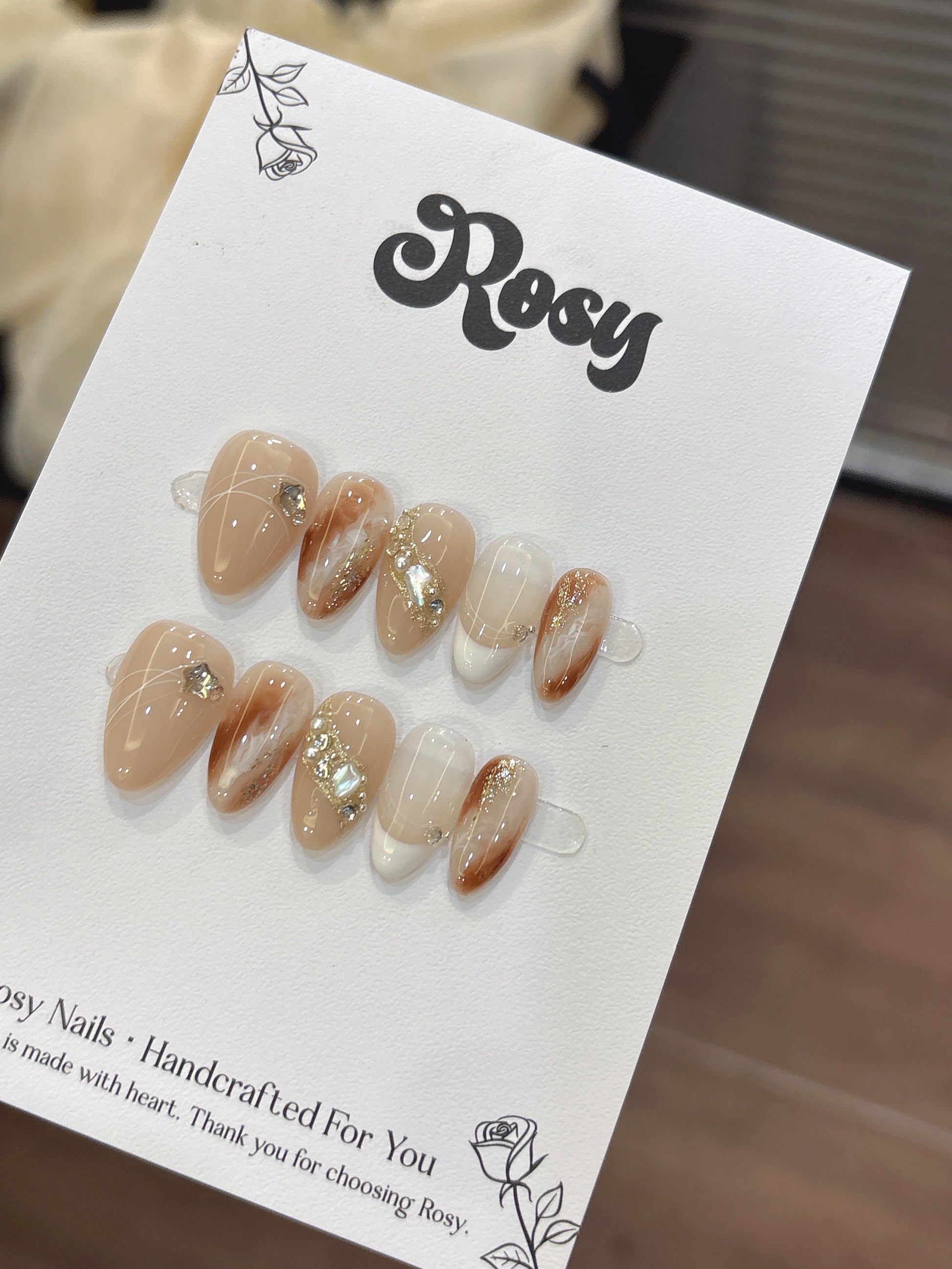 Rosy每副穿戴甲獨一無二,顏色深淺、紋路、飾品大小皆有少許差異