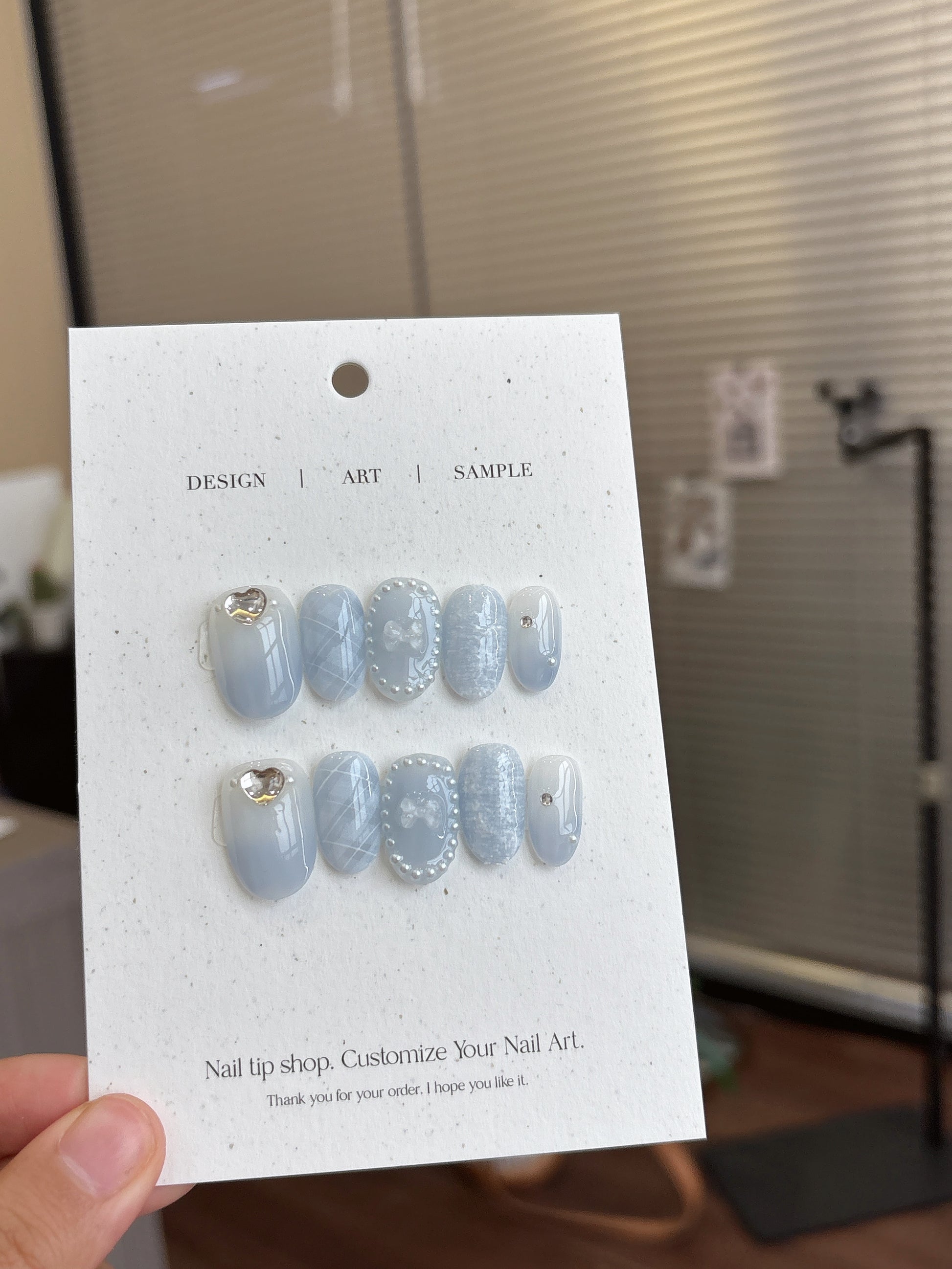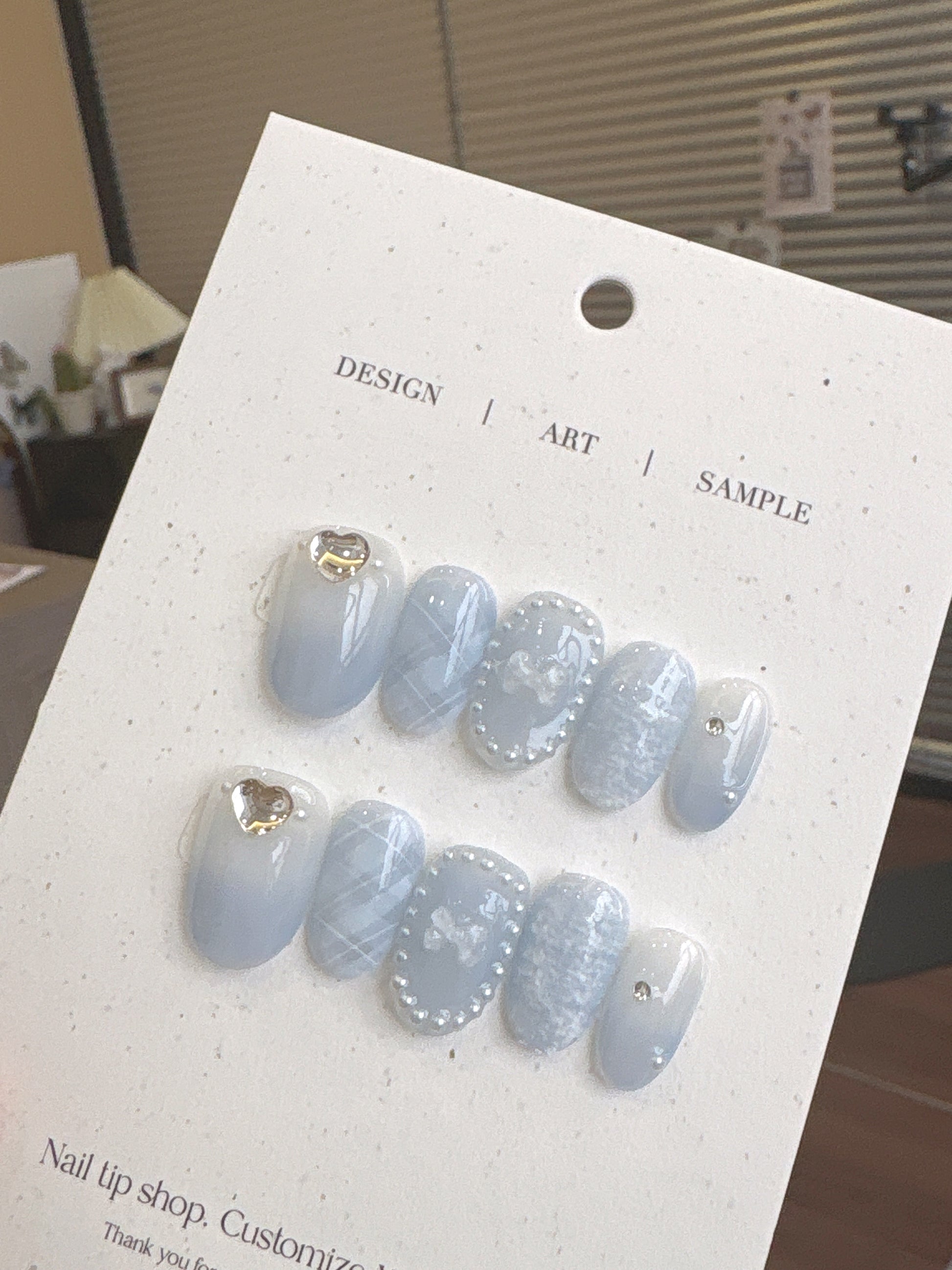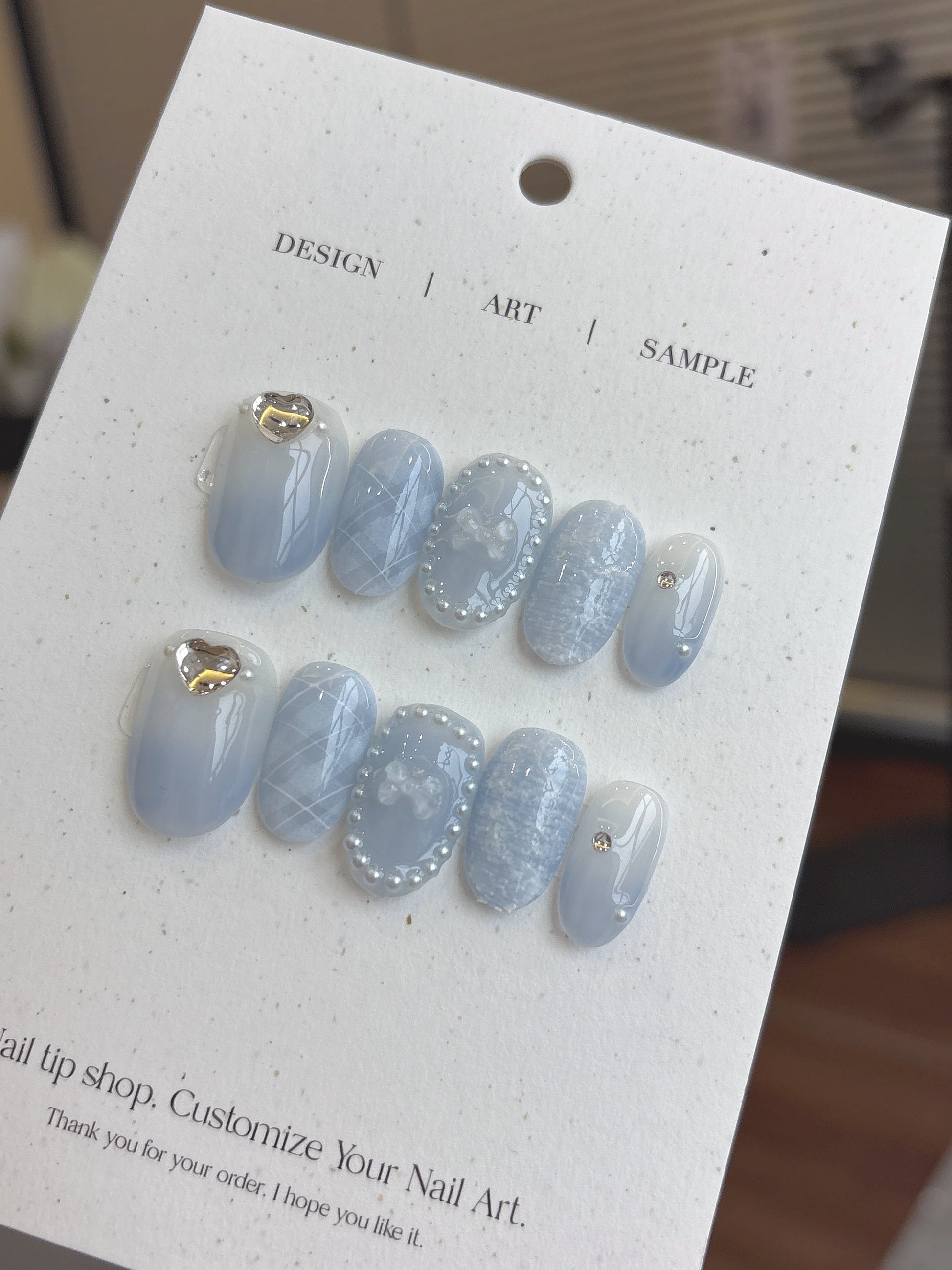 靈感源自冬季天光與柔霧編織的夢境,這款設計運用低飽和霧藍調,結合立體雕花蝴蝶結與珍珠包邊,展現高雅而純淨的美感。搭配格紋與針織紋理,彷彿披上了溫柔毛衣,讓整體造型細膩又耐看。