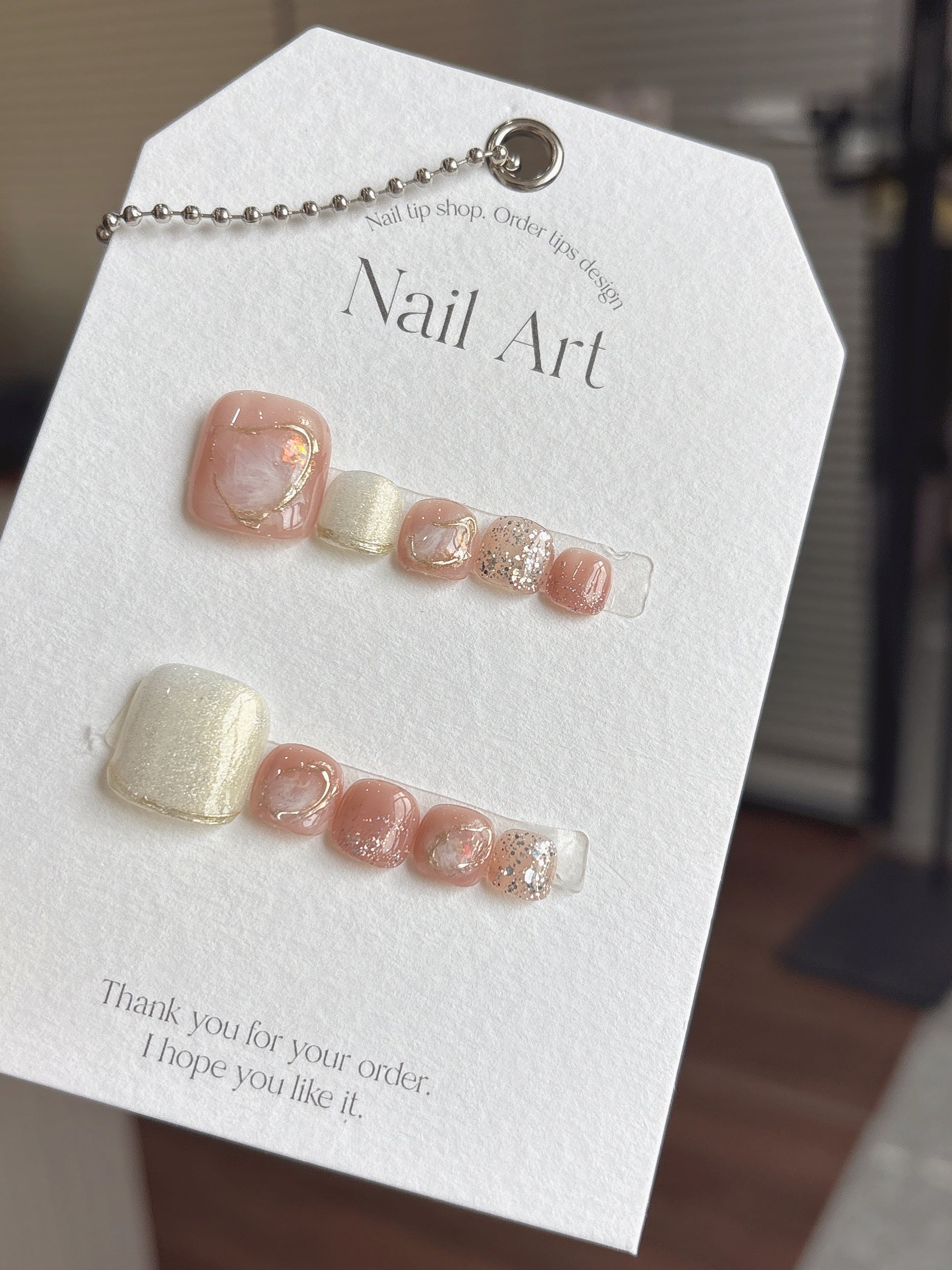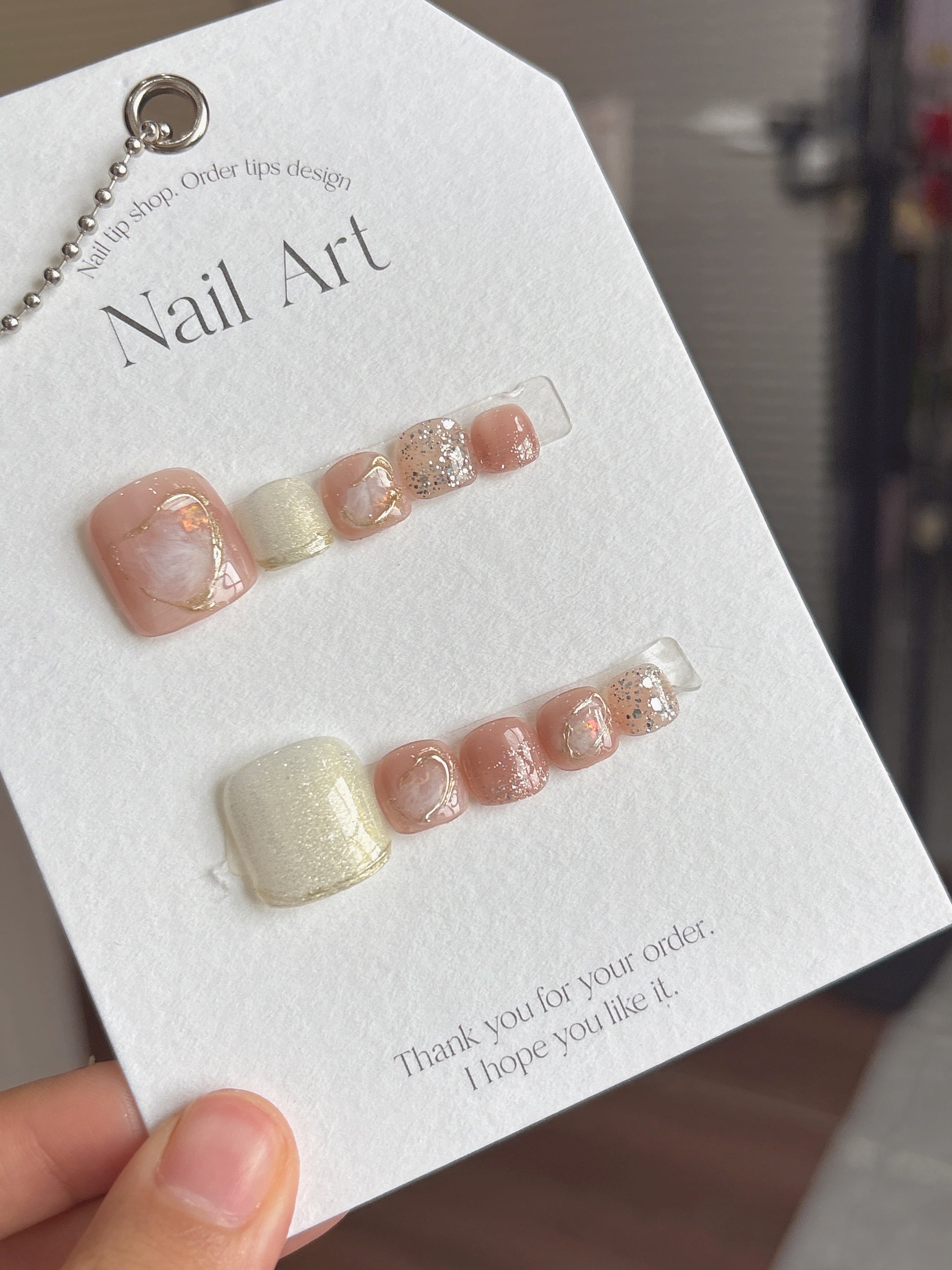 晶瑩剔透的粉色指面內嵌仿貝殼晶石紋理,再以手工金線勾邊,營造高級水晶感。配合奶油金與閃銀粉的跳色設計,細節滿滿又不失溫柔,無論是度假穿搭還是日常配涼鞋都能瞬間提升質感。