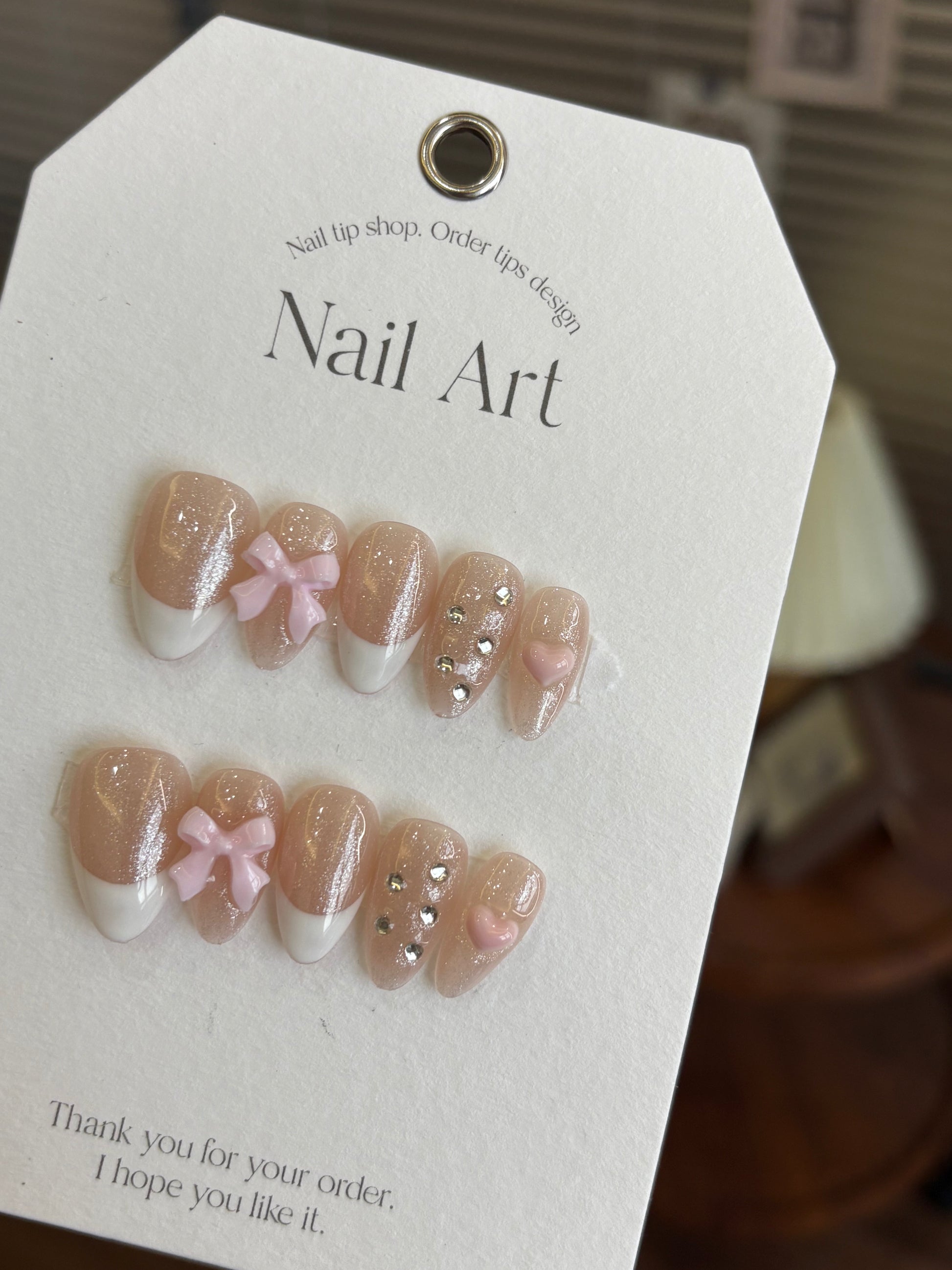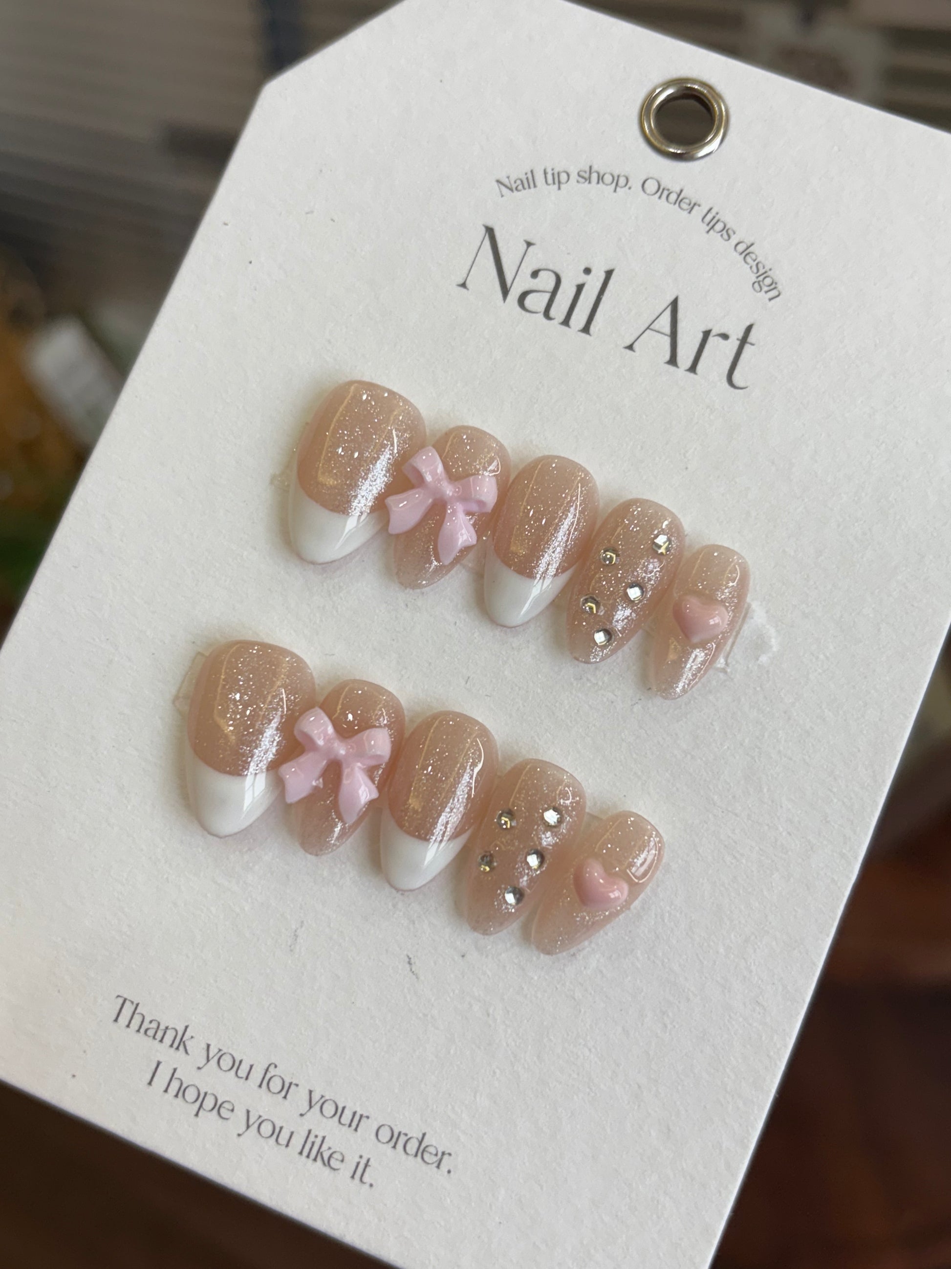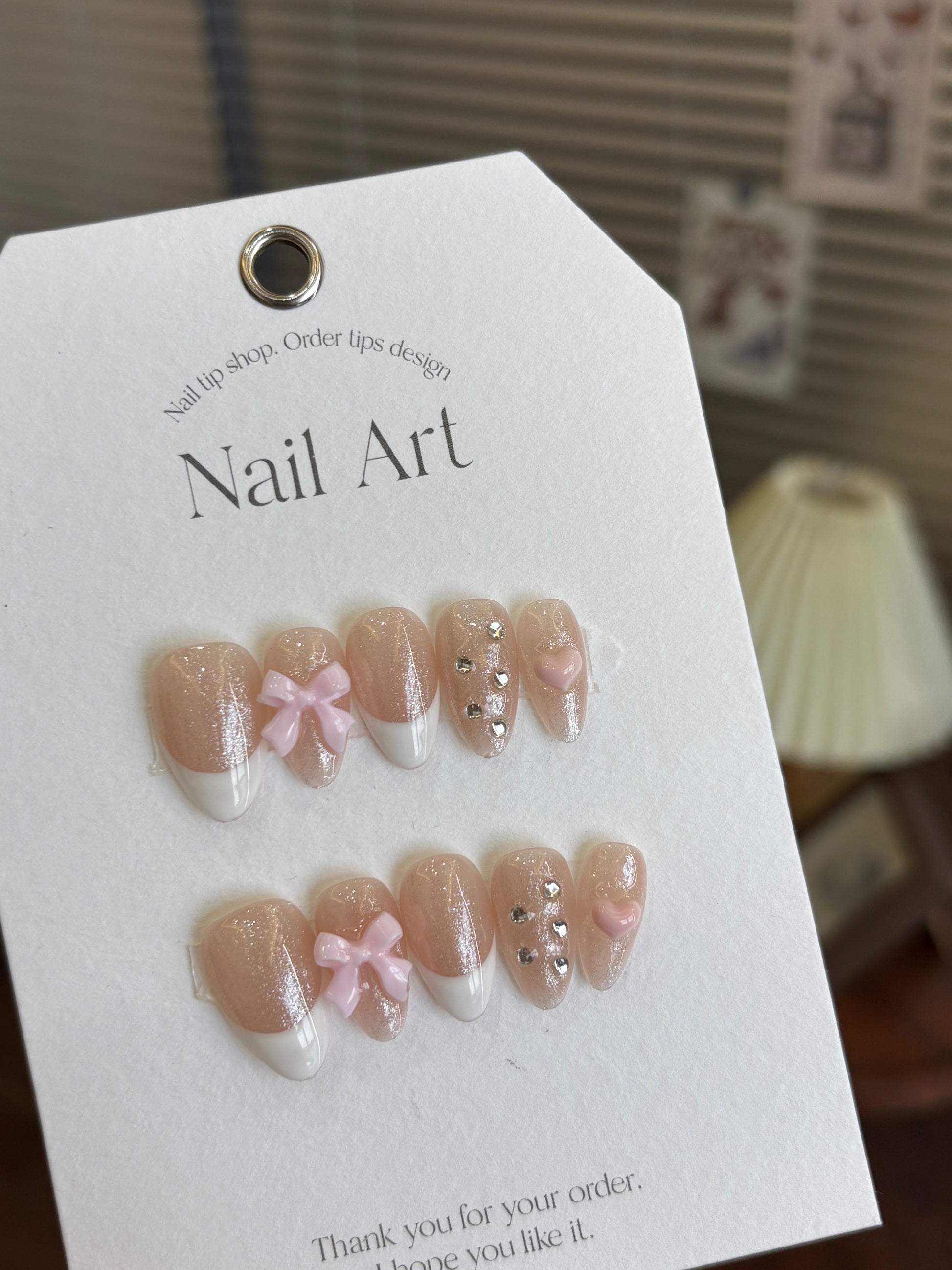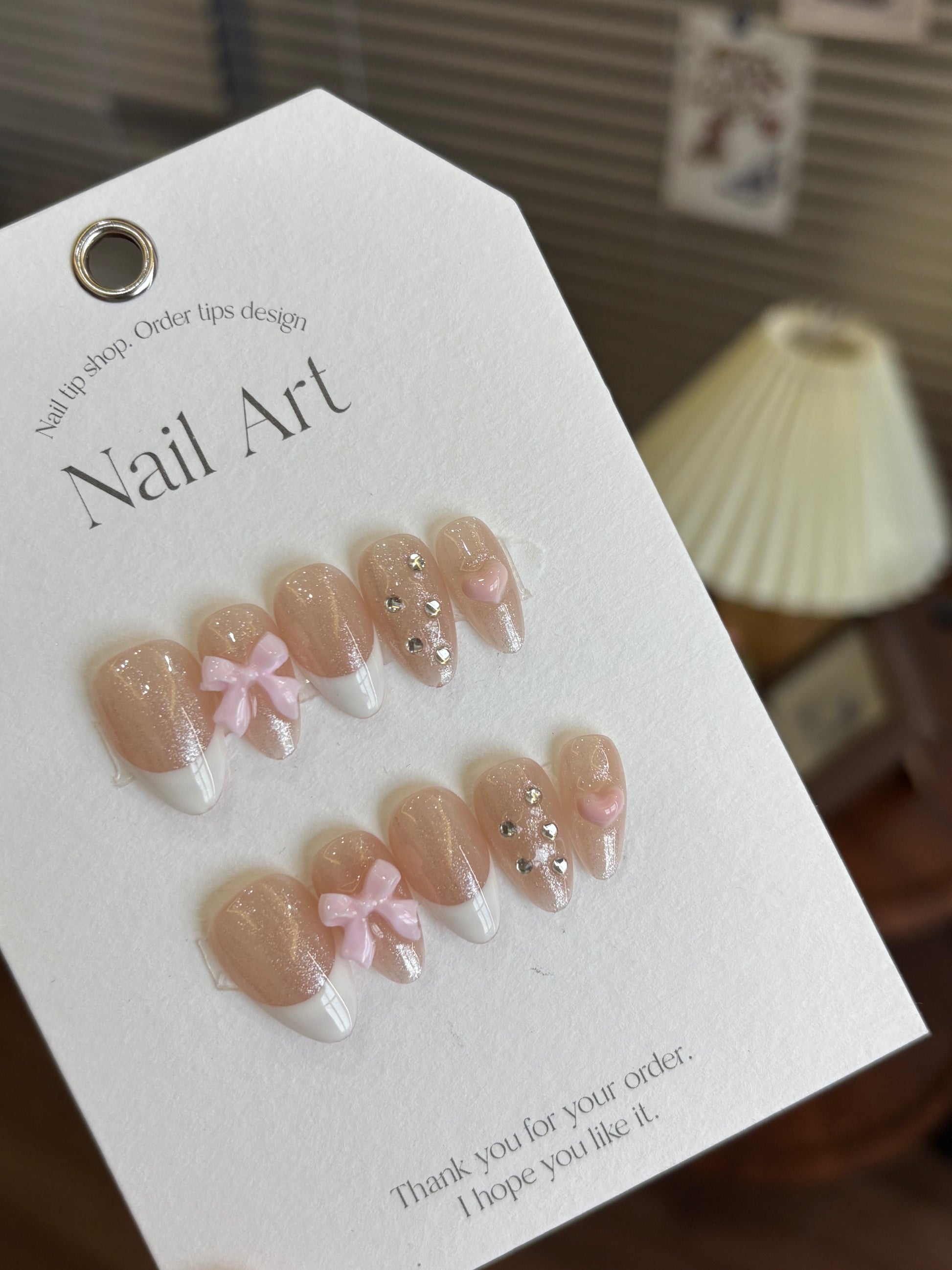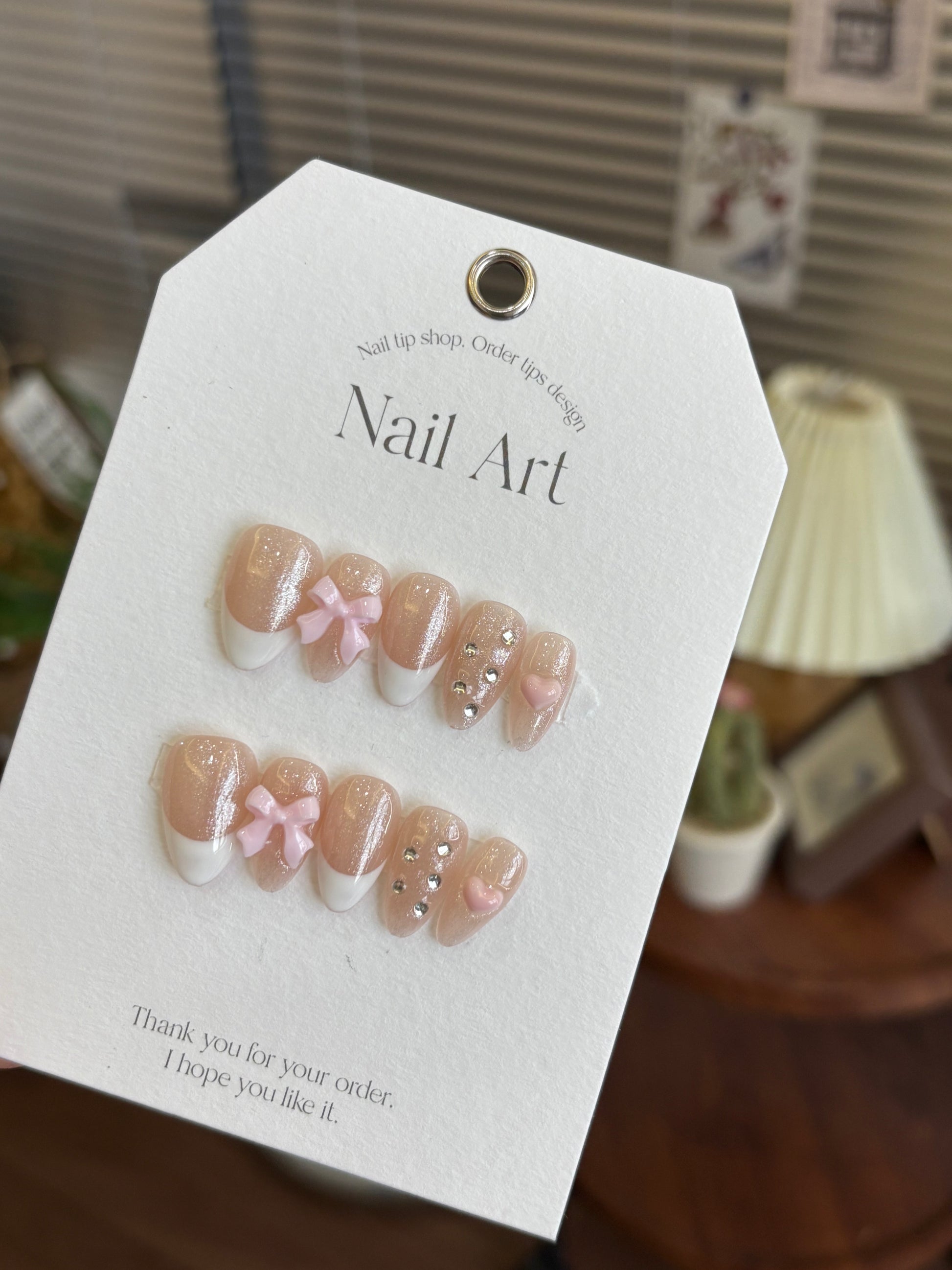 以閃爍裸粉為基底,搭配經典白色法式邊,點綴立體粉色蝴蝶結、甜美愛心與小巧亮鑽。華麗與可愛兼具,讓整體造型多了一份俏皮感。