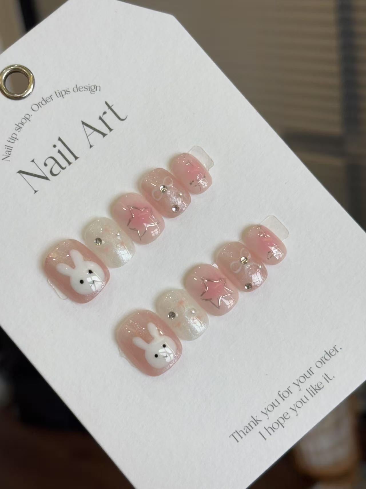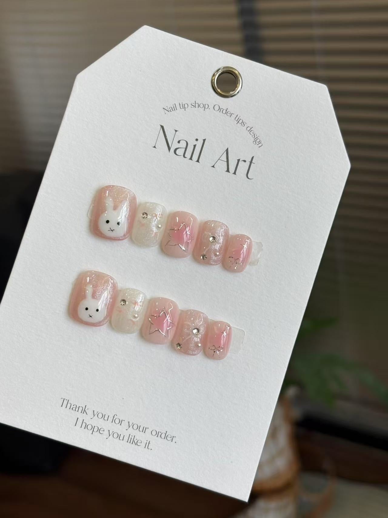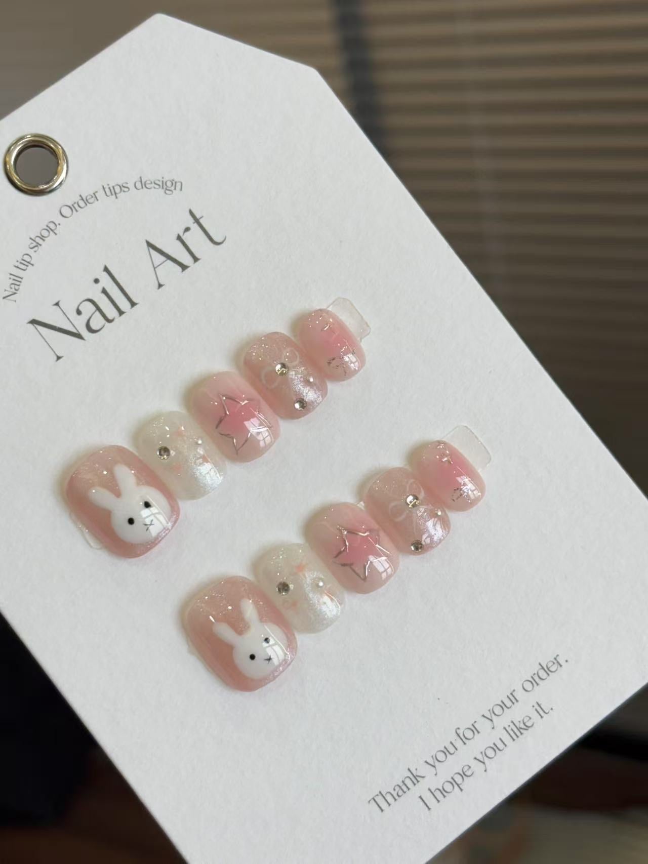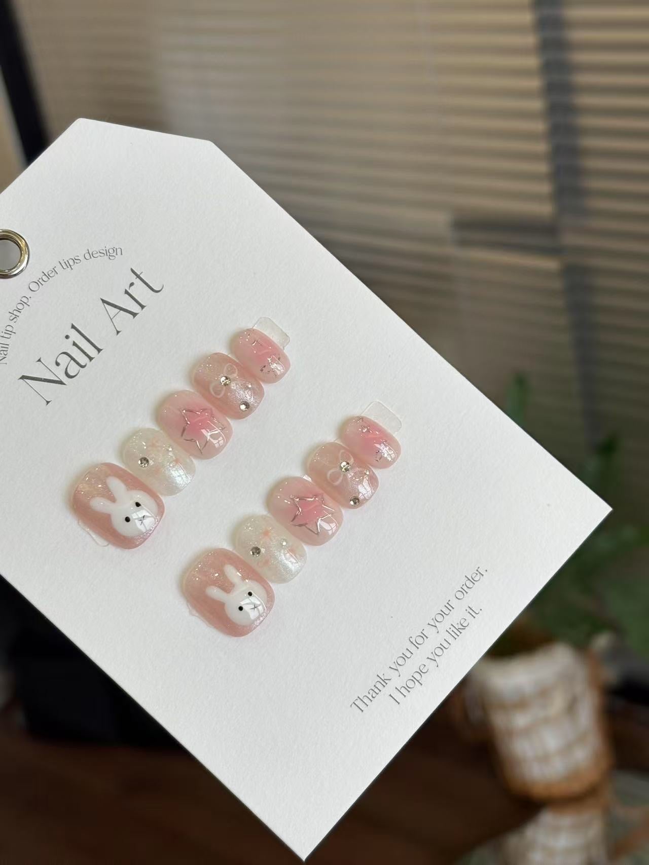 夢幻粉色漸層結合閃亮珠光,點綴可愛兔兔圖案、立體星星與小鑽,