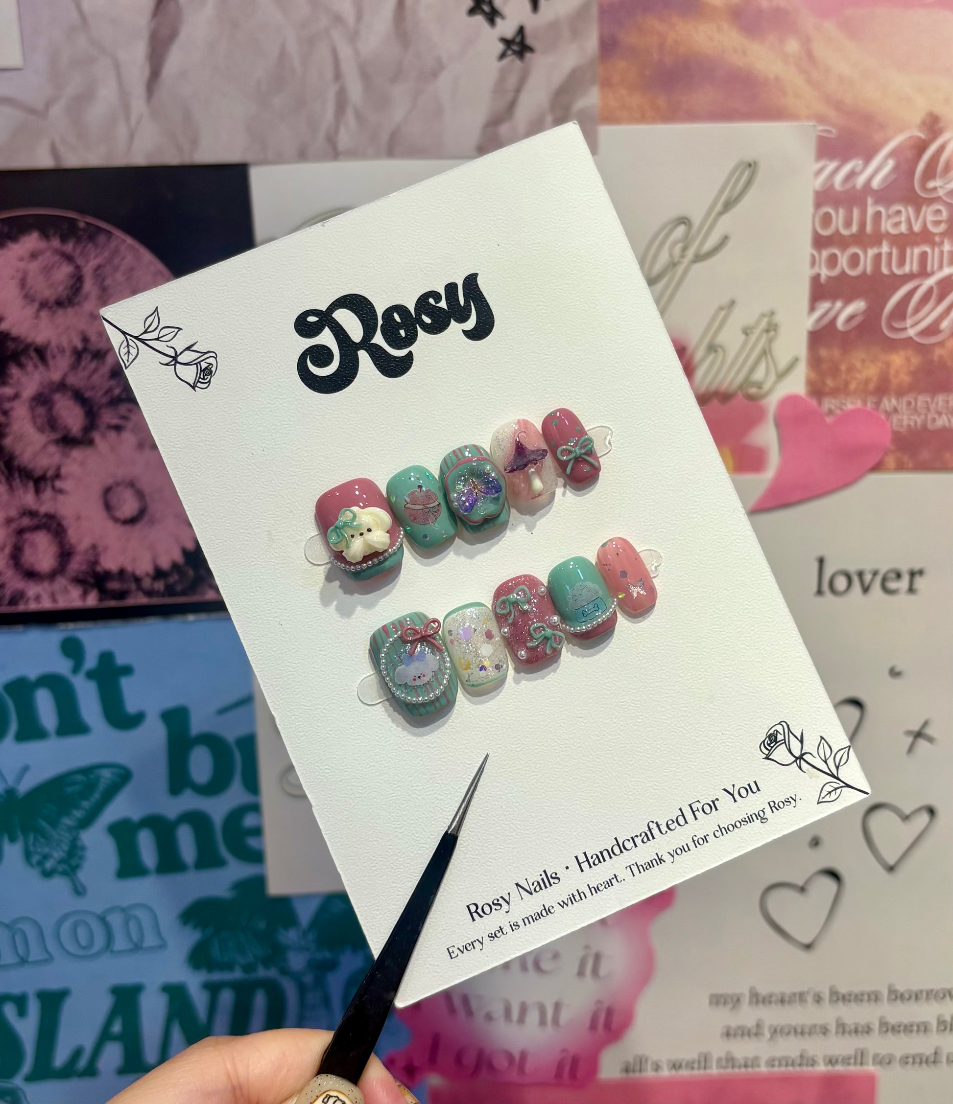 描述|Description:甜美薄荷綠與玫瑰粉交錯的夢幻配色,點綴立體蝴蝶結、珍珠與可愛小熊,宛如走進童話糖果屋。閃亮的蝴蝶與小蘑菇元素增添魔法氣息,每一隻手指都充滿故事感,讓人一見傾心。💖