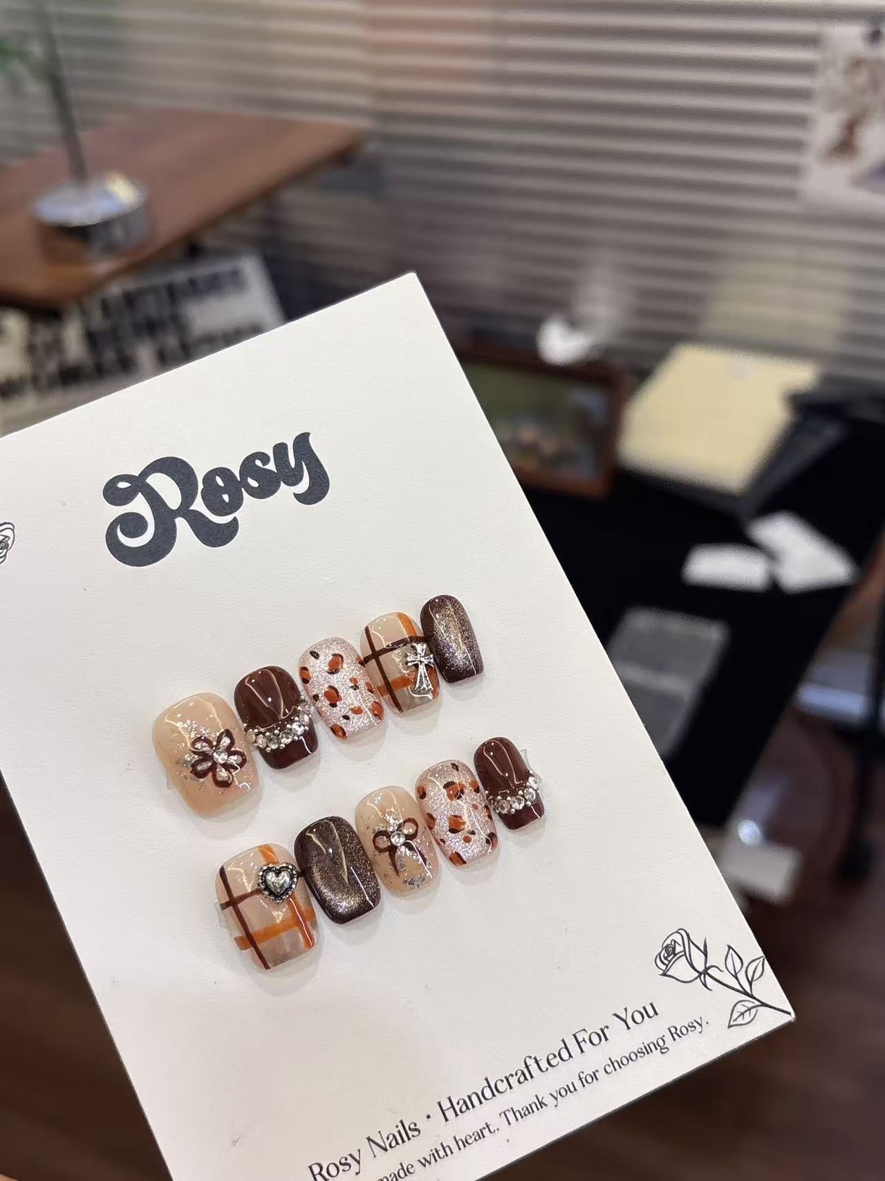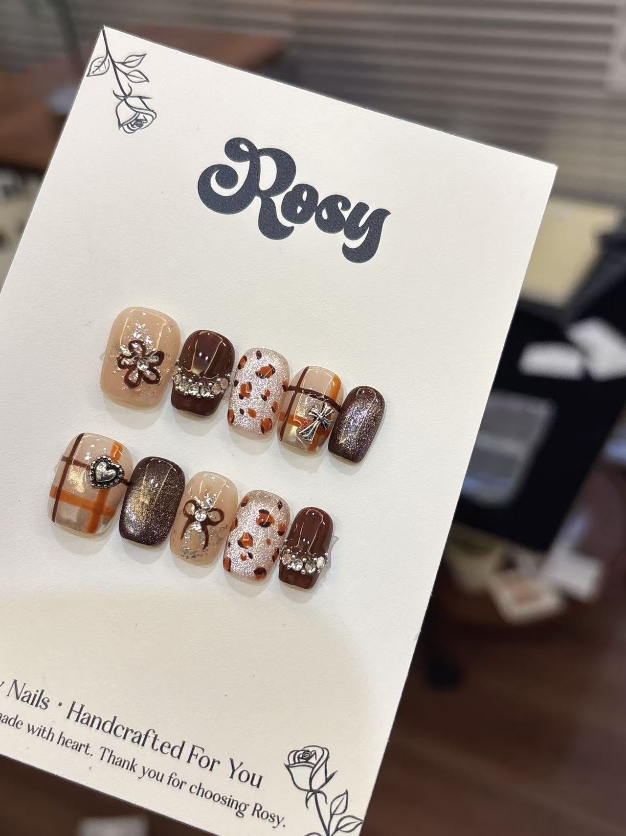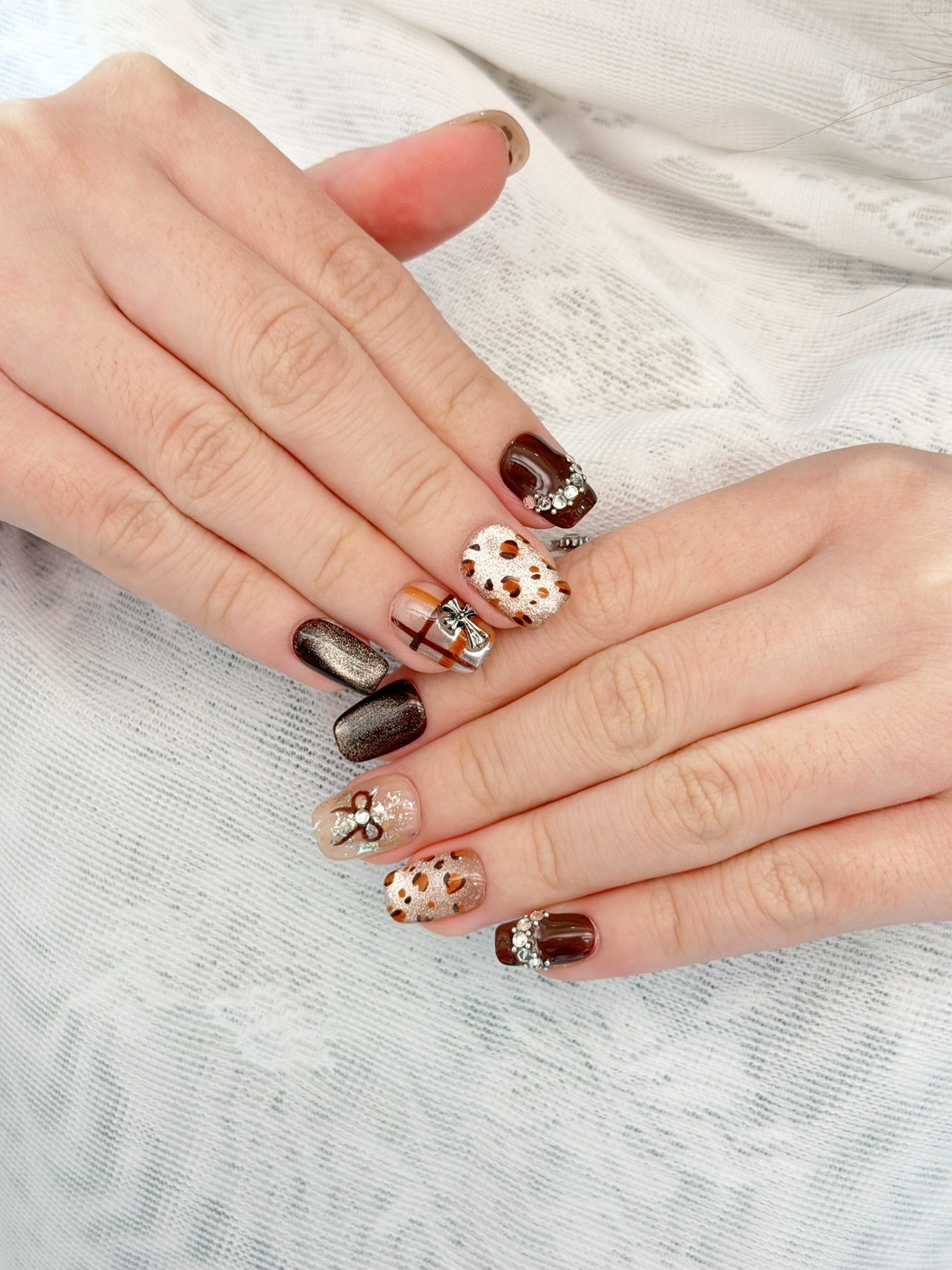 結合焦糖豹紋與格紋設計,搭配閃爍水鑽與立體蝴蝶結✨,