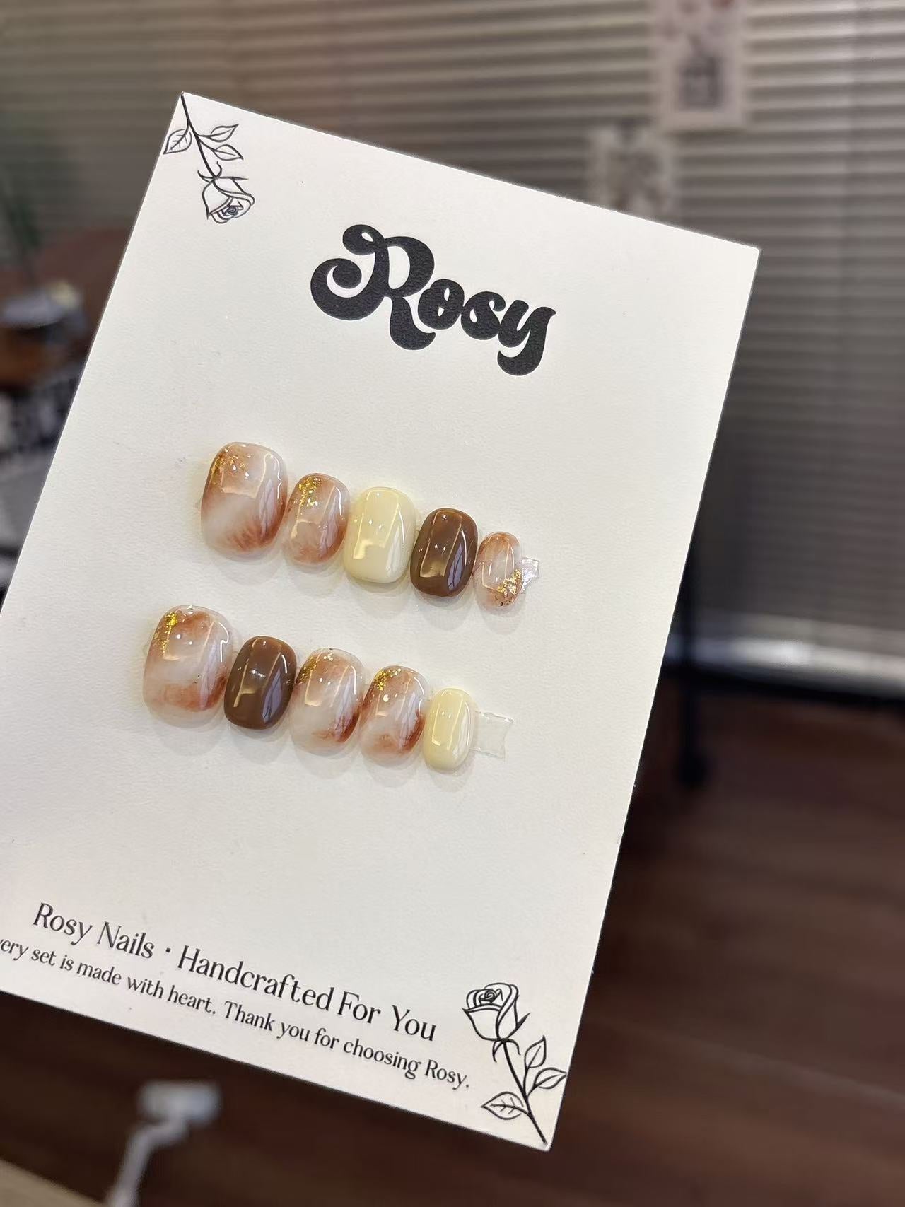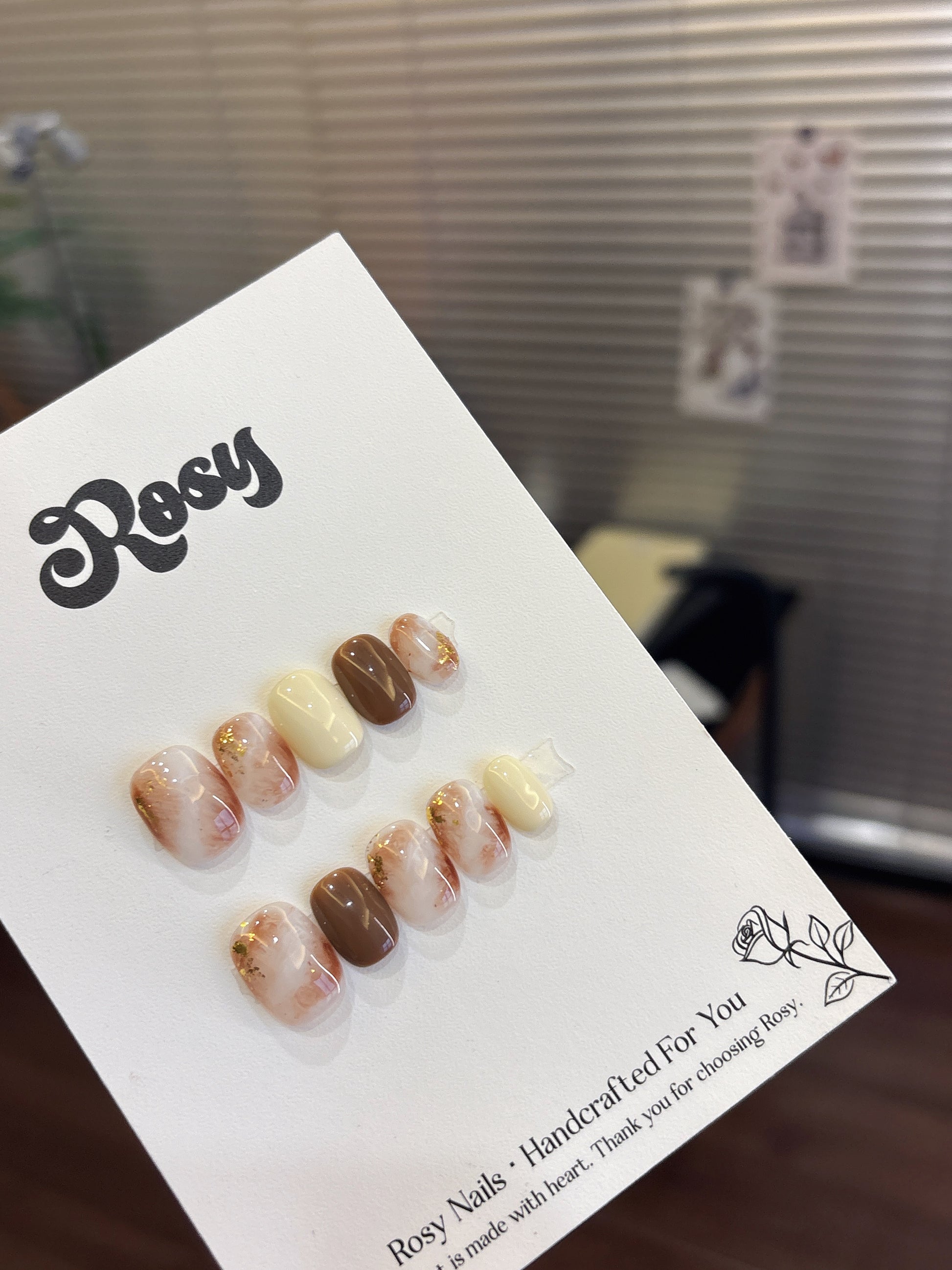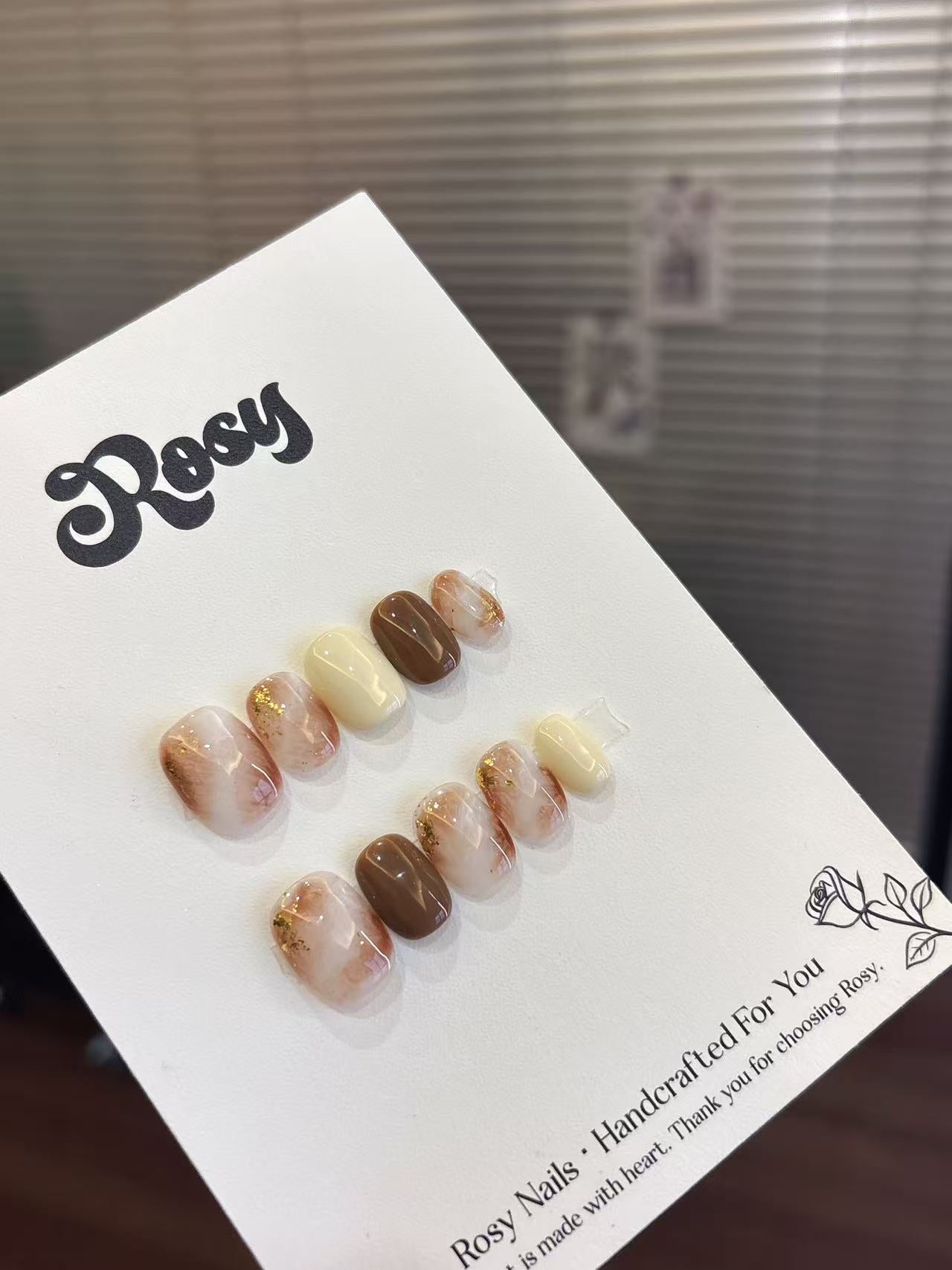 ☕️ 焦糖奶泡 · Caramel Foam 描述|Description:以柔和奶白與焦糖啡暈染為主調,點綴細碎金箔✨,如咖啡上浮的奶泡般柔滑細膩,散發溫暖氣息。甜而不膩的色感,完美演繹秋冬的柔和溫度🤎。 特點|Features: 奶白×焦糖色暈染,溫柔又顯白 ☁️ 加入金箔亮點,細節滿滿 ✨ 適合溫柔系、文青系、上班族造型 💅🏻 秋冬限定色調,百搭耐看 🍮