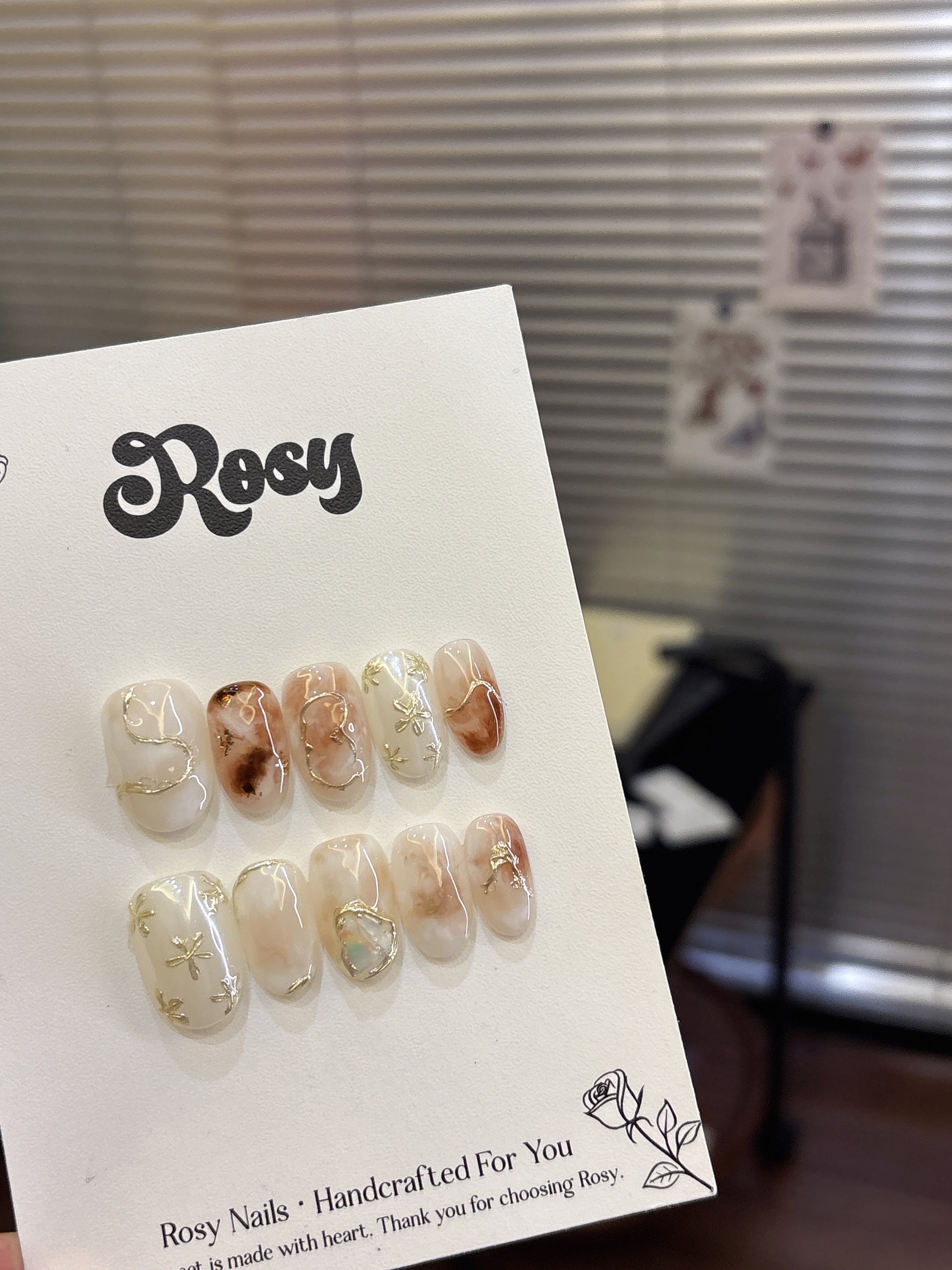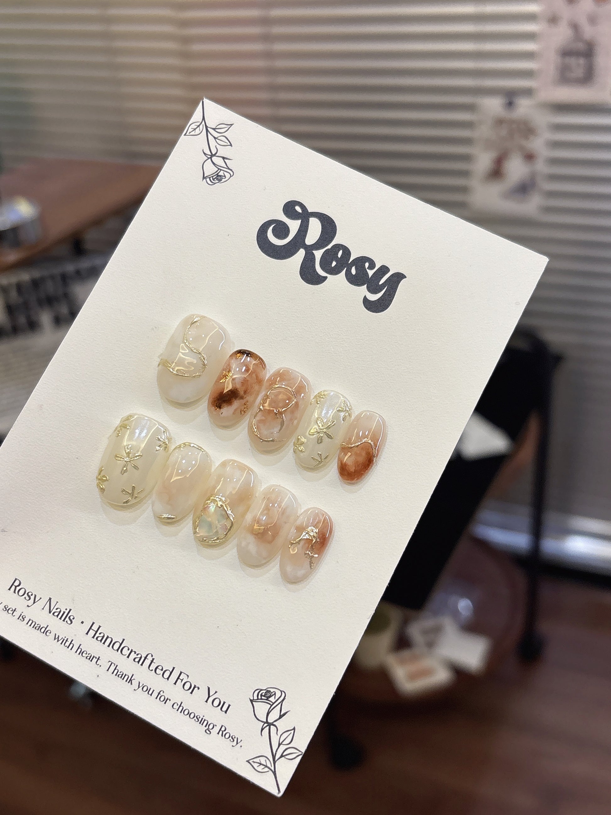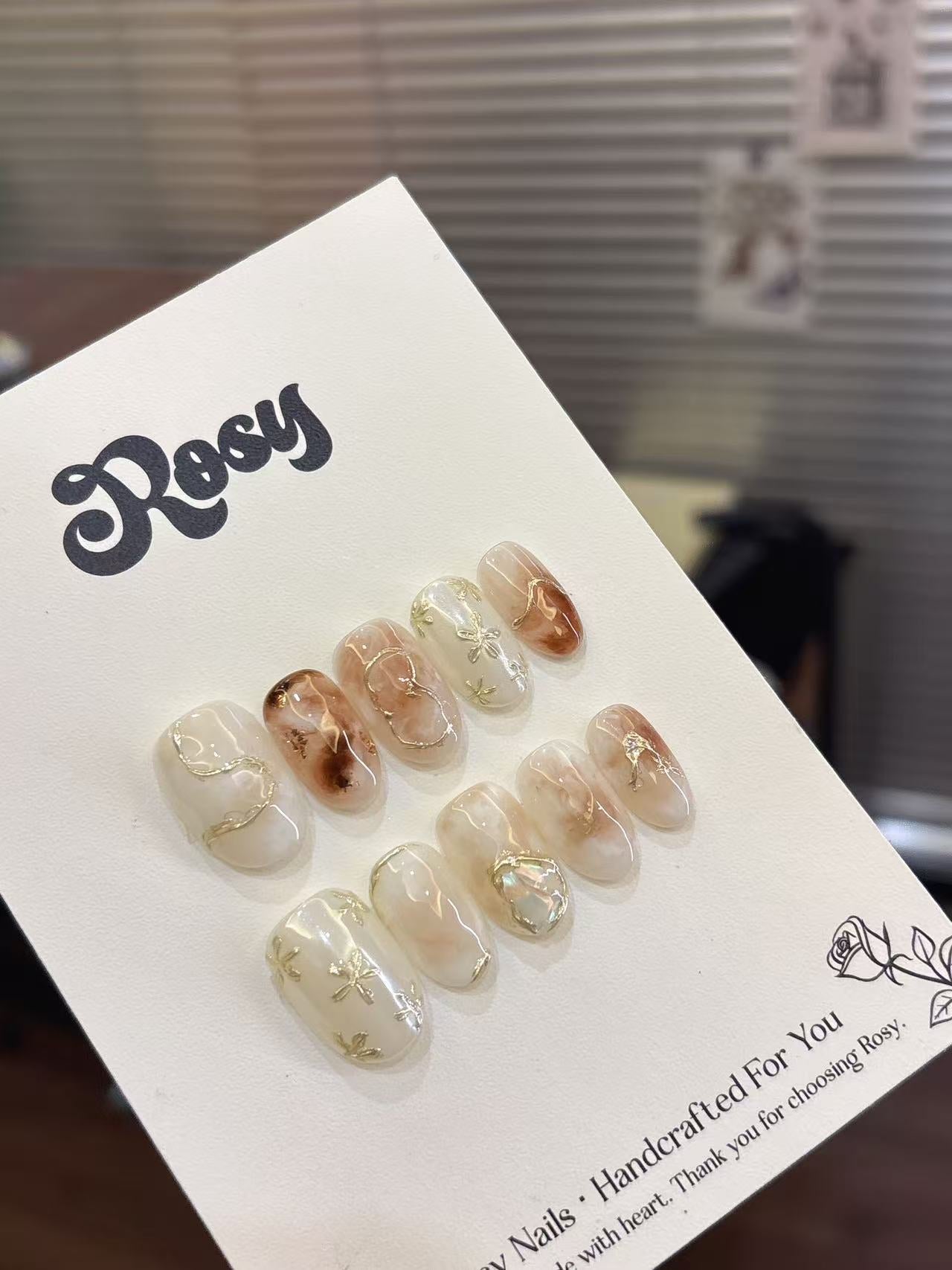 ☕ 奶霧焦糖琥珀 · Caramel Mist 描述|Description:以奶霧白為底,暈染出柔和焦糖與琥珀色調,輕描金線與立體花紋點綴✨,就像陽光灑落在奶咖上的微光☀️。氣質溫柔又不失高貴質感,是秋冬最百搭的溫柔系美甲之一🤎。 特點|Features: 奶霧暈染效果柔和自然☁️ 金線勾邊與花紋設計提升精緻感💫 焦糖琥珀色系顯白又高級🍯 適合日常穿搭或氣質OL風✨