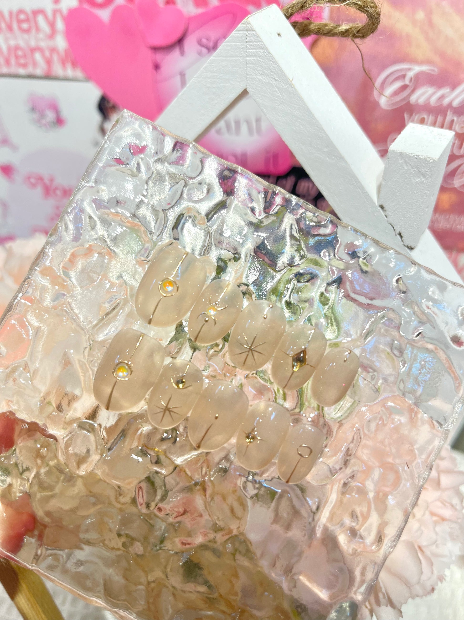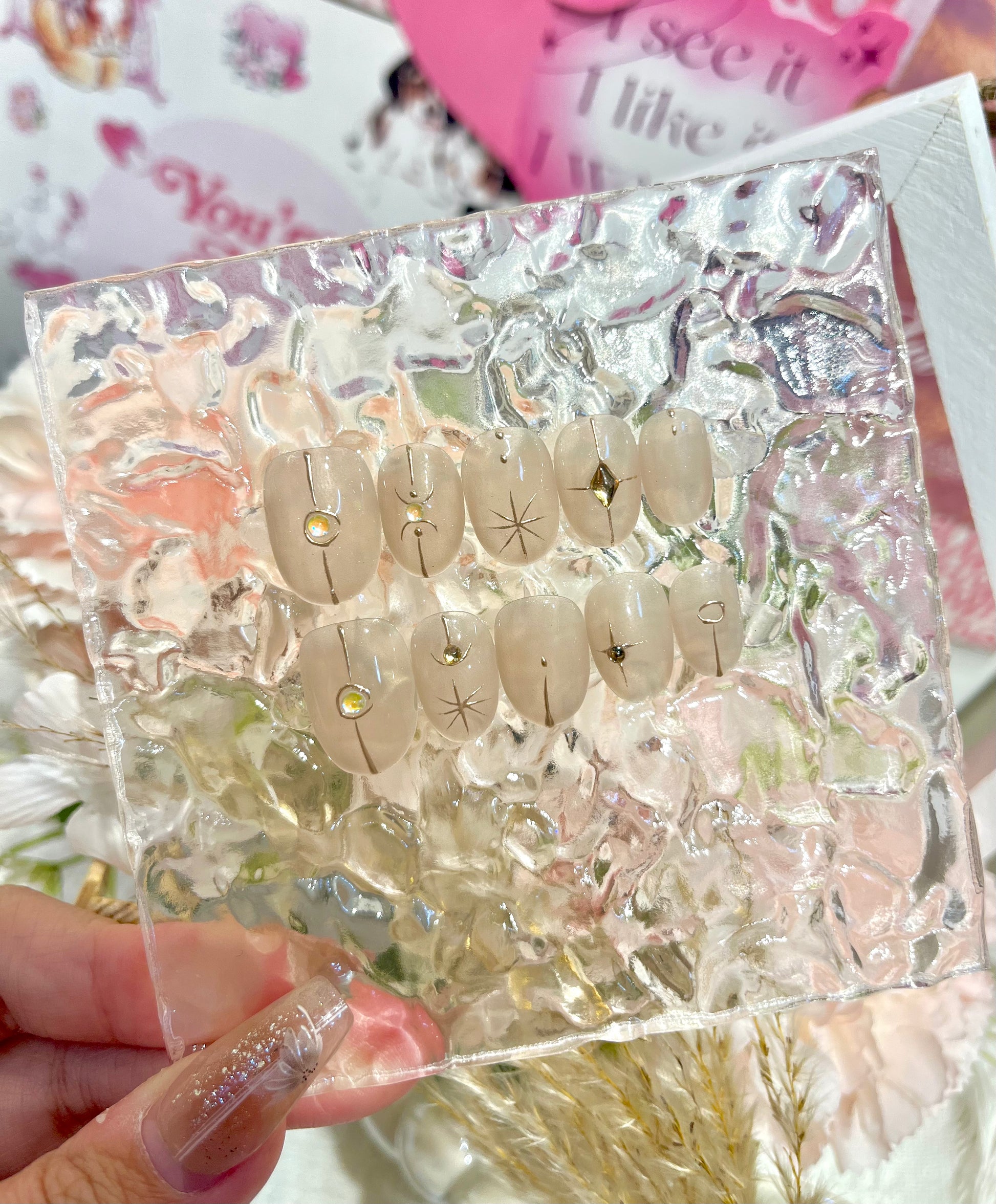 🌙《Celestial Nude》選用霧感裸膚杏色調為主體,低飽和色系帶出沉靜氣質,配上極細金屬直線設計與星芒刻紋、水鑽點綴,彷彿是夜空中行星軌跡與閃爍星點的結合。乾淨俐落又不失精緻細節,是一款兼具都會感與神秘氣息的極簡星空風穿戴甲,非常適合文青系、簡約控、氣質派女孩。🌙