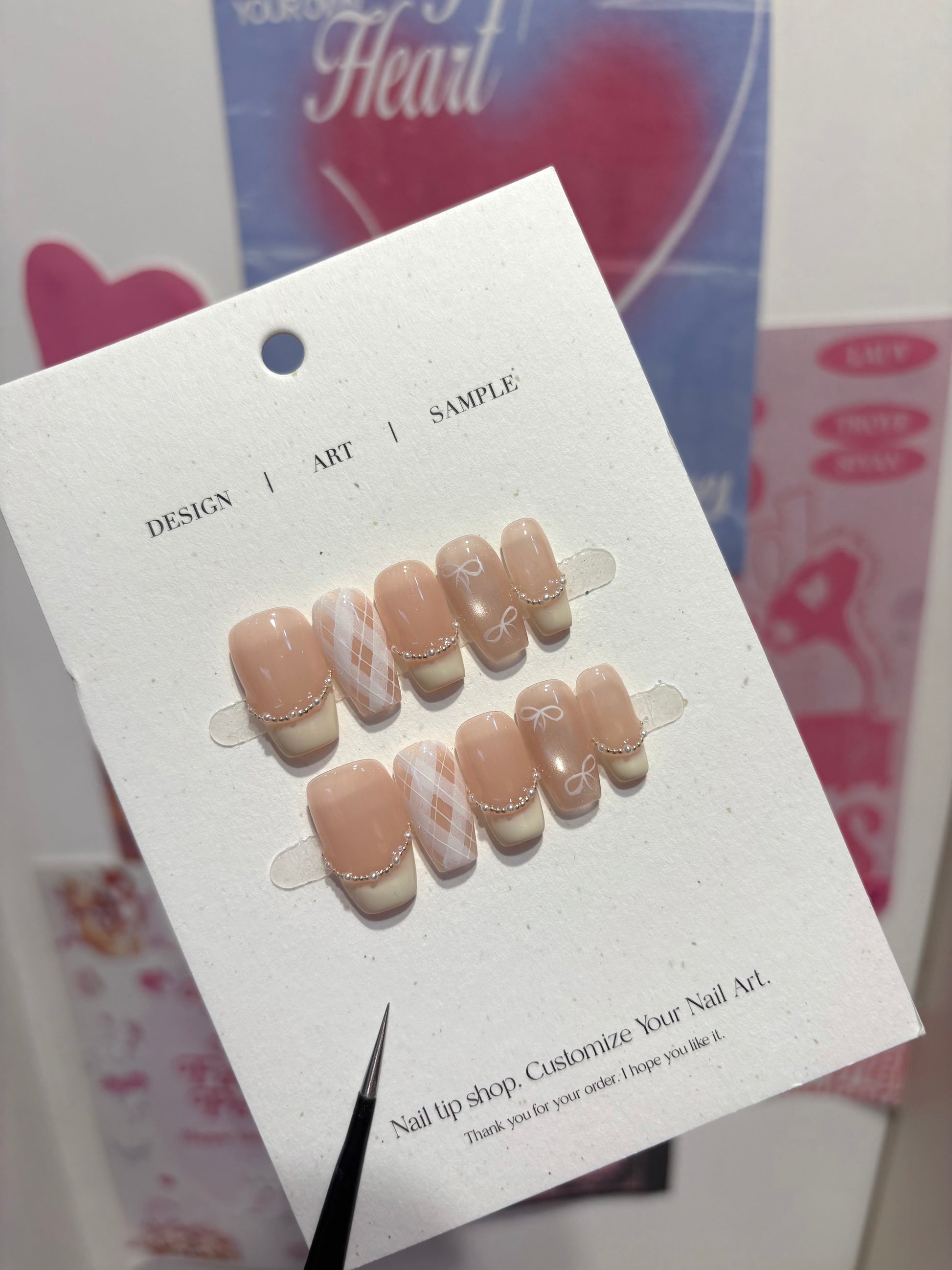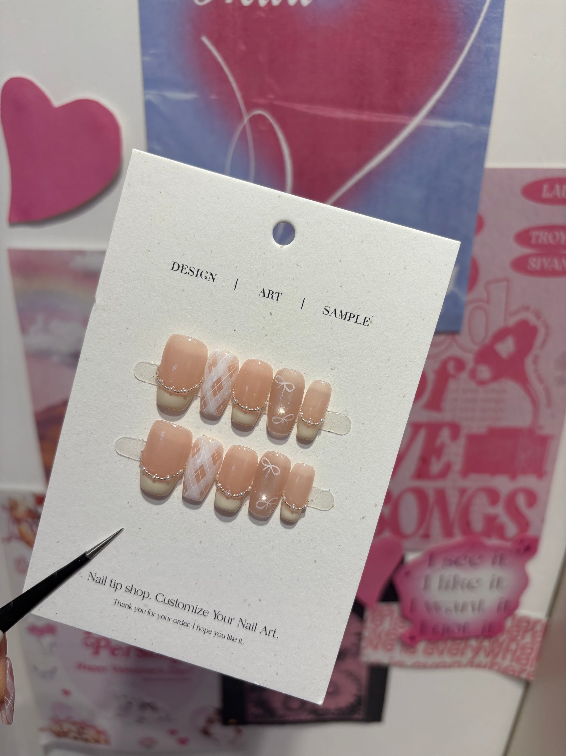 溫柔奶杏色為主調,搭配復古菱格紋與手繪蝴蝶結點綴,細緻的珍珠鏈條勾勒出優雅曲線,整體洋溢濃濃日系學院感。像是一杯奶油焦糖拿鐵,甜美卻不膩,氣質滿分💫 適合約會、上班或日常小精緻穿搭。