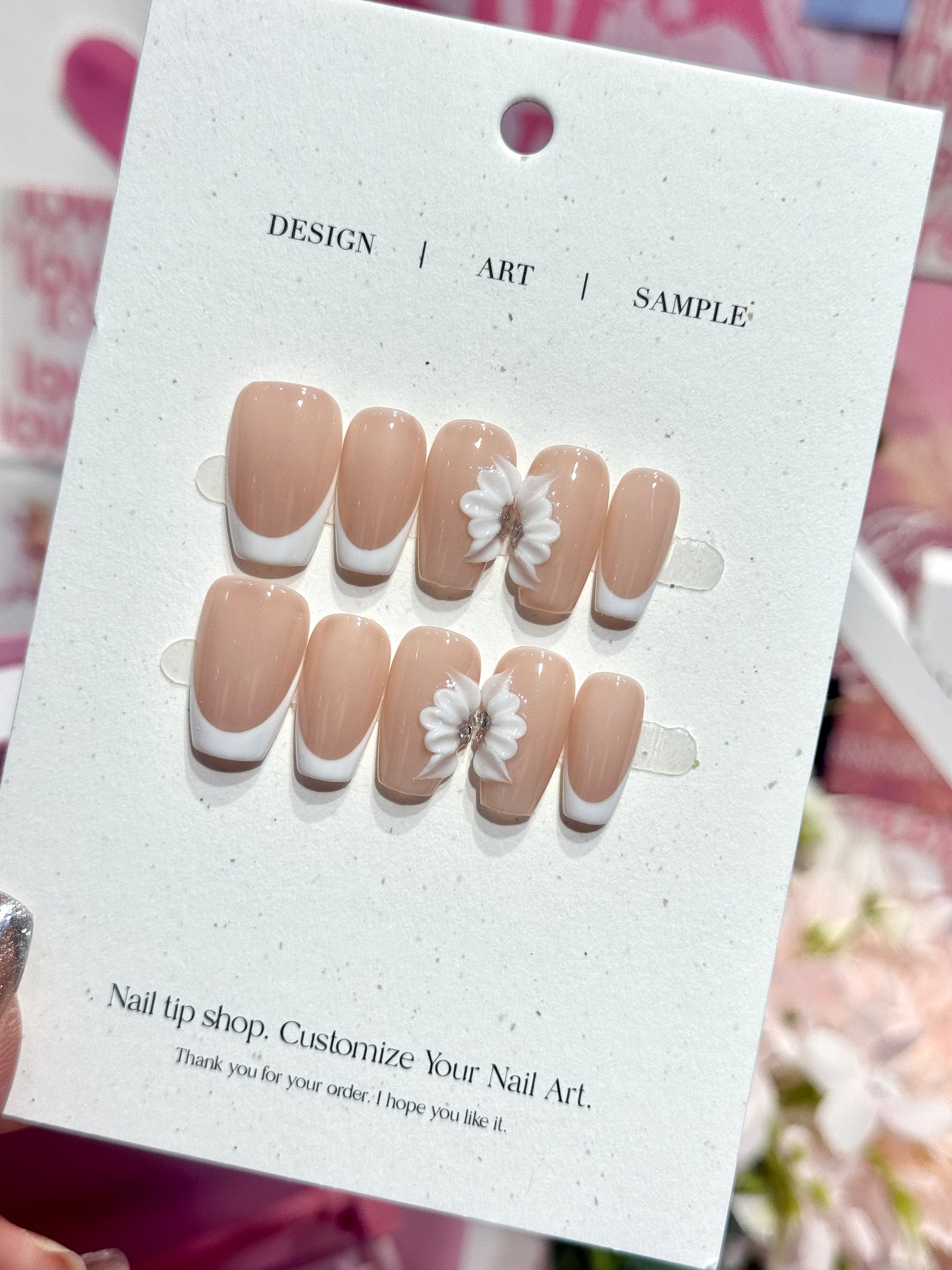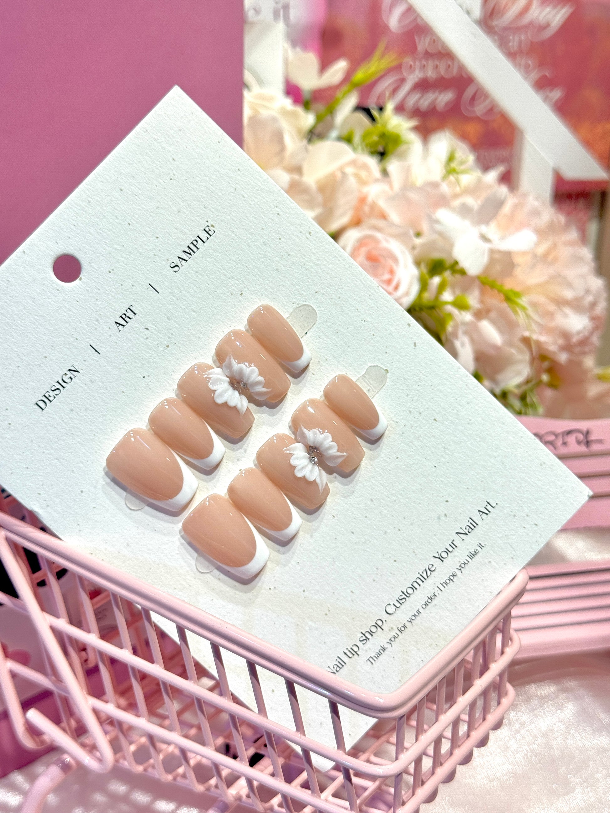 Rosy每副穿戴甲獨一無二,顏色深淺、紋路、飾品大小皆有少許差異經典裸粉法式設計,搭配立體白色雛菊花朵,指尖綻放自然純淨的優雅氣息。每一片花瓣皆如雕塑般細緻,點綴閃鑽更添精緻感,適合喜歡溫柔清新風格的你 🌼✨ 無論是日常還是特別場合都散發脫俗魅力。