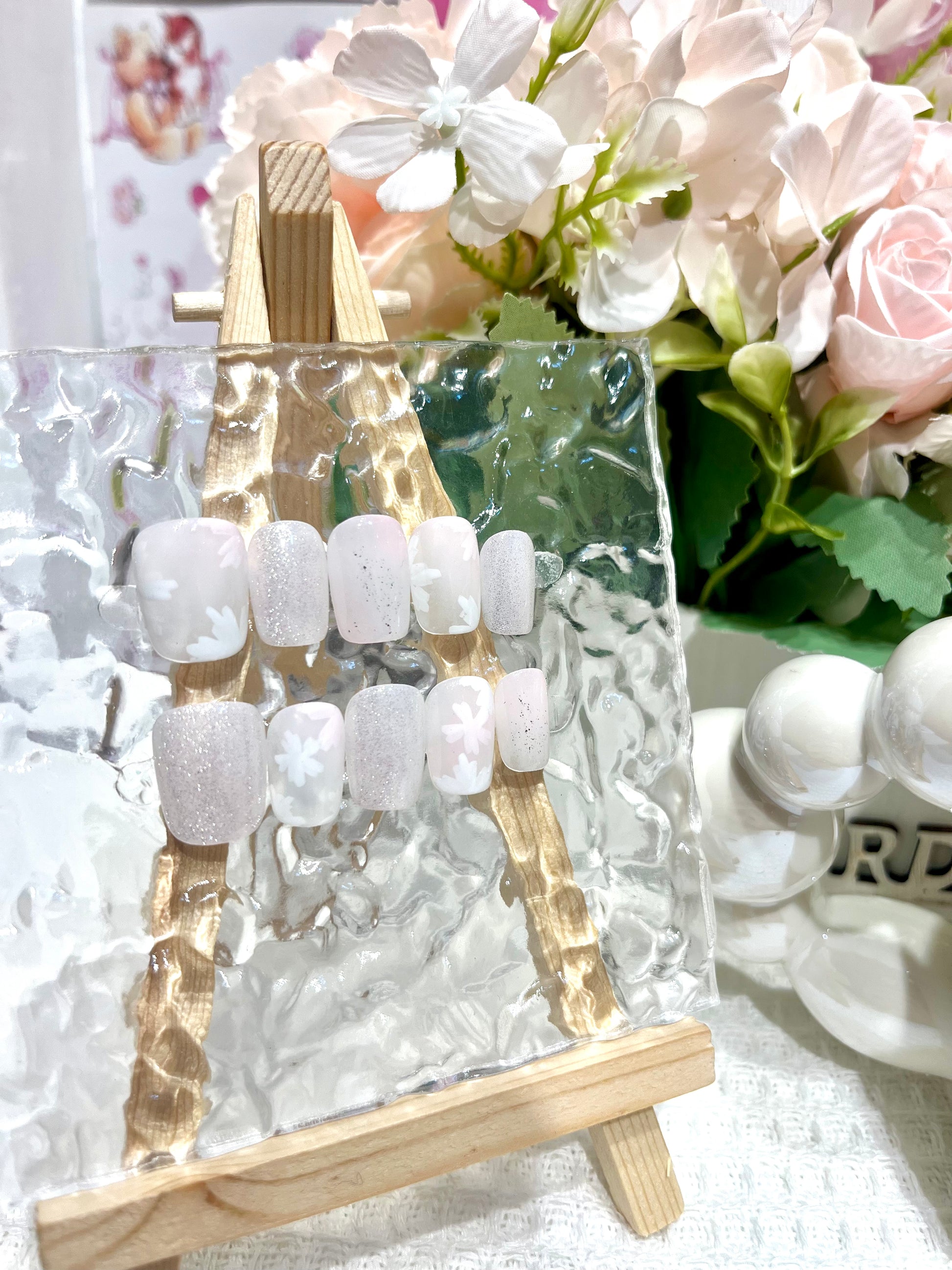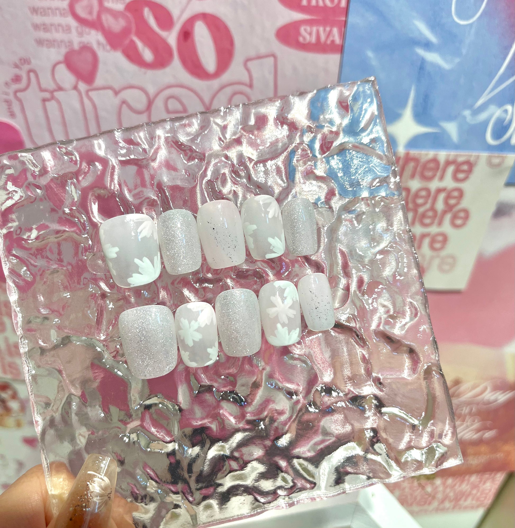 《Dewy Bloom》以柔霧粉白漸變色調為基底,融合低調閃耀的銀閃粉感甲面,並點綴如霧中輕描而成的白色花瓣剪影圖案,整體猶如晨光裡朦朧盛開的花朵,唯美而安靜。這款設計溫柔中帶點純淨氣質,非常適合喜歡低彩度、仙氣系或質感日常風格的你。 🌫️