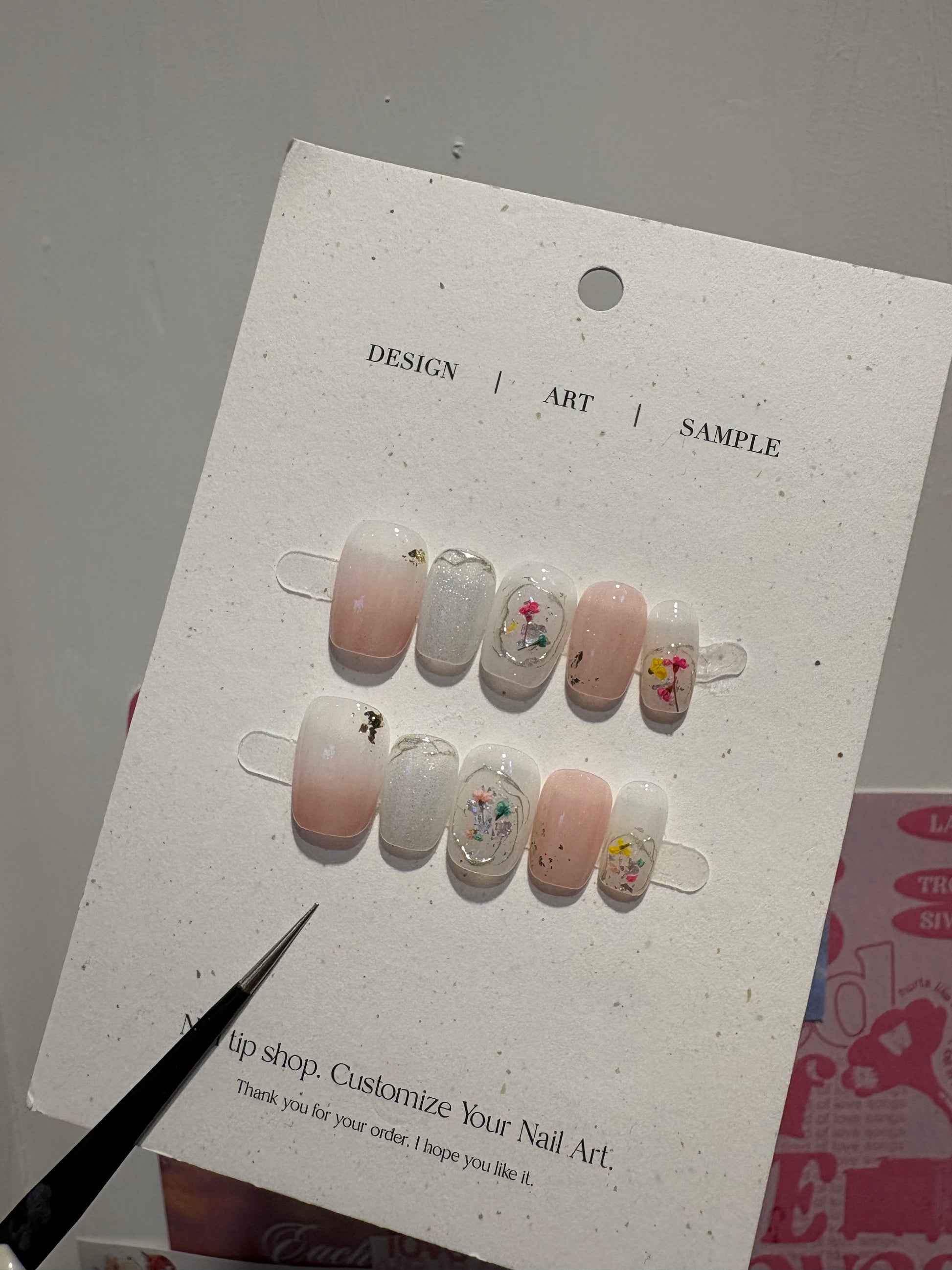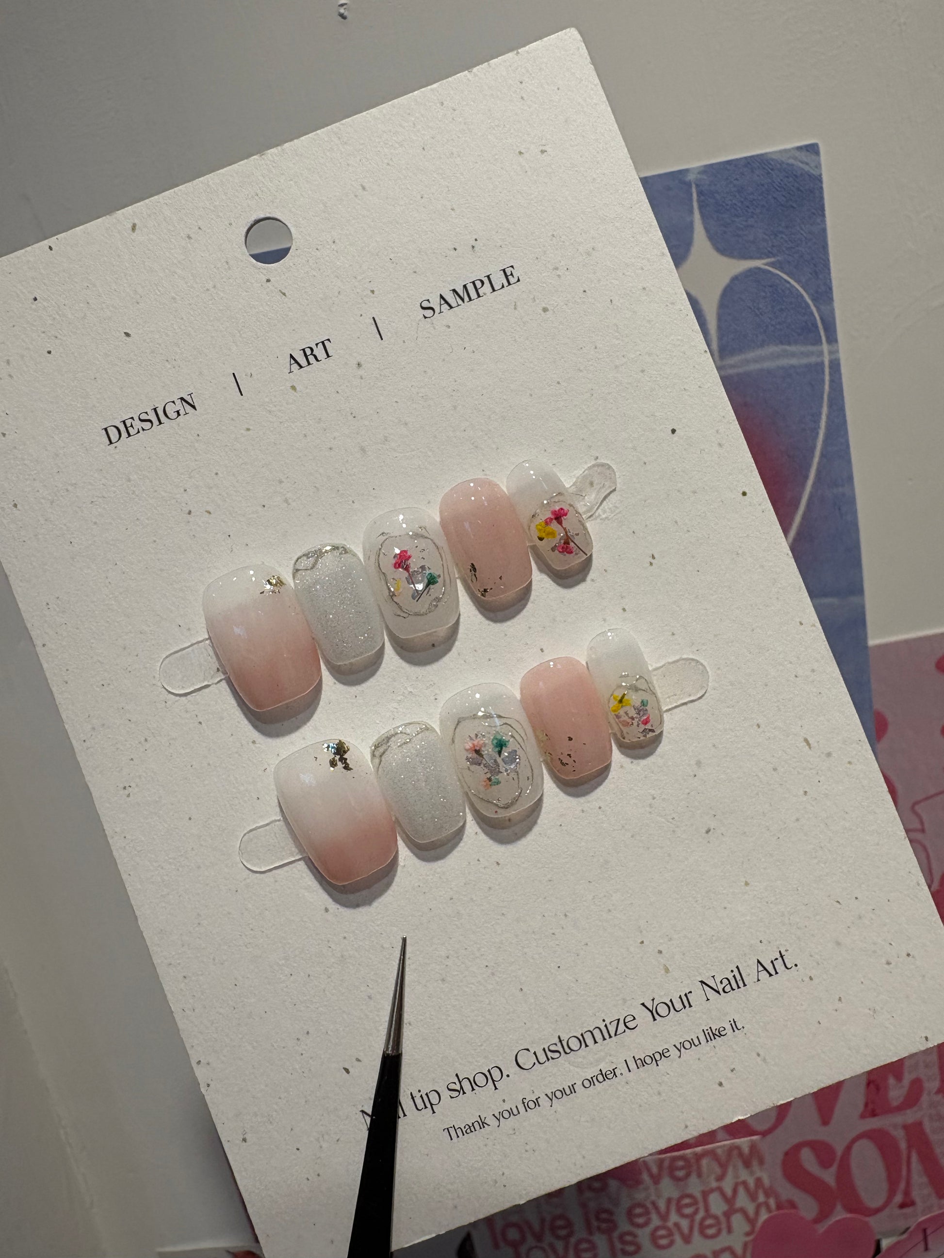 浮花日和 Floating Bloom🌸🫧以柔霧裸粉與白色漸變為基調,融合細緻閃粉與手繪風乾花設計,如午後陽光下飄浮的花影,輕盈浪漫又充滿藝術氣息。特別適合喜歡文藝、自然系穿搭的你,讓每一次揮手都散發詩意美感。🌸🫧