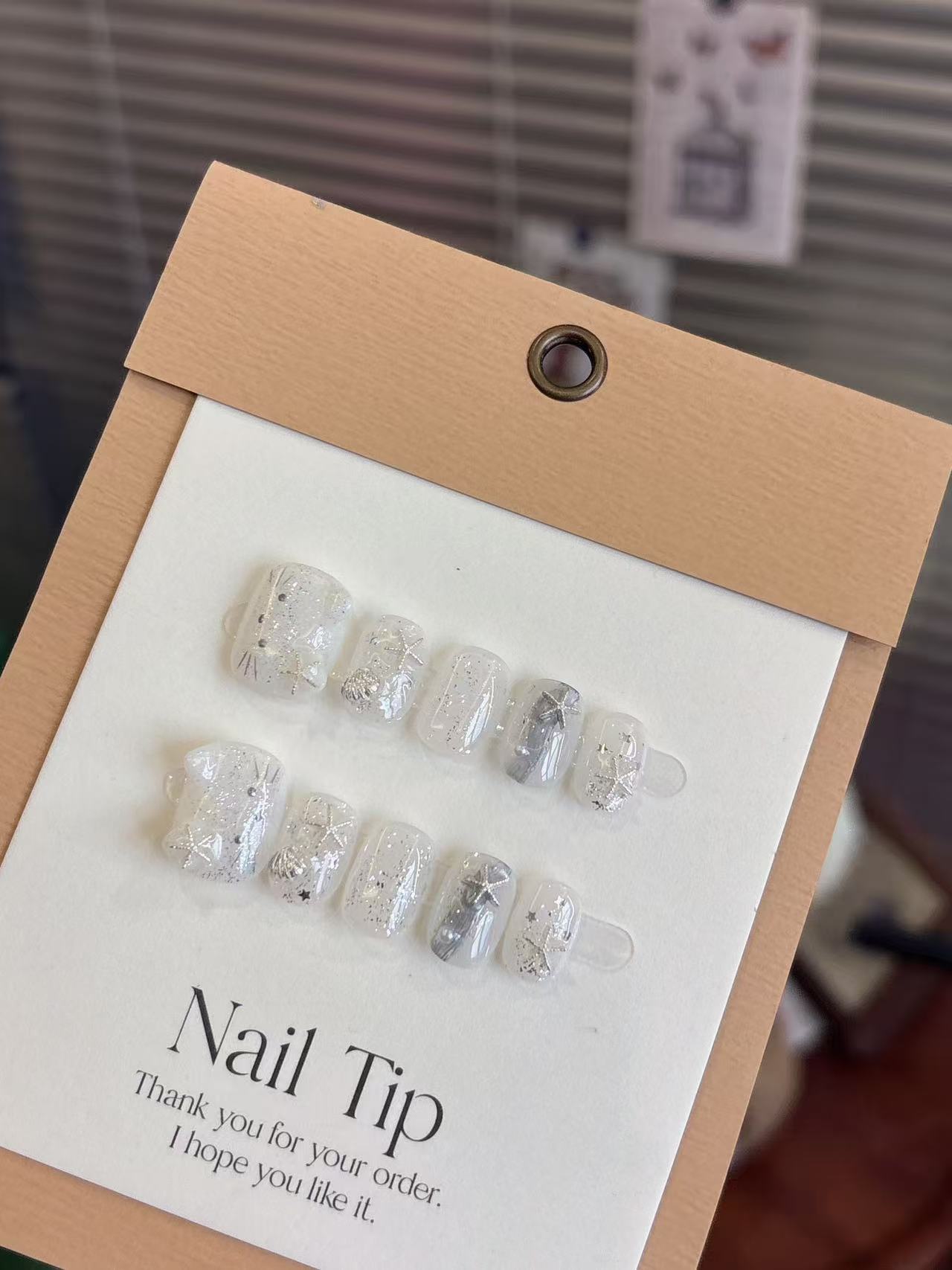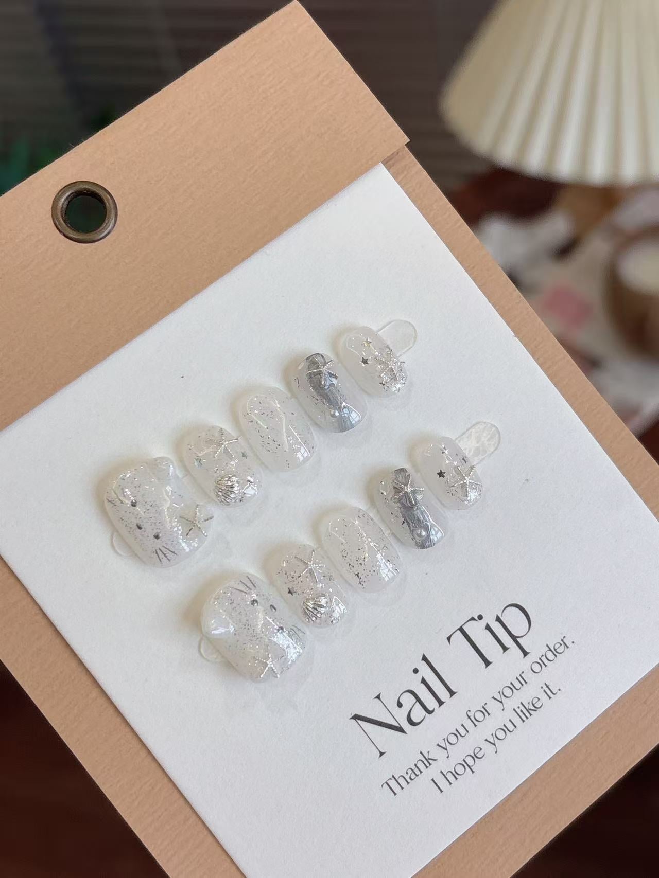 銀河貓貝/Galaxy Cat & Shell描述:以閃爍銀白為基調,點綴星星與貝殼元素,宛如置身銀河海洋。小貓造型與亮片交織,營造浪漫又高級的夢幻氛圍。