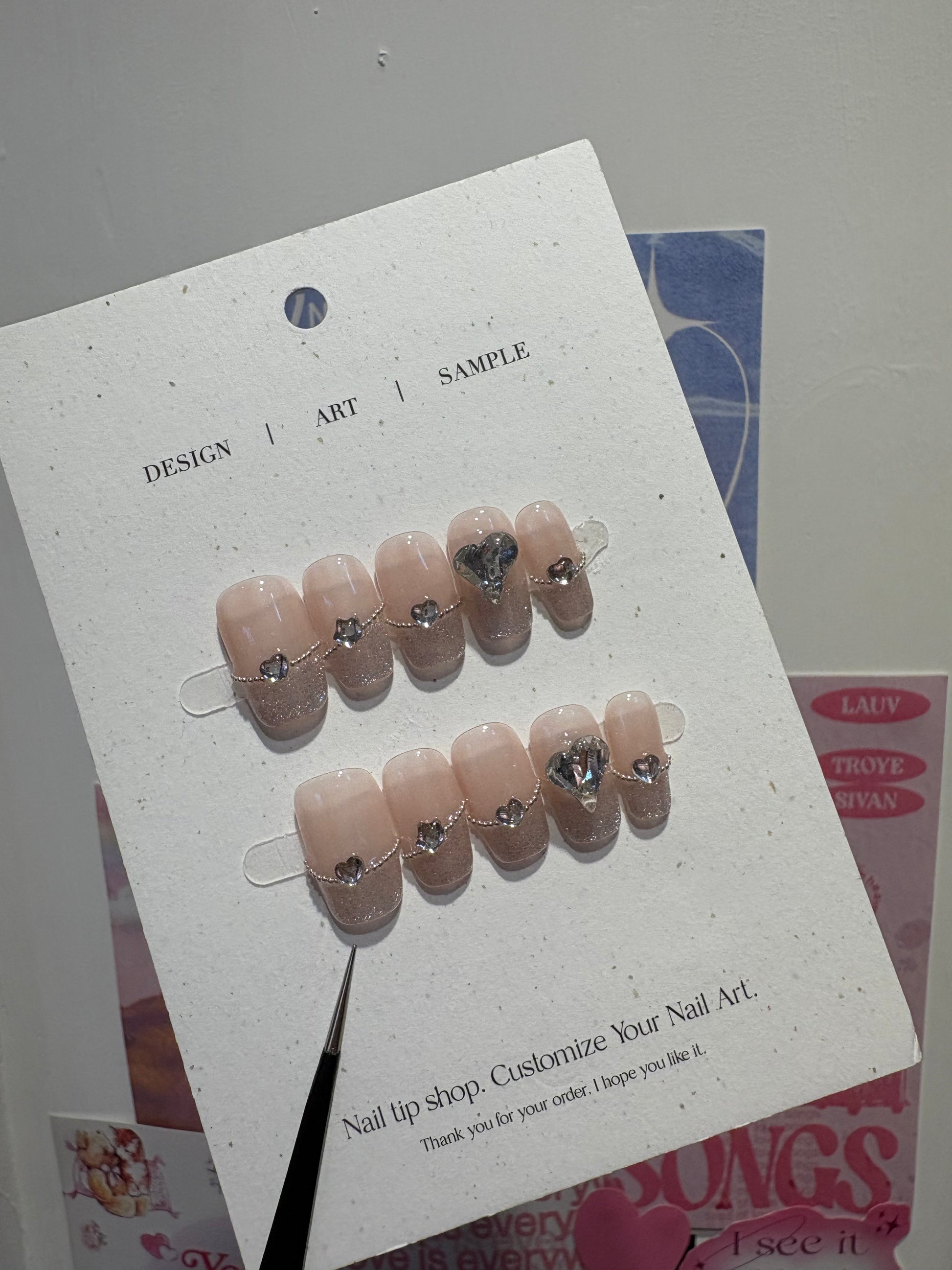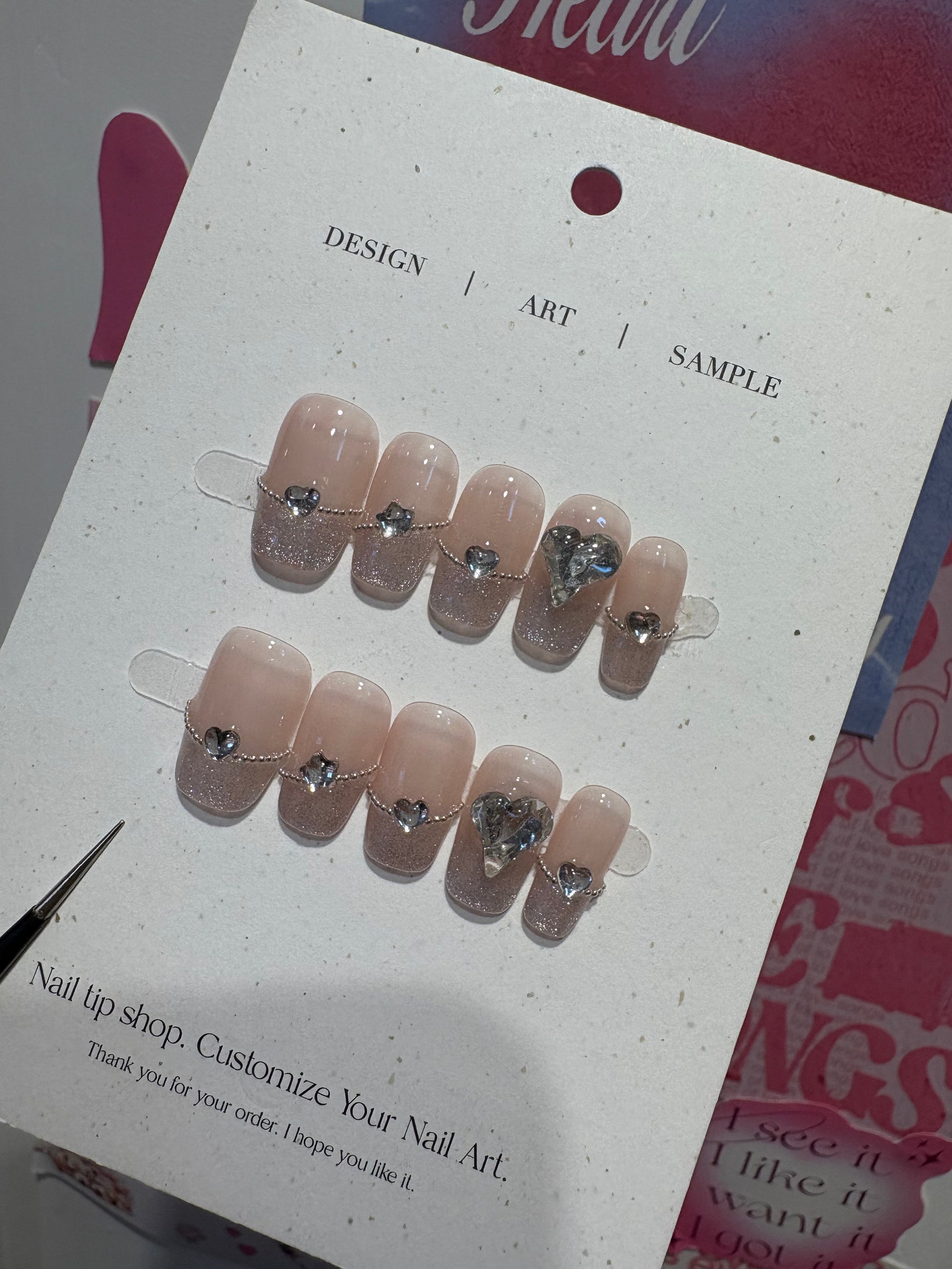 💖✨閃耀戀語 Glimmer Heartbeat💖✨裸粉色漸層搭配細緻銀粉,點綴晶透立體心形水鑽與閃爍金鏈,為指尖增添戀愛般的光芒。高級感與可愛並存,無論約會還是日常都能提升整體氛圍感💖✨