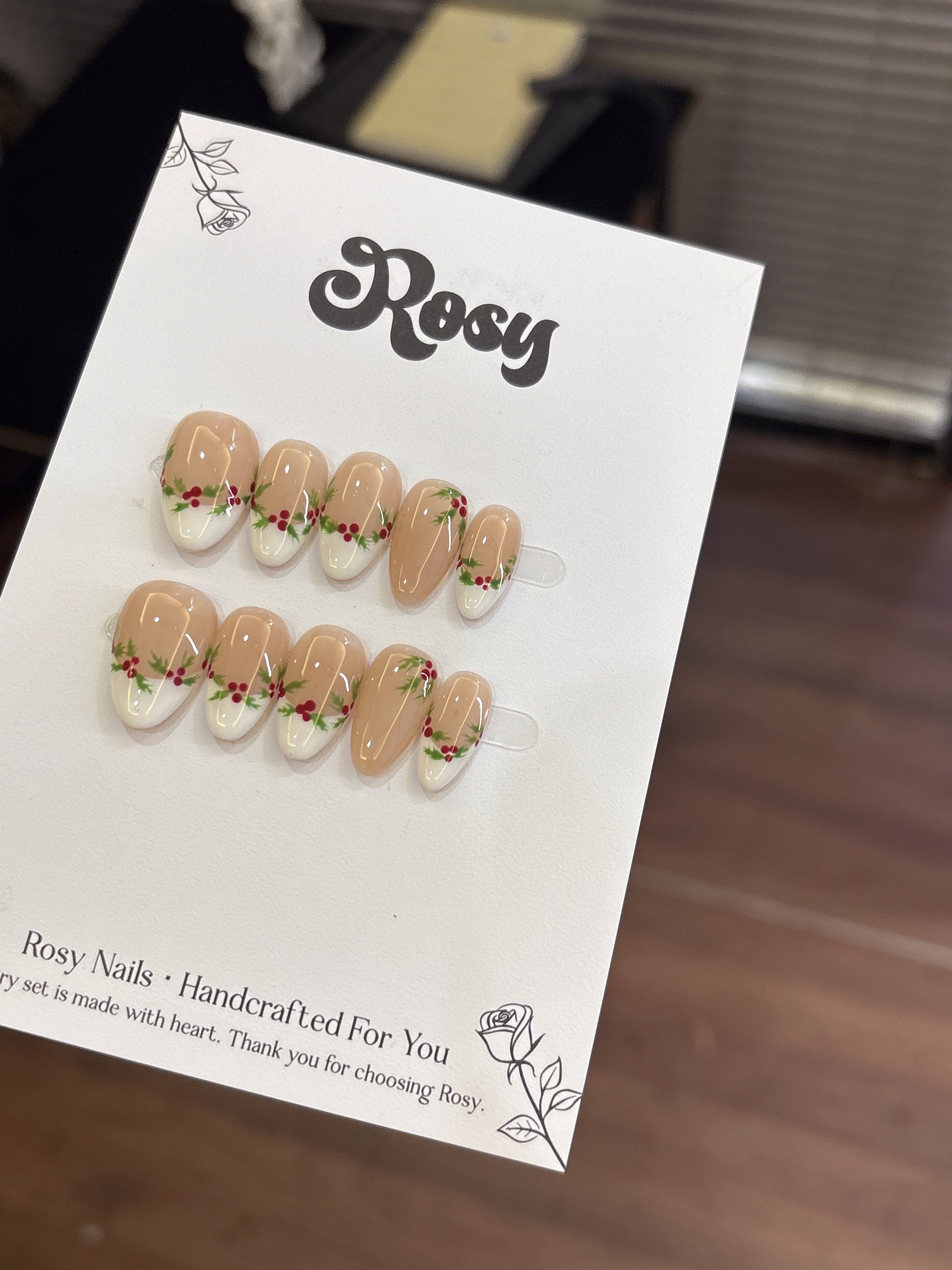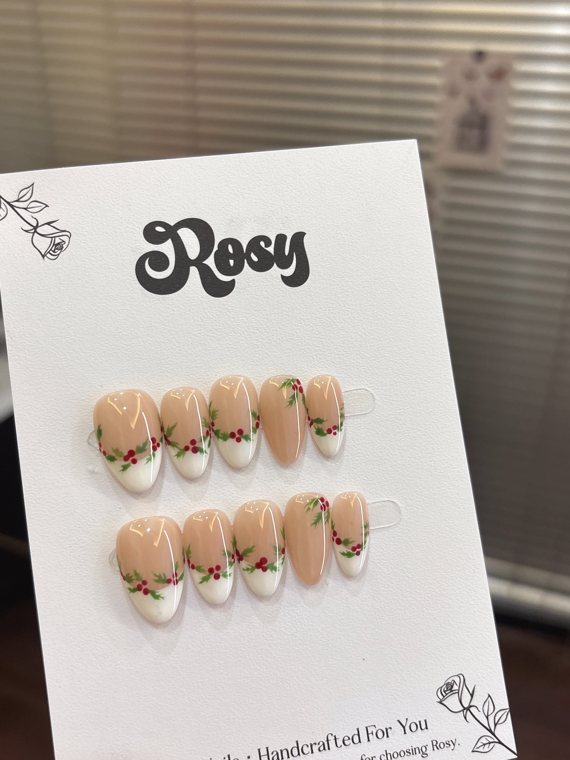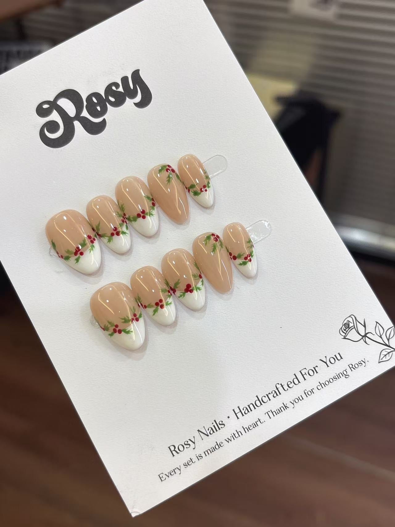 🎄 櫻果聖誕 · Holly Berry Noel 描述|Description:以奶杏色作為底色,點綴上紅果與綠葉的手繪細節,彷彿聖誕花圈輕輕落在指尖,溫柔又充滿節日氣氛✨。自然透亮的色調襯托膚色,讓整體既甜美又高雅❤️💚。 特點|Features: 奶杏裸底 × 聖誕紅果 × 手繪綠葉🎨 清新自然,不過分誇張💅🏻 適合聖誕節、冬日約會、禮物造型🎁 顯白又溫柔,甜而不膩的節慶風💖
