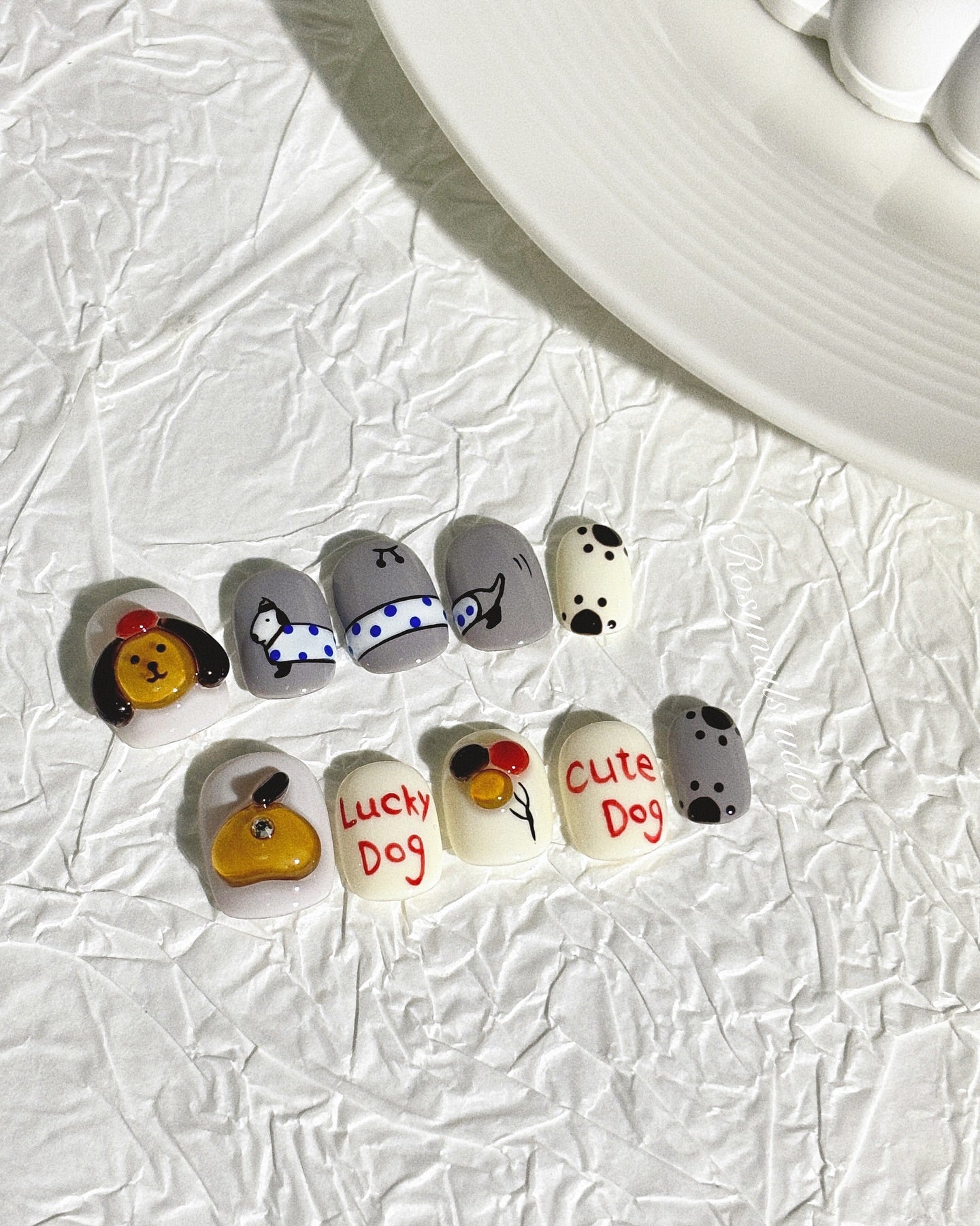 Rosy每副穿戴甲獨一無二,顏色深淺、紋路、飾品大小皆有少許差異這款穿戴甲以可愛狗狗為主題,結合多種色彩與造型,帶來滿滿的童趣感 🐕✨。設計上有微笑的狗狗臉 🐶、以及俏皮的「Lucky Dog」和「Cute Dog」字樣,搭配俏麗的圓點細節,讓指尖充滿歡樂氛圍 💖。這款設計非常適合喜愛可愛風格的人,無論是日常穿搭還是特別場合,總能為你帶來好心情!