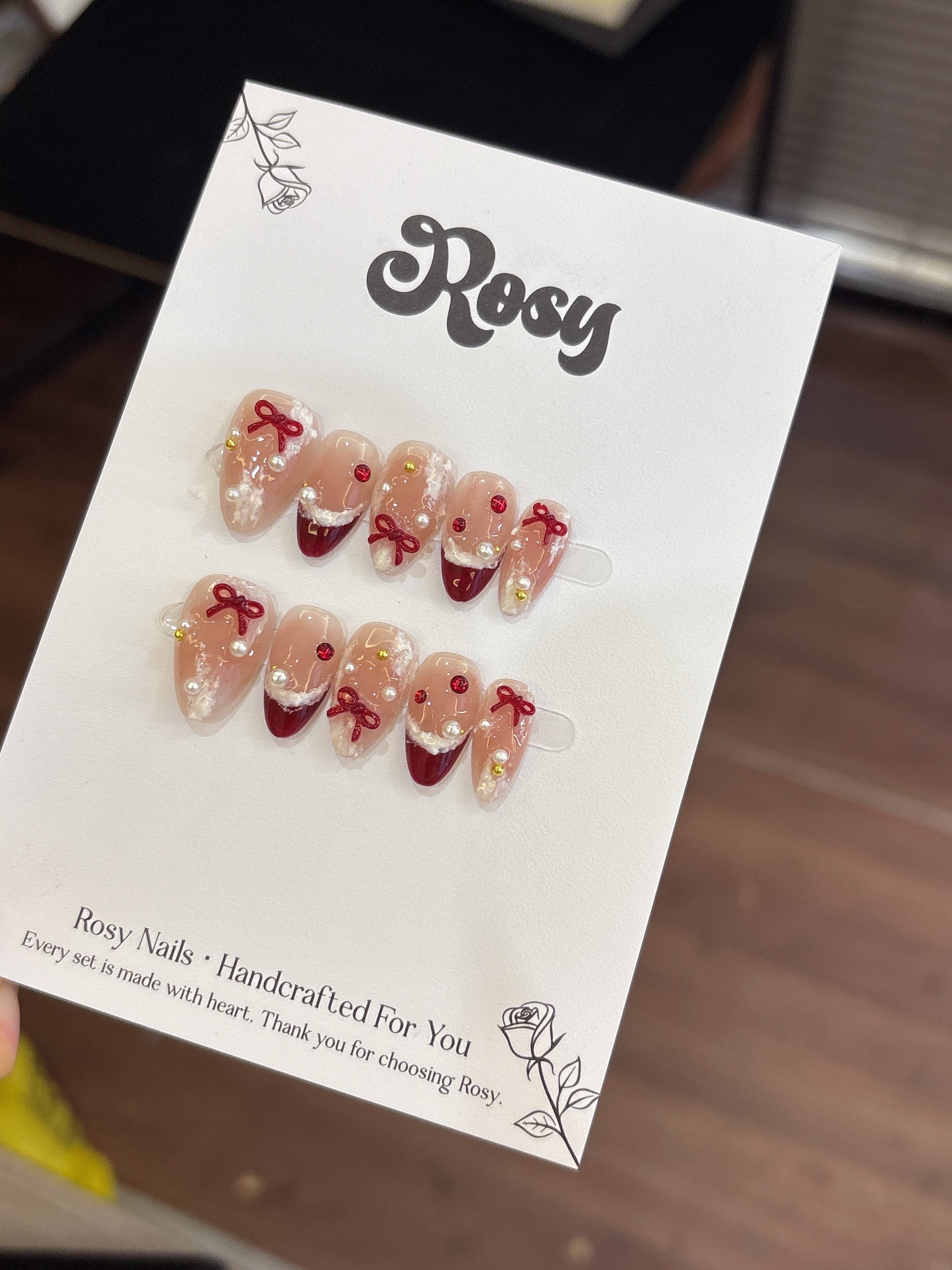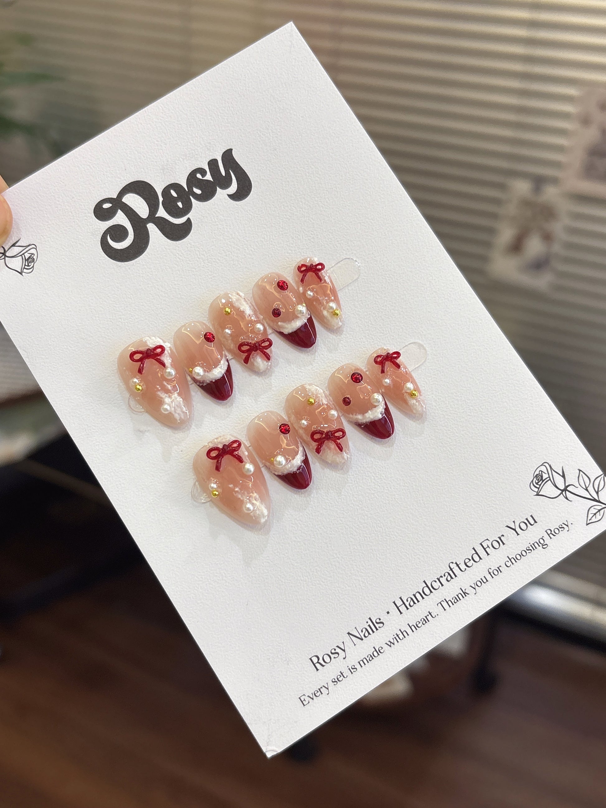 🎀 聖誕雪莓 · Merry Berry 描述|Description:以裸粉為底色,搭配酒紅法式指尖,點綴紅寶石亮片、珍珠與立體毛絨雪邊,再加上可愛紅絲帶,宛如聖誕樹下的甜蜜禮物盒🎁。整體充滿節日氣氛,甜美又不失高雅💖。 特點|Features: 裸粉 × 酒紅組合,顯白又顯手細✨ 立體雪邊與紅絲帶設計,滿滿聖誕氛圍🎅 加入珍珠與亮鑽,細節精緻動人💎 適合節日約會、派對穿搭🎄