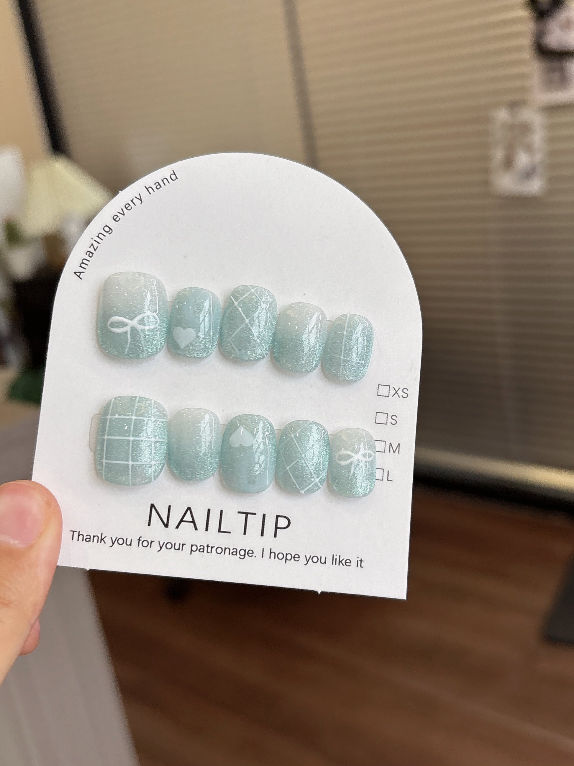 像是打開了一本甜美的手帳,這款設計以薄荷綠作為主色調,搭配可愛手繪風蝴蝶結、愛心和格紋元素,在清新光澤底色上呈現出童趣又精緻的風格。甜而不膩,適合日常穿搭、學生風或文青系女孩。