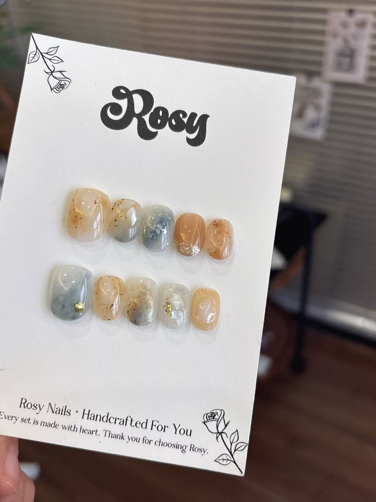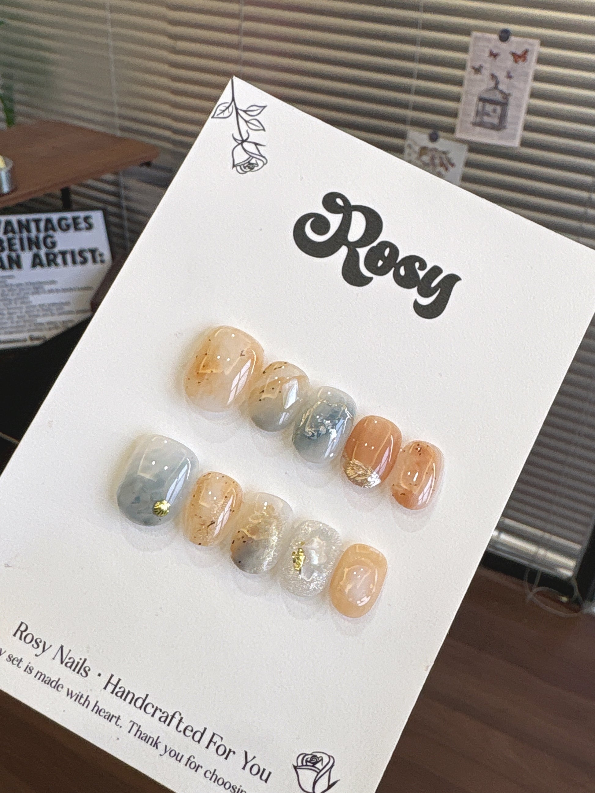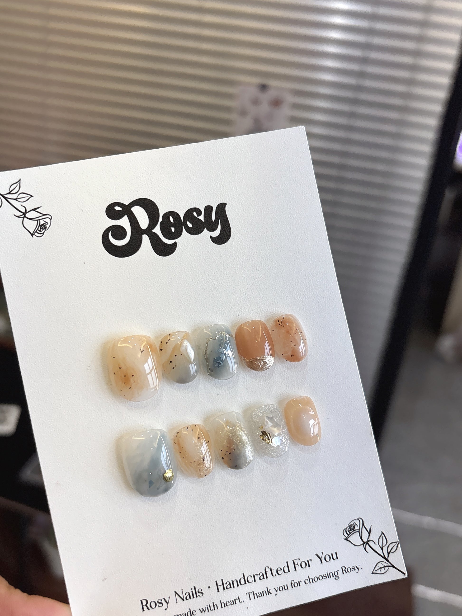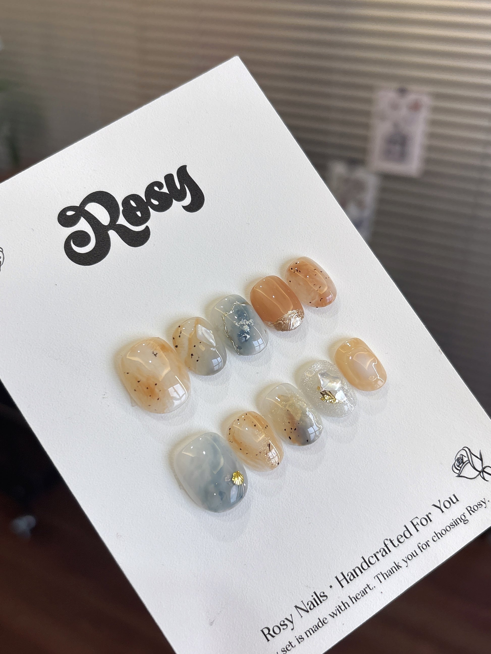 ☁️ 奶霧晨光 · Misty Morning 描述|Description:以奶杏與灰藍暈染出柔霧層次,點綴細閃與金箔,仿如晨曦灑落的微光✨。色調溫柔又帶點知性氣息,散發出低調優雅的秋冬氛圍☕️。 特點|Features: 奶霧暈染效果,柔和顯白 🤍 加入細閃與金箔,自然光下閃爍動人 ✨ 適合日常與辦公場合,氣質滿分 💅🏻 推薦配搭米白、卡其、灰藍穿搭 💭
