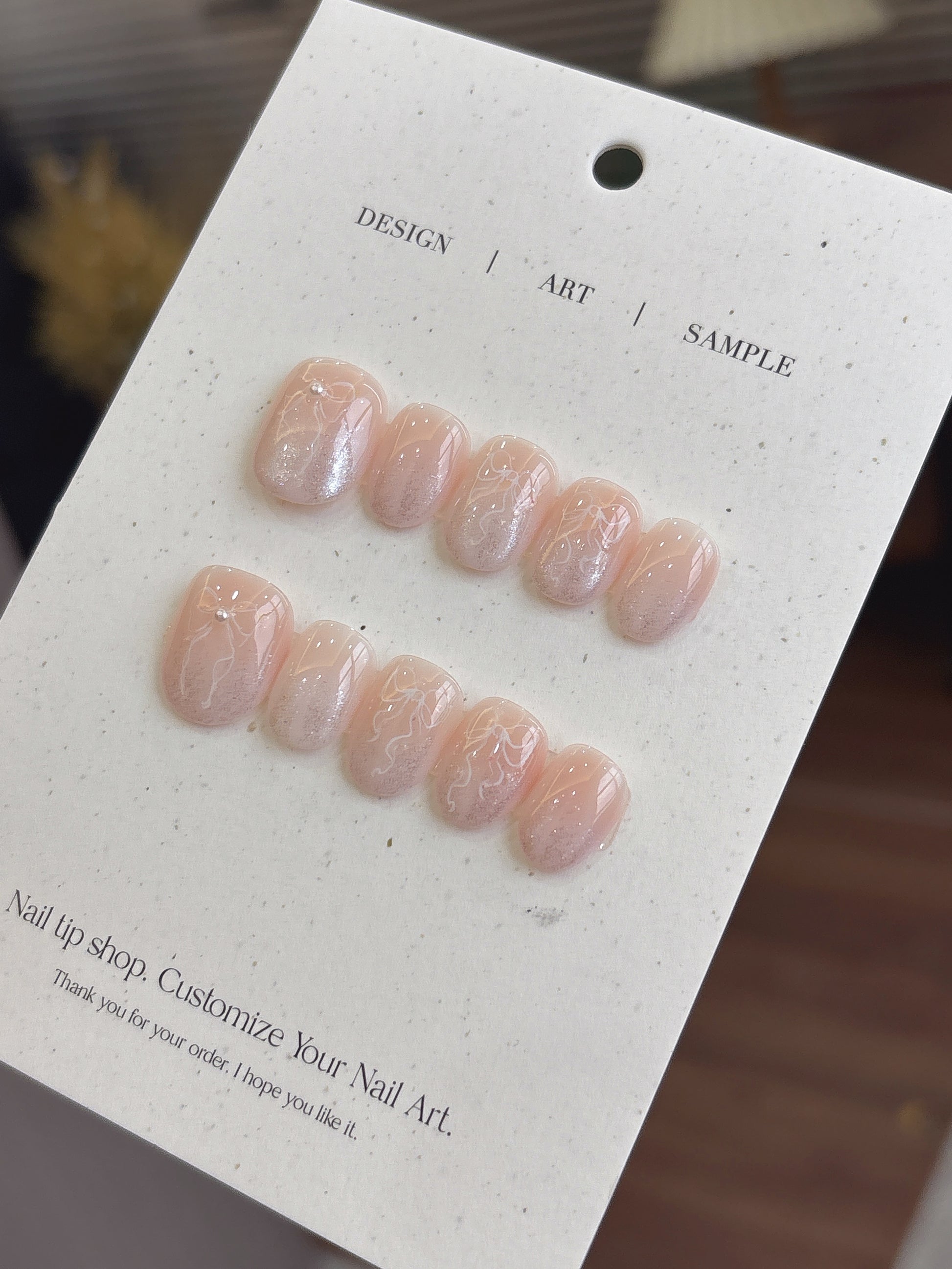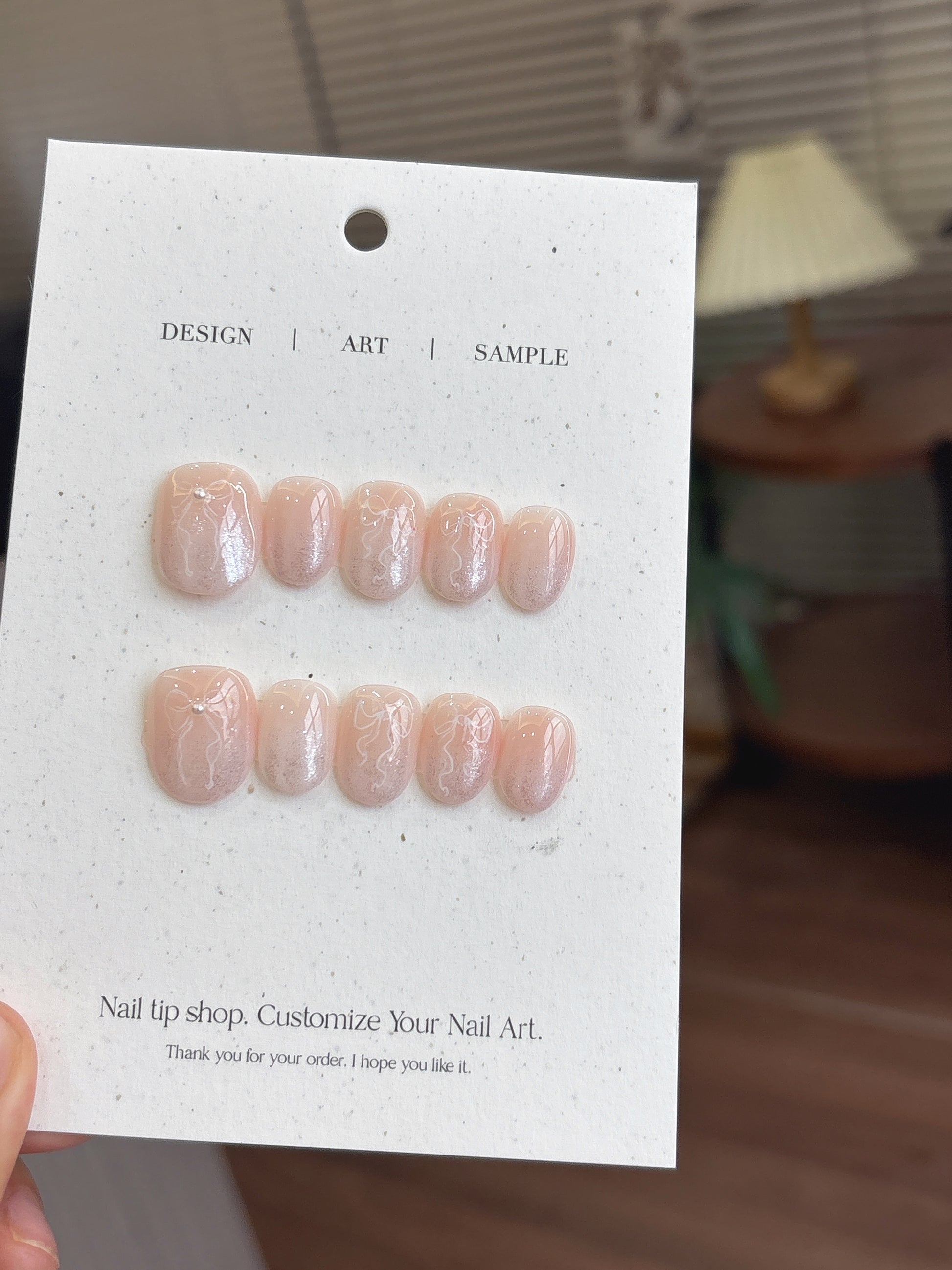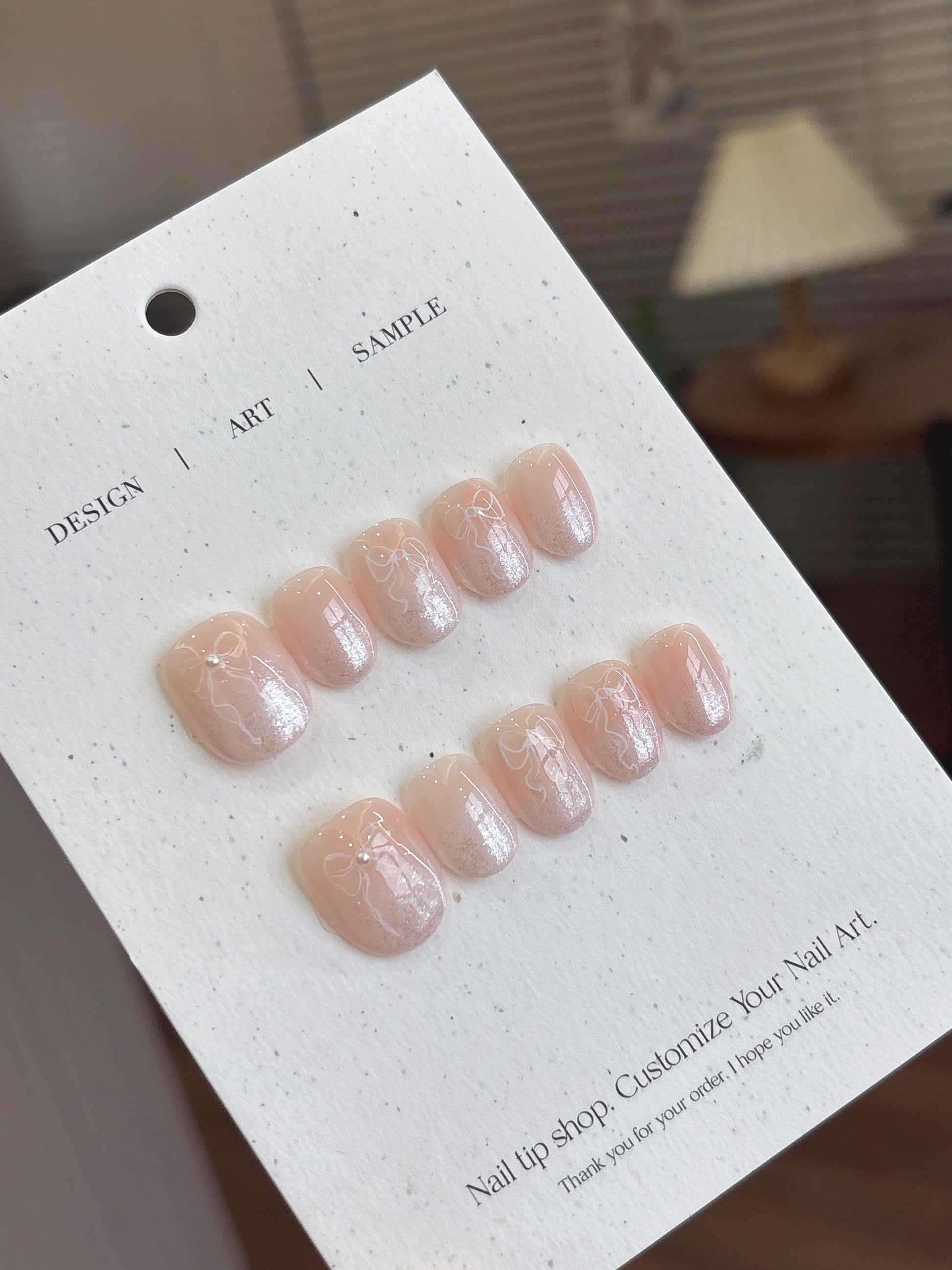 粉嫩裸膚色暈染指尖,灑上微閃銀粉,配上手繪白色絲帶蝴蝶結,宛如月光下搖曳的花瓣,柔美而空靈。每個細節都散發溫柔氣息,是夢幻系女孩必備款。🌙