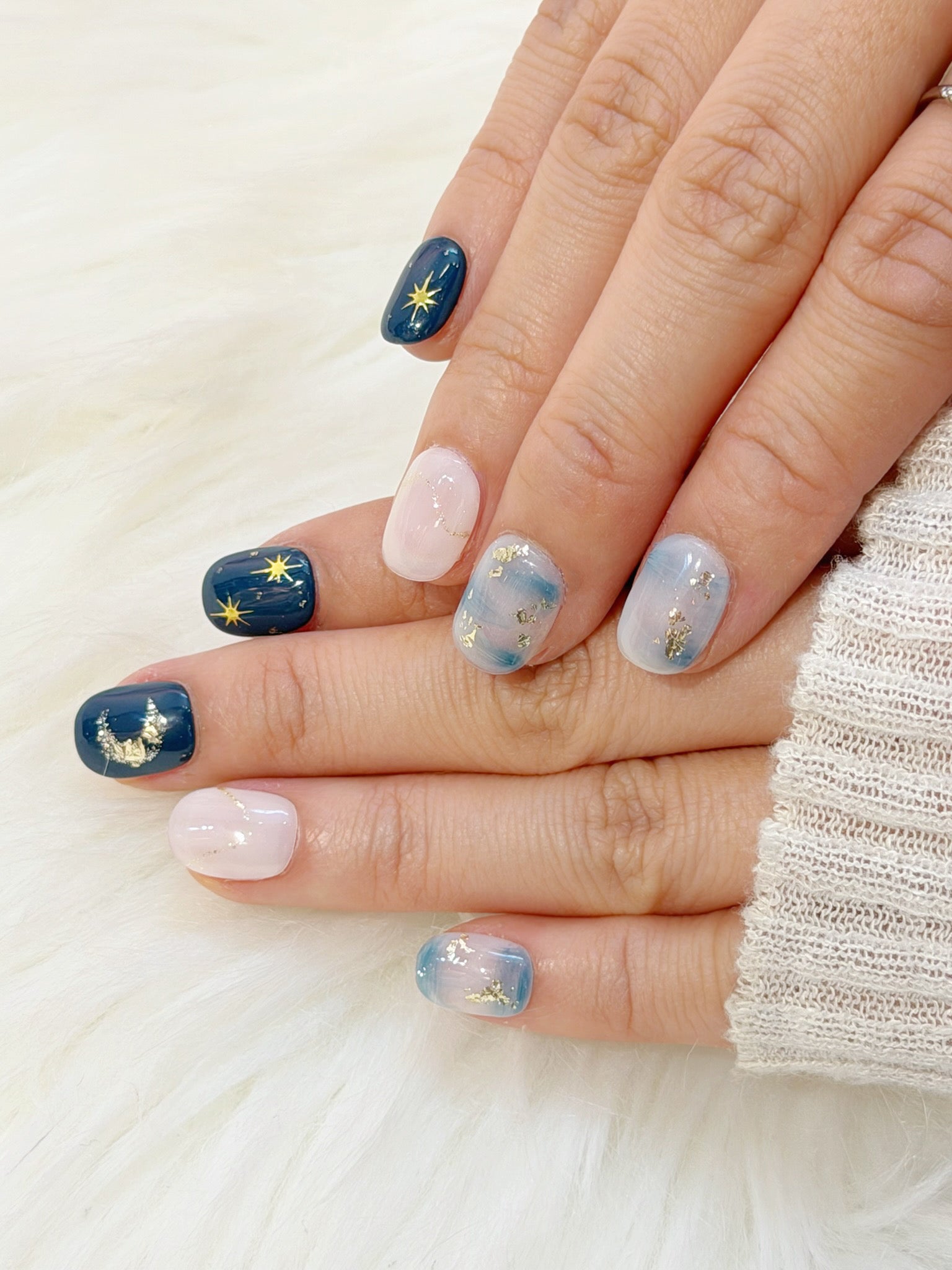 深邃夜空藍與柔霧灰藍暈染交織,點綴金箔與閃爍星月,
