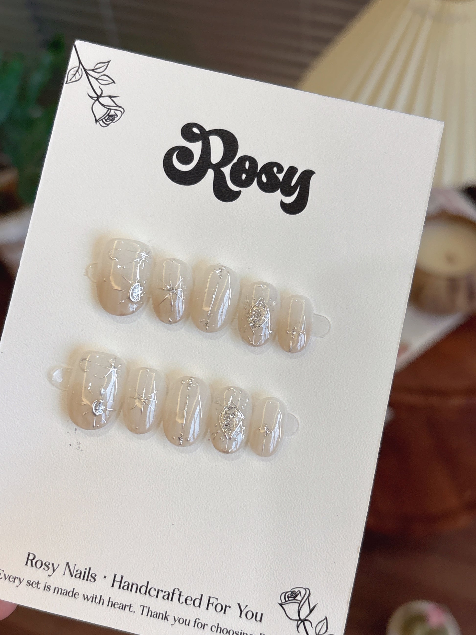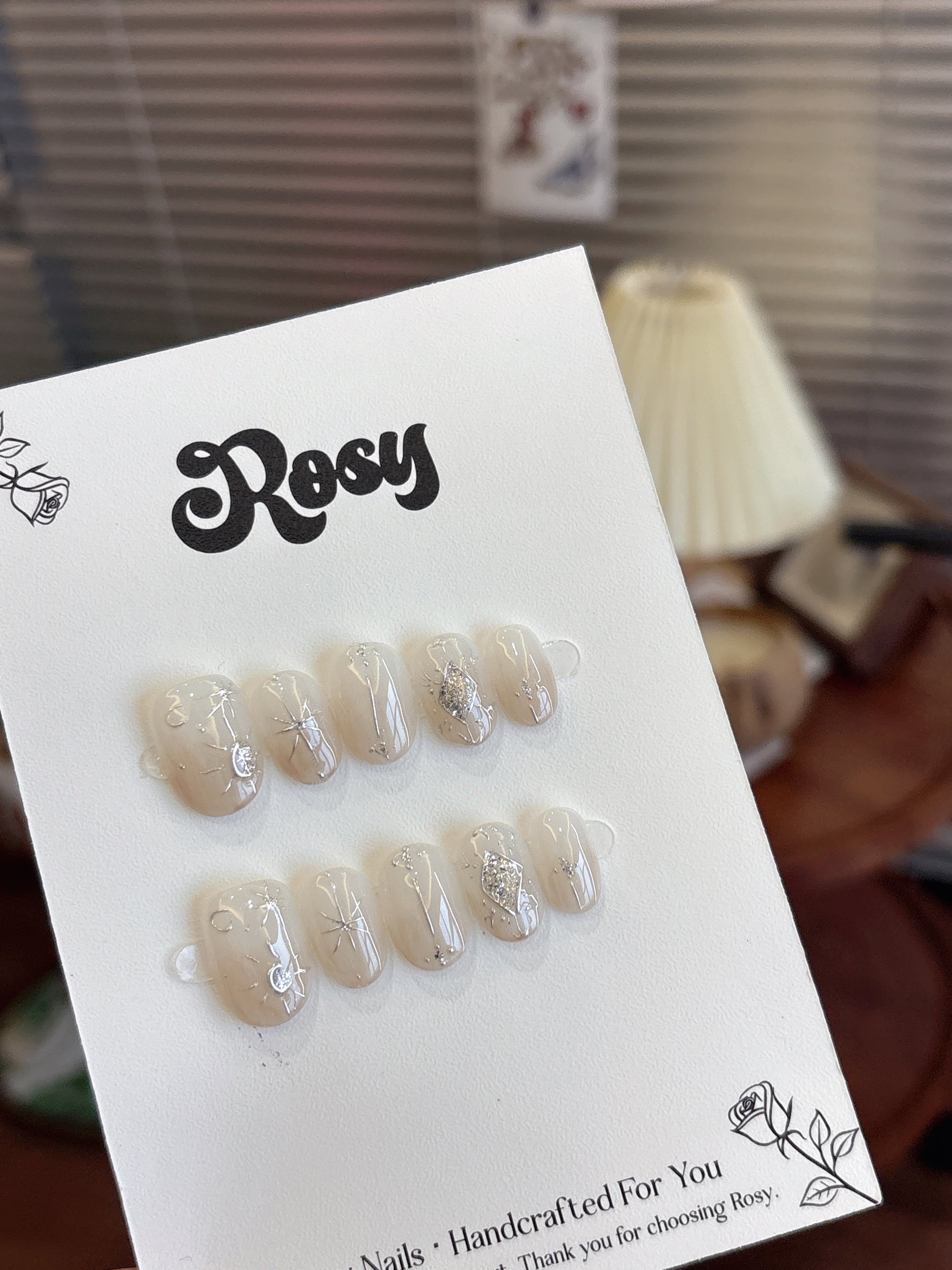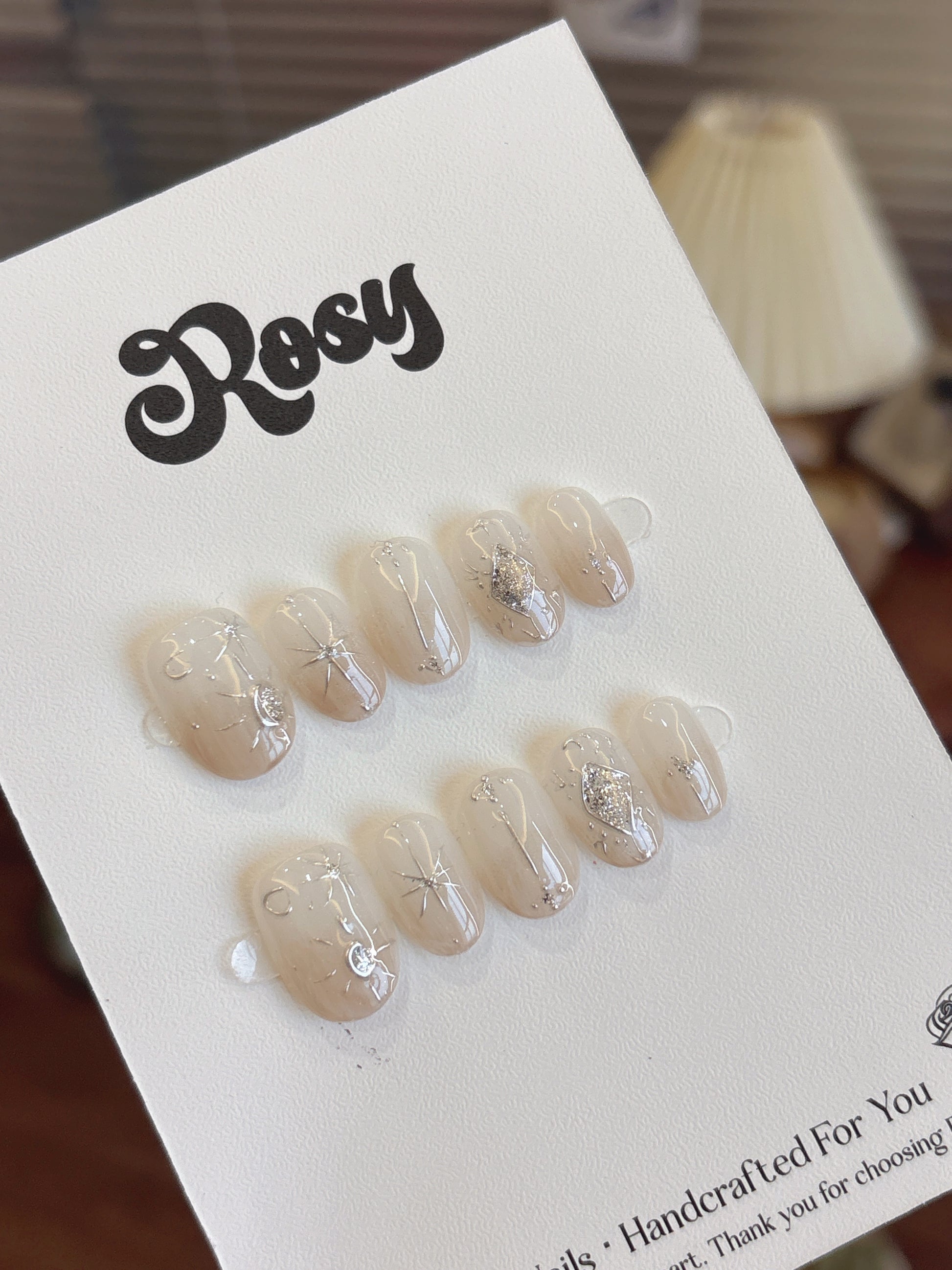 描述:半透明奶白底色搭配銀色線條,如同夜空中閃爍的星河。點綴水鑽月亮與星芒設計,散發夢幻光芒,優雅又高貴,適合追求仙氣與質感的妝扮。