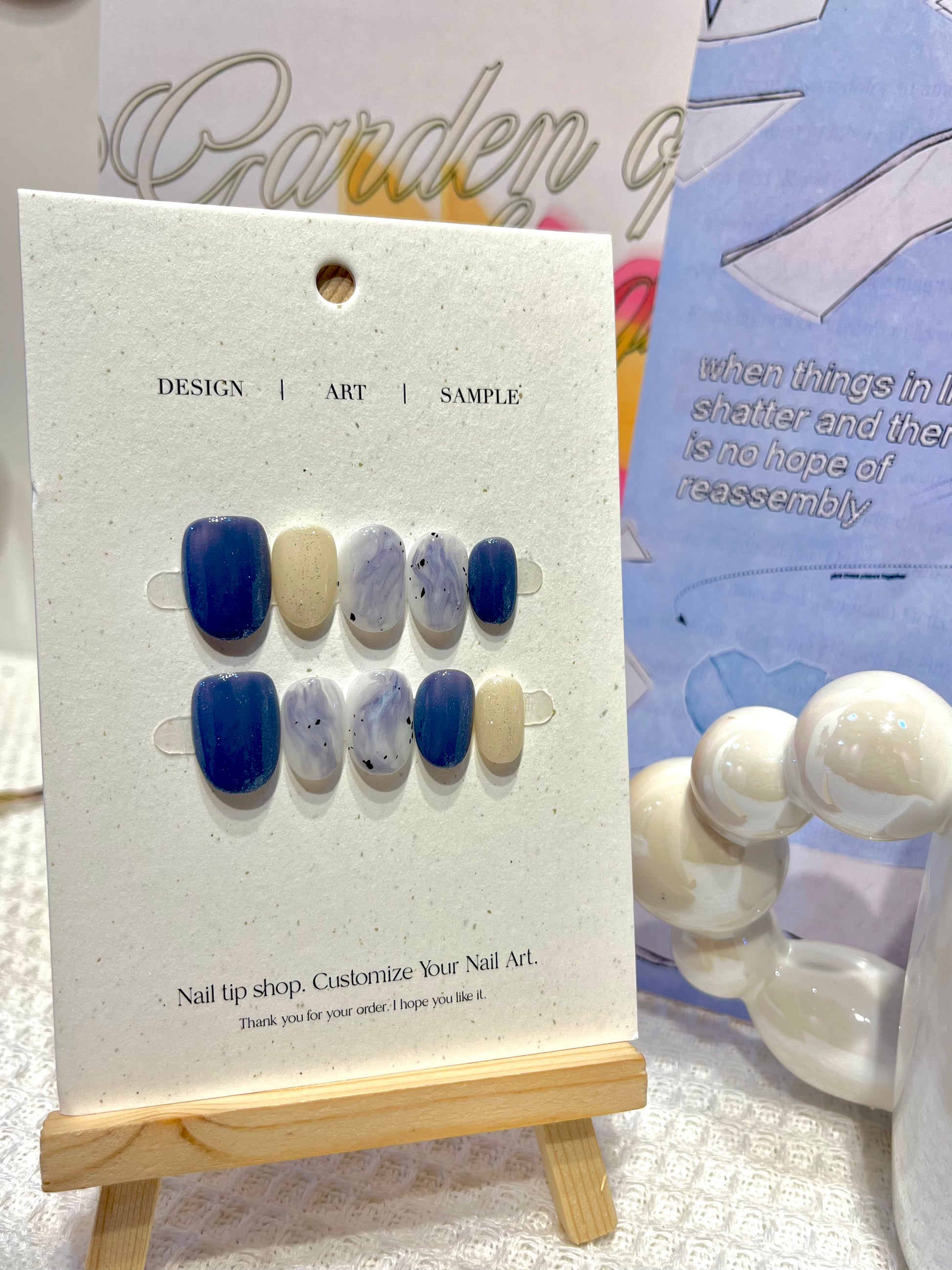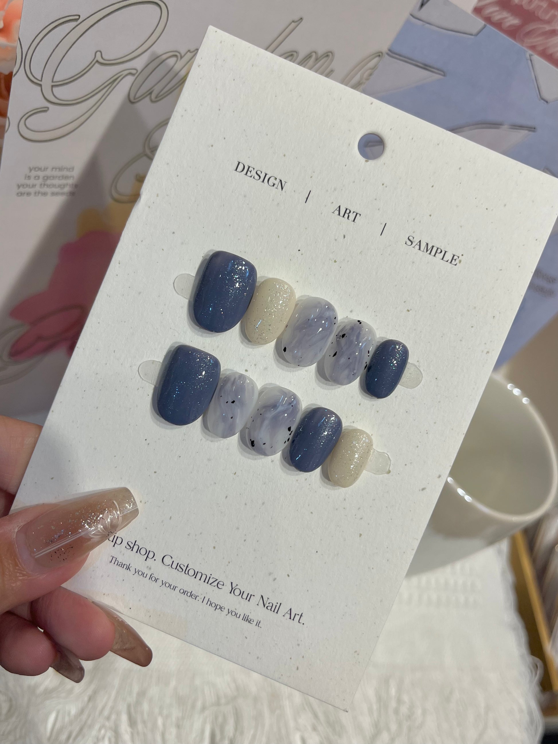 🌌《Night Drift》選用深藍銀閃亮面甲搭配灰白暈染與流雲紋理設計,點綴些許黑點與閃粉細節,如同夜空下雲層流動與星光交錯的瞬間,帶出靜謐而富層次的視覺感。風格冷冽又柔和,適合秋冬穿搭或喜愛夜空色系與沉穩感的你。✨