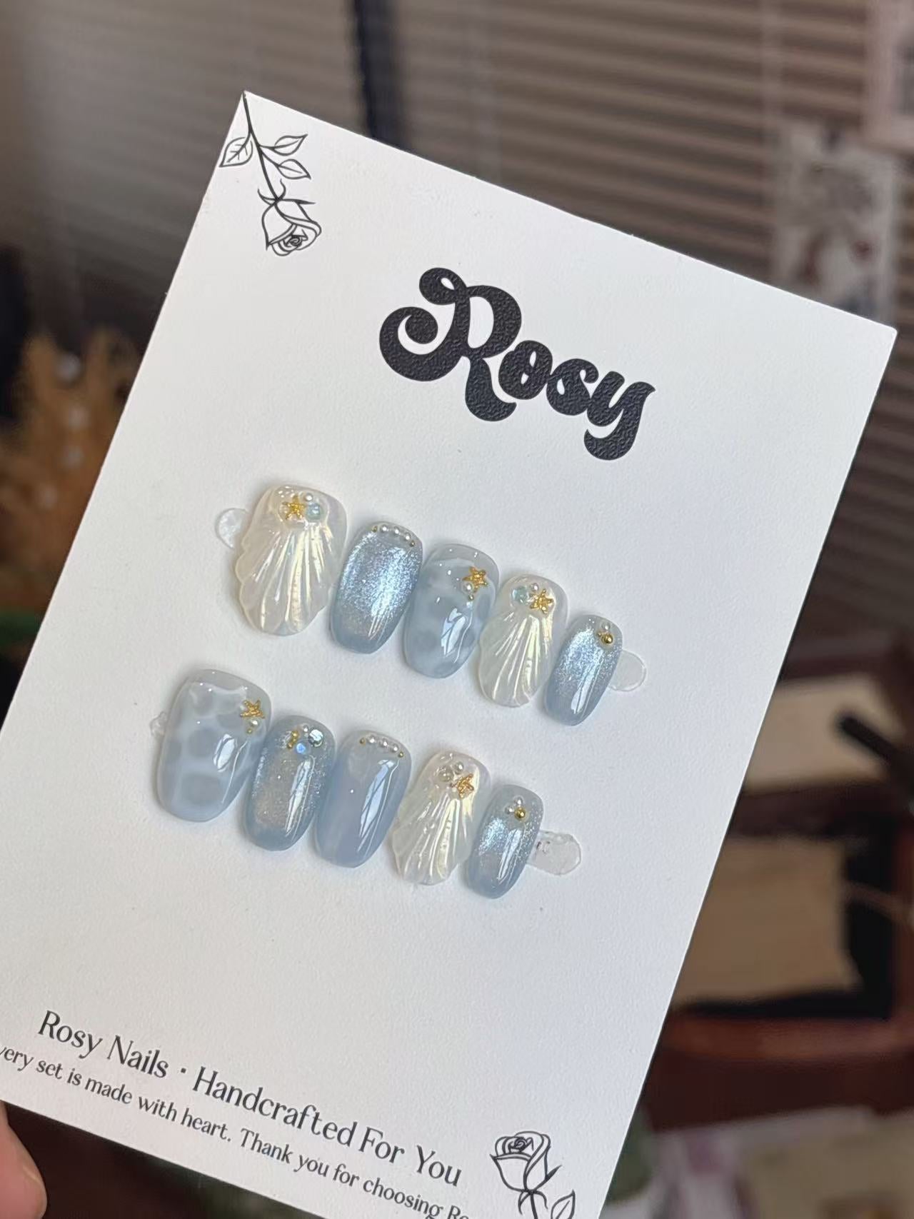 描述:以冰藍與珍珠白為主調,宛如大海般清澈。立體貝殼浮雕搭配金色海星與亮片點綴,猶如海浪拍打在貝殼上的光影,閃爍著夢幻光澤。清新又精緻,讓指尖散發夏日海風的浪漫氛圍。