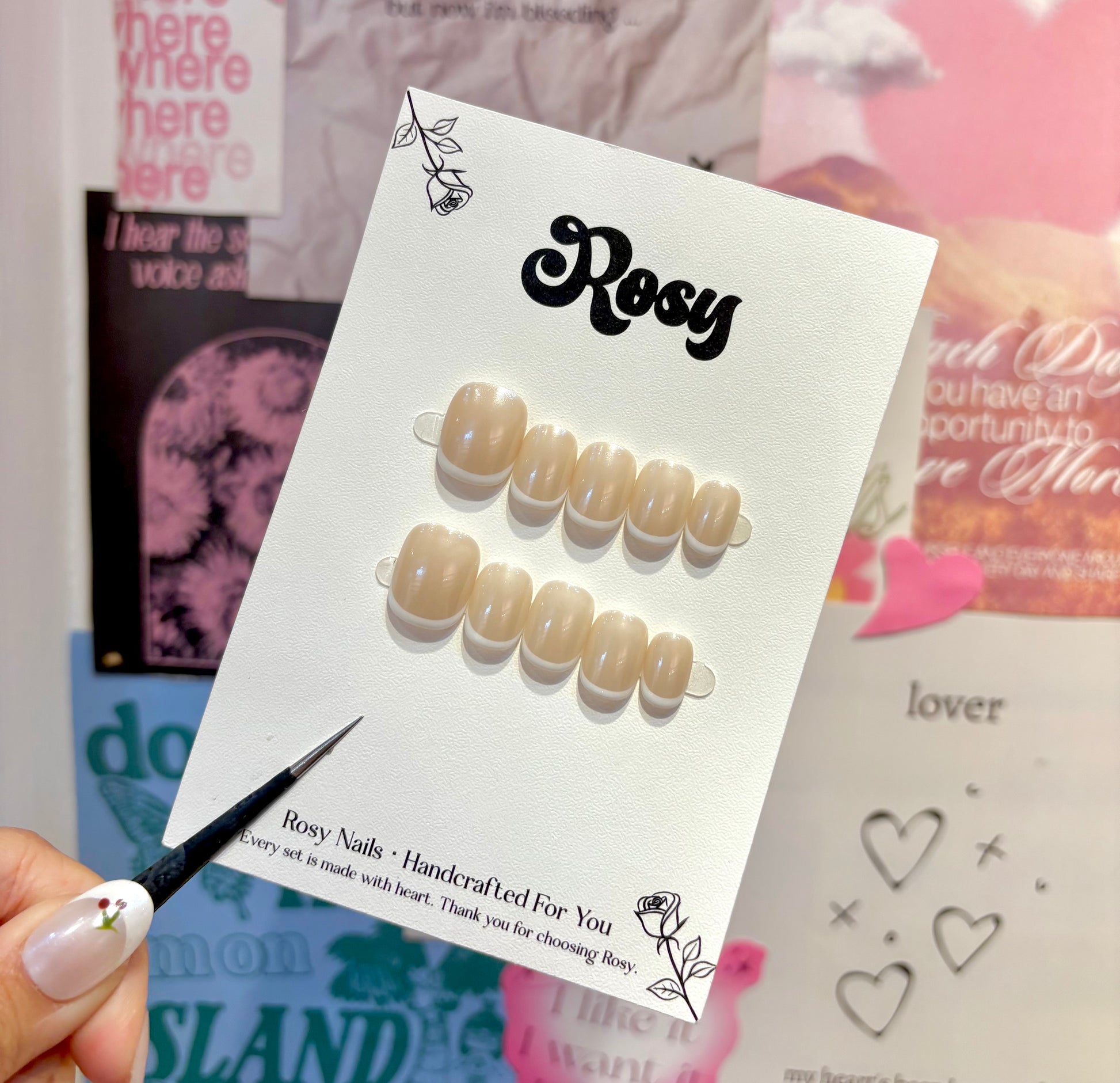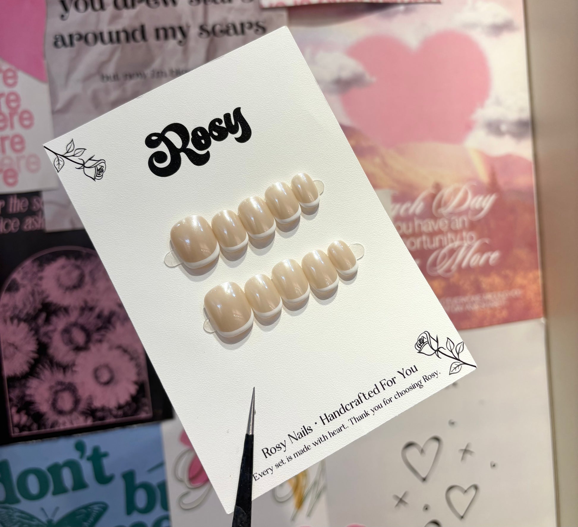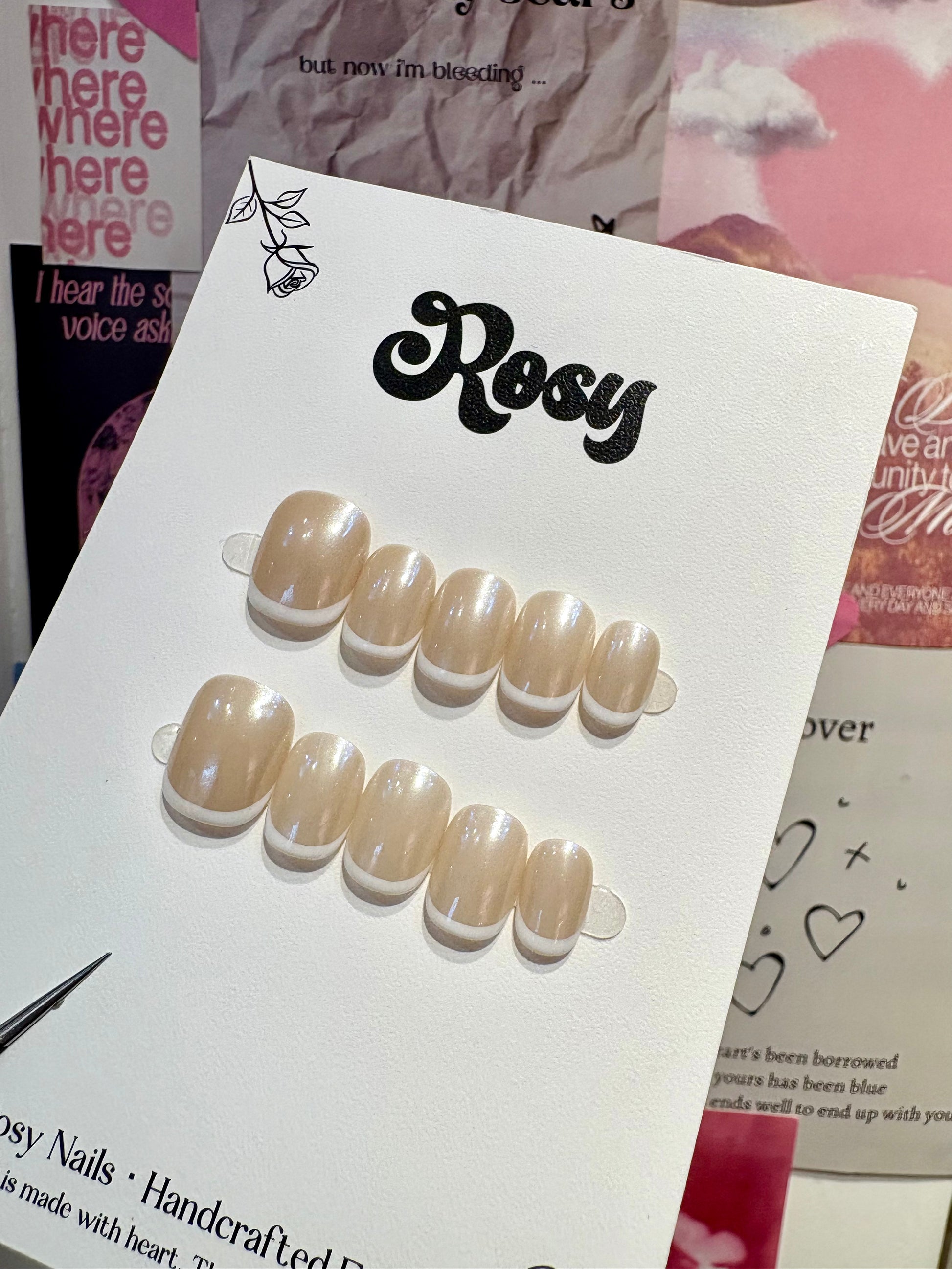 描述:低調裸色搭配細膩珠光,展現溫柔高雅的氣質。以簡約白色法式線條勾勒邊緣,乾淨又不失精緻。這款特別適合日常、辦公室場合或婚禮出席,讓手指看起來修長又有光澤感。— 簡約法式 × 珠光裸色 ✨— 百搭不挑場合,怎樣戴都優雅 💅🏻
