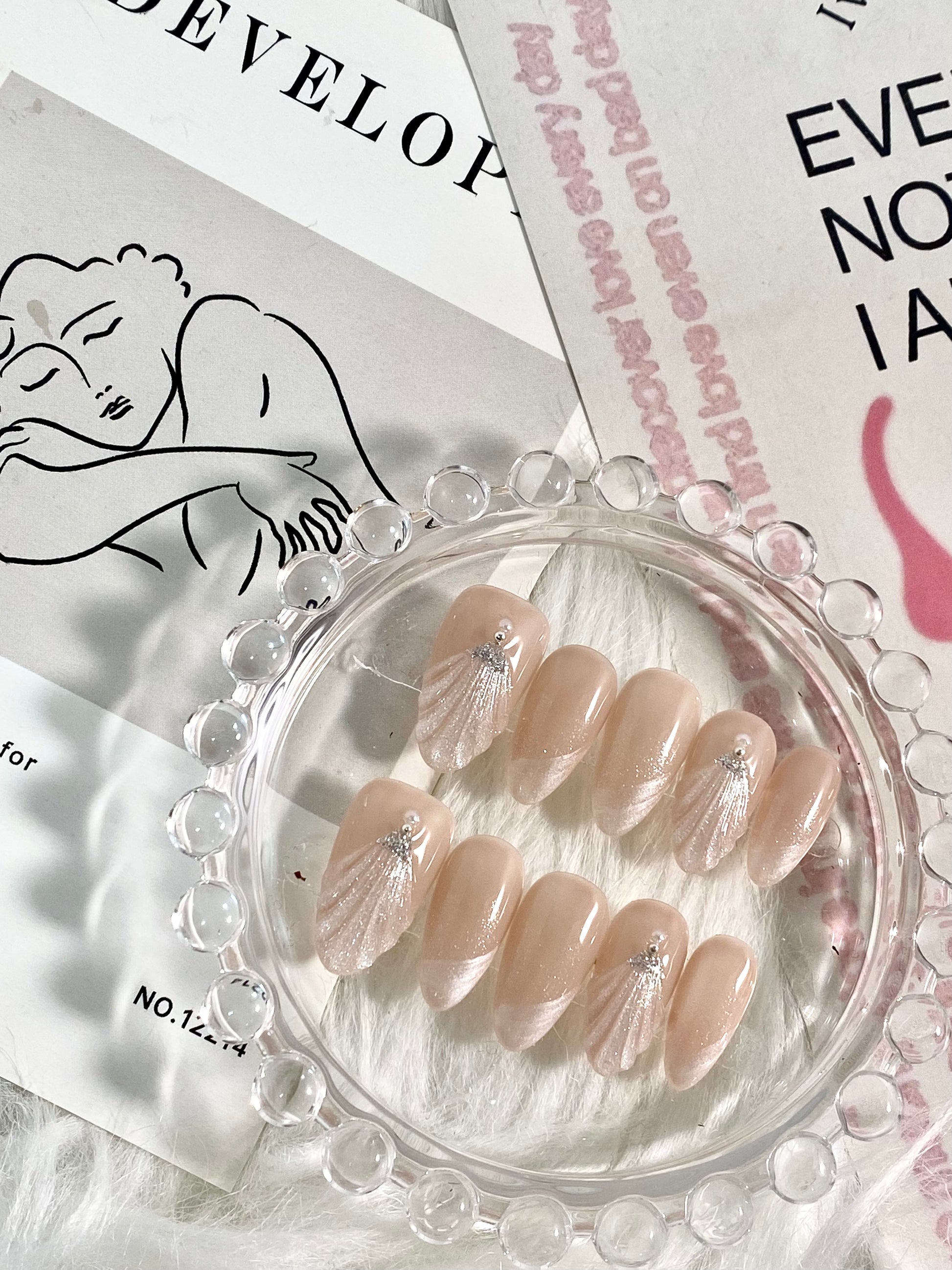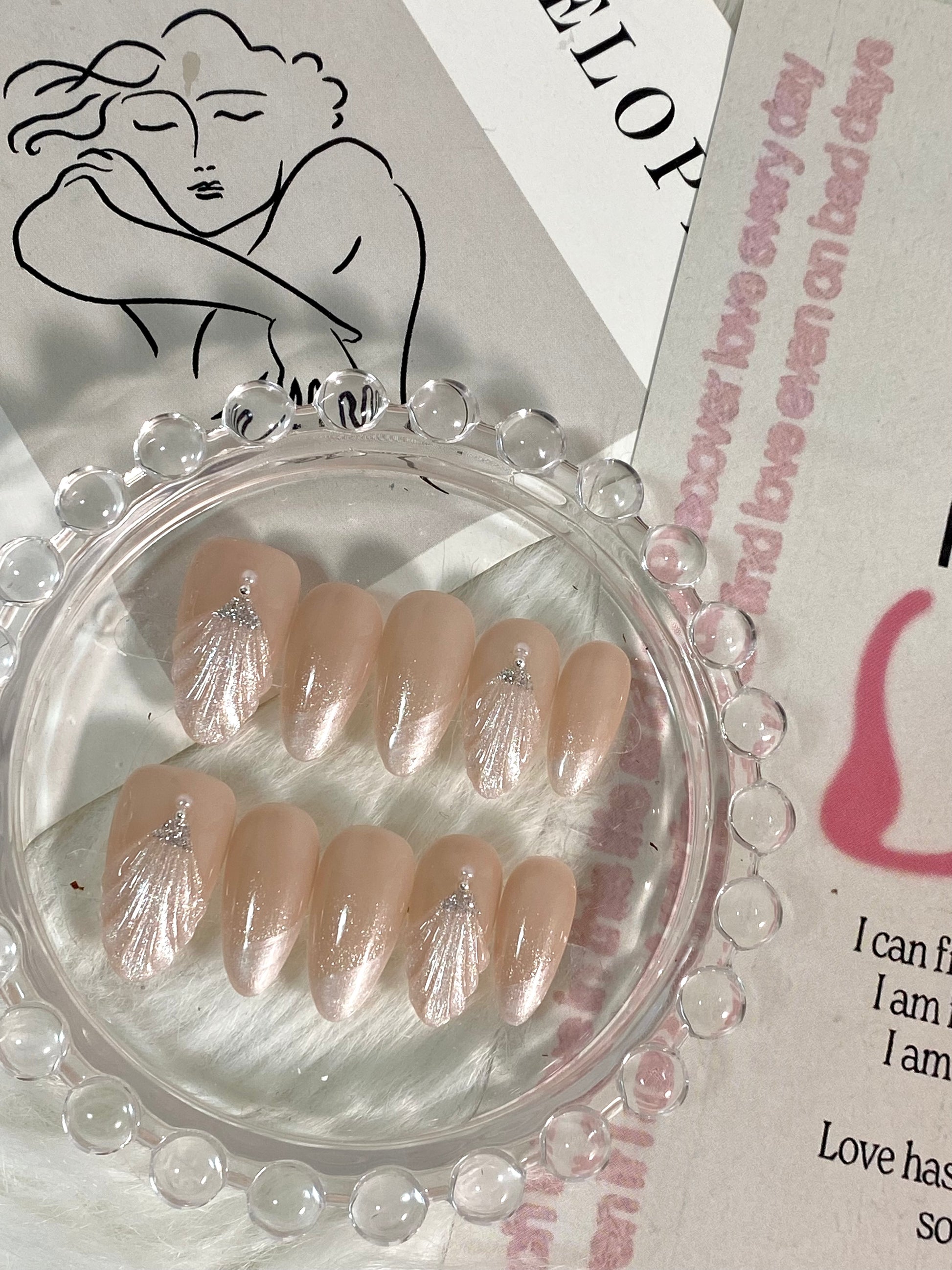 裸色指尖映出微光波紋,立體貝殼雕花搭配珍珠與閃爍水晶,像是從海底撿起的夢境小寶物。溫柔中帶有童話般的浪漫氣息,讓你化身氣質系小美人魚🫧🐚。
