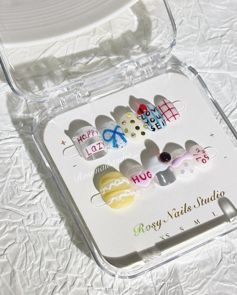 這款穿戴甲融合可愛元素與俏皮設計,充滿童趣與活力感 💅✨。字母標語「HAPPY」「LAZY」「HUG」營造輕鬆氛圍,搭配手繪格紋、藍色絲帶 🎀、金屬點綴與奶油感甜點造型 🍰,讓指尖充滿趣味與細節感 💖。這款設計適合喜愛活潑風格的你,無論是日常穿搭還是聚會,都能展現獨特俏皮魅力!