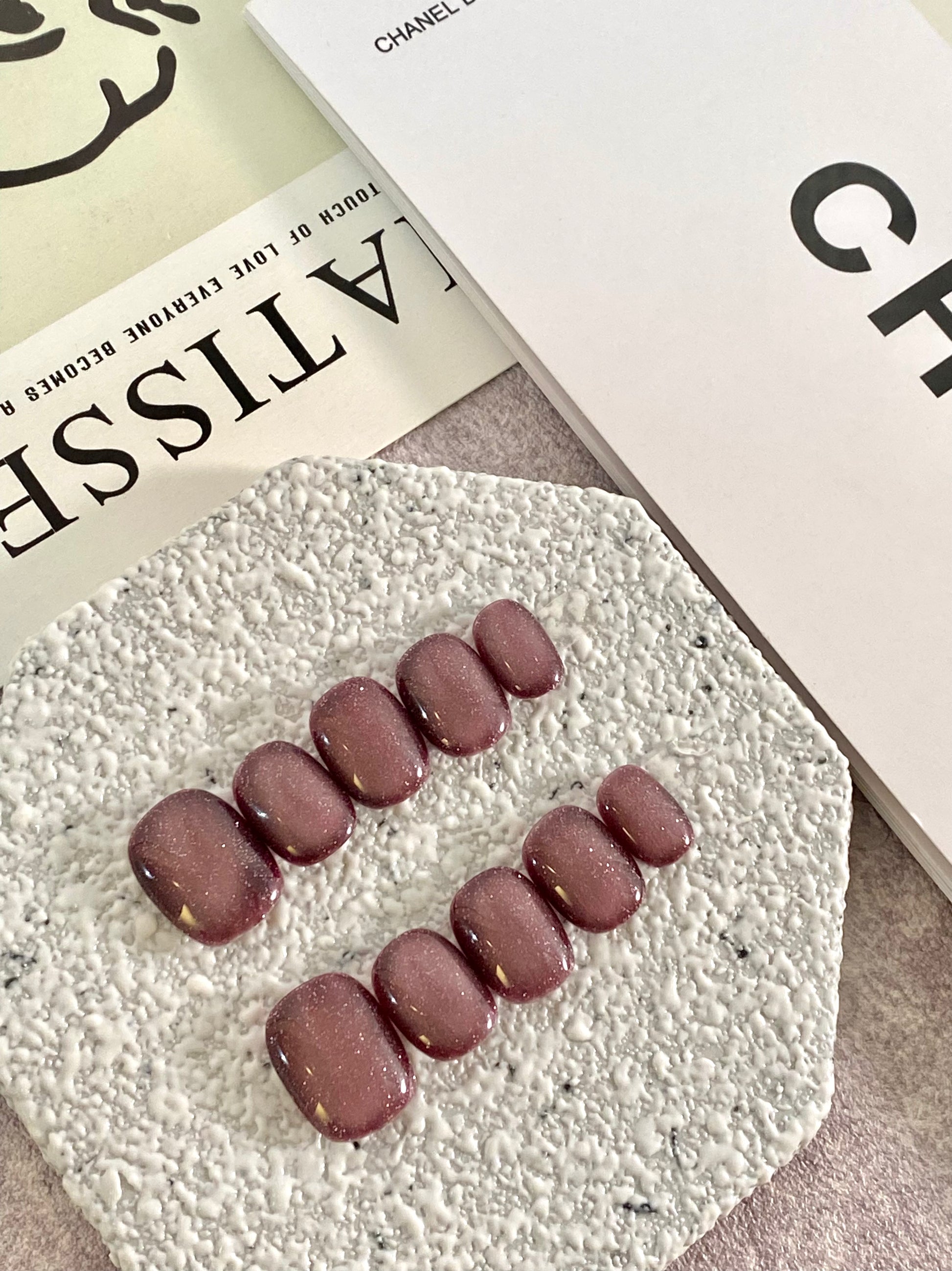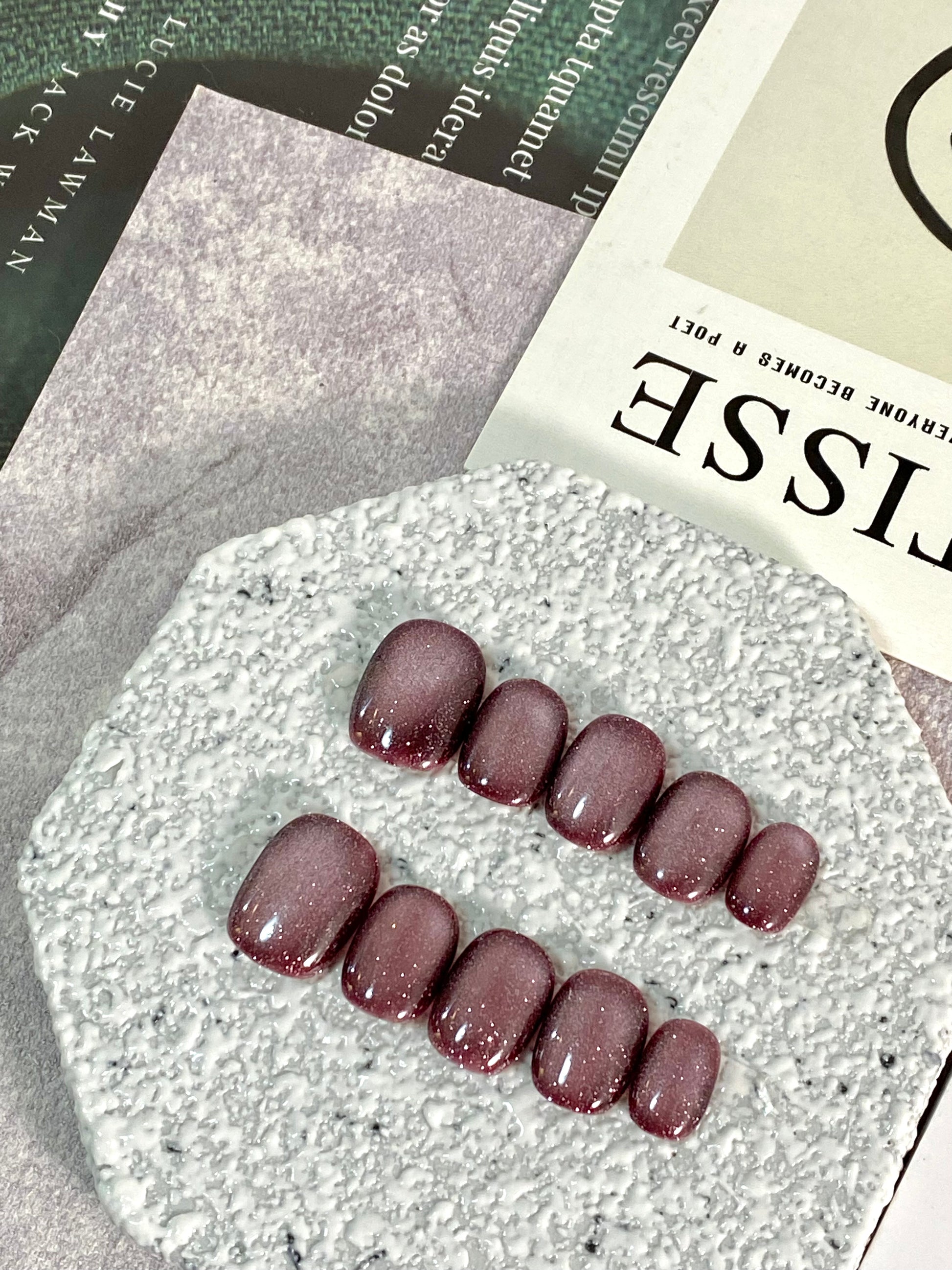 酒紅紫調 × 細緻閃粉,沉穩又迷人的復古風✨靈感源自成熟李子與紅酒的深沉色調,這款足甲低調中帶著微光閃爍,營造出如絲絨般的高級質感。是秋冬穿搭或晚宴造型的絕佳選擇。