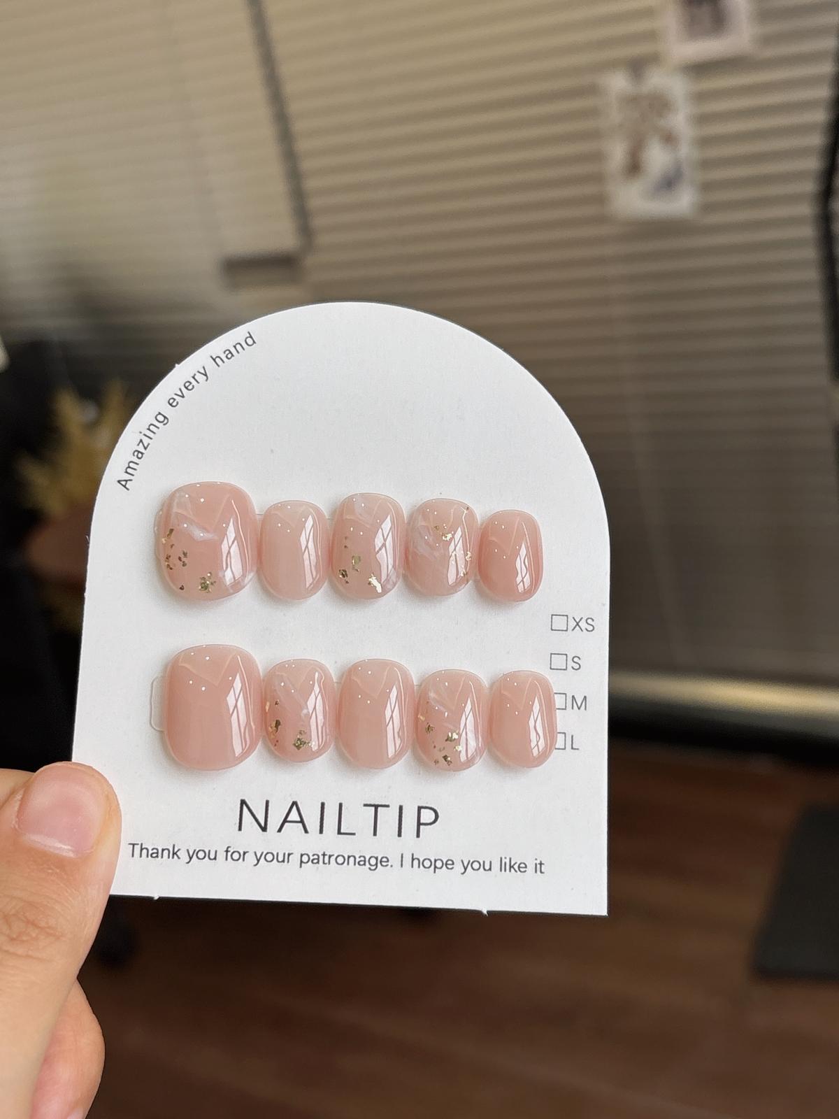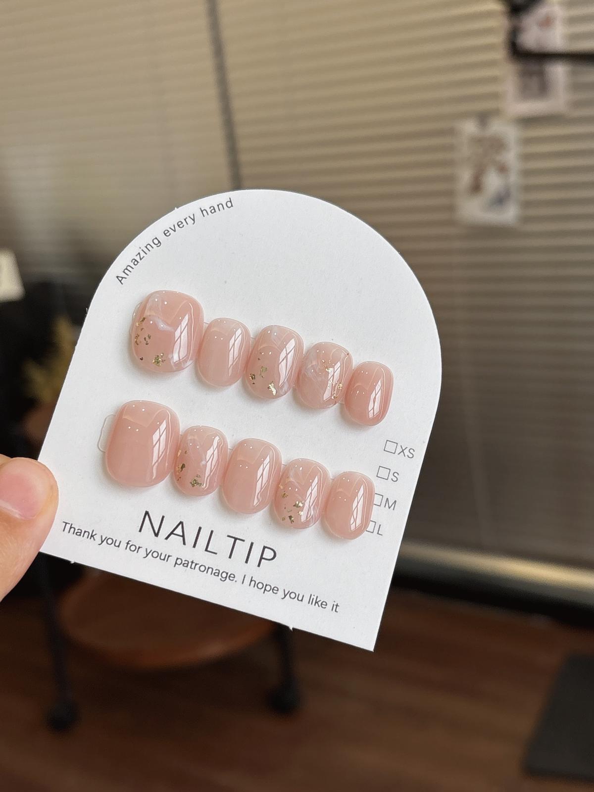 描述:溫柔裸粉就像一杯奶香玫瑰拿鐵,加入雲石暈染與金箔碎片,呈現低調又不失質感的層次美。甜而不膩,柔而不俗,是一款散發氣質的經典日常甲。