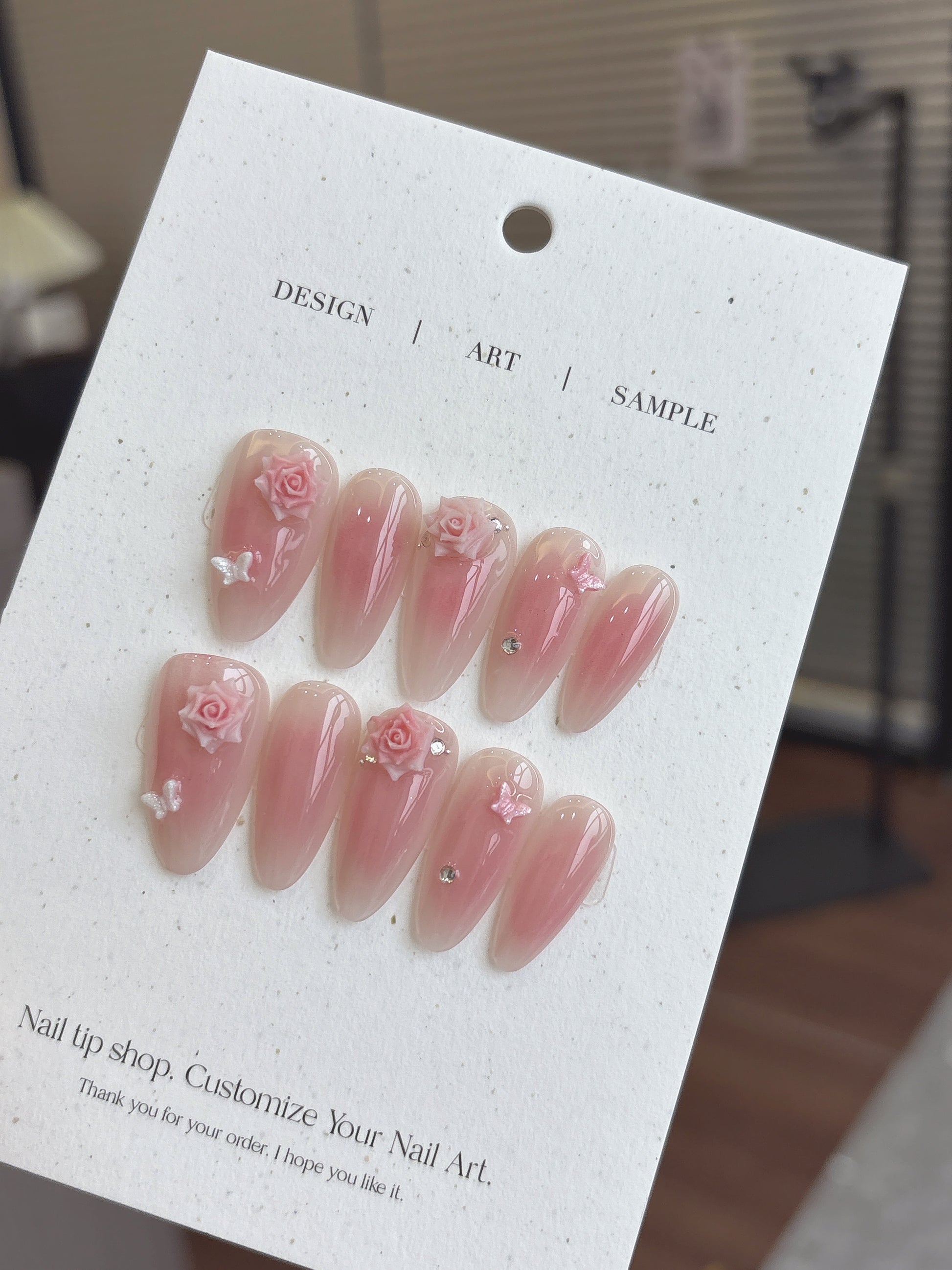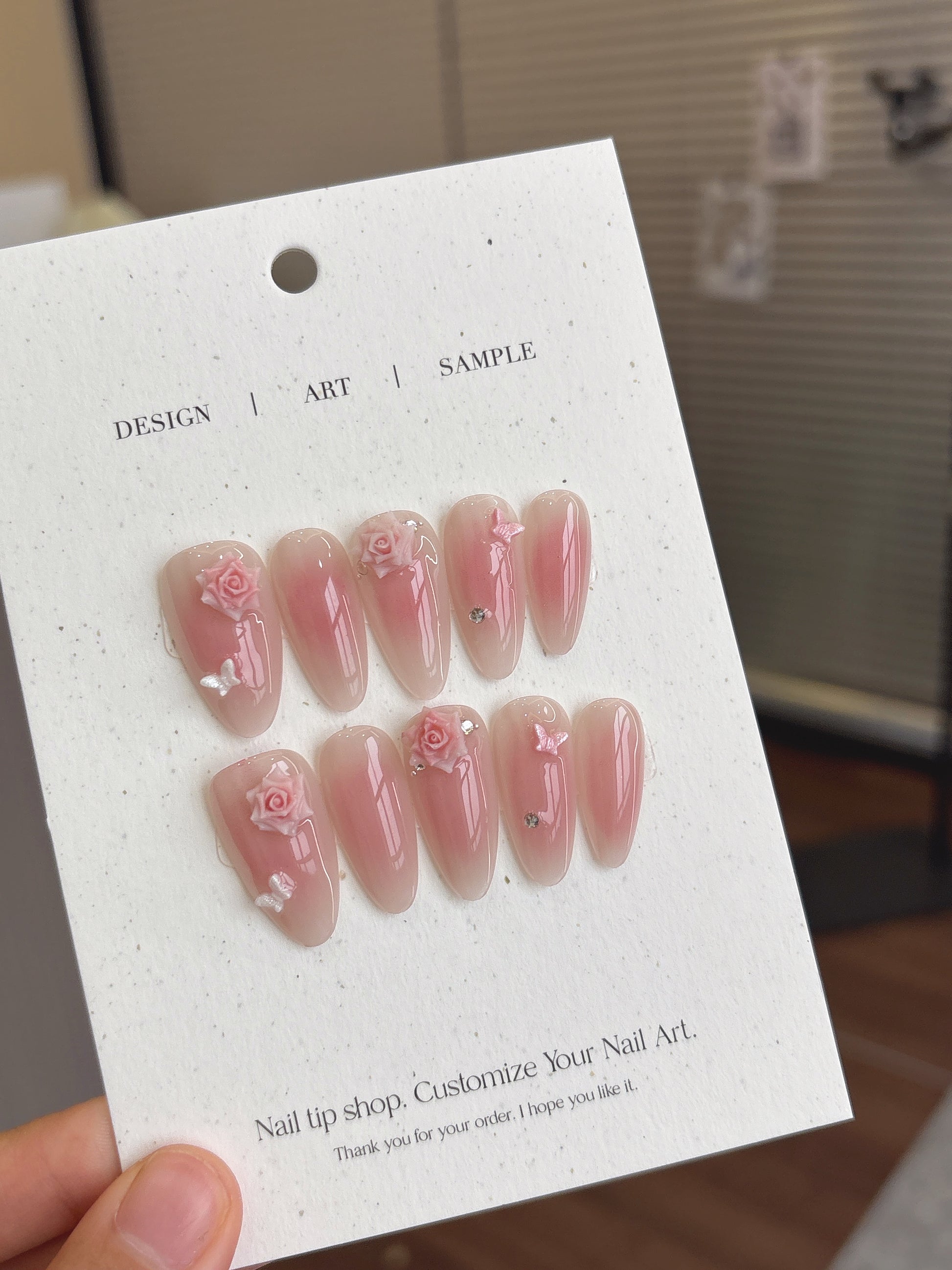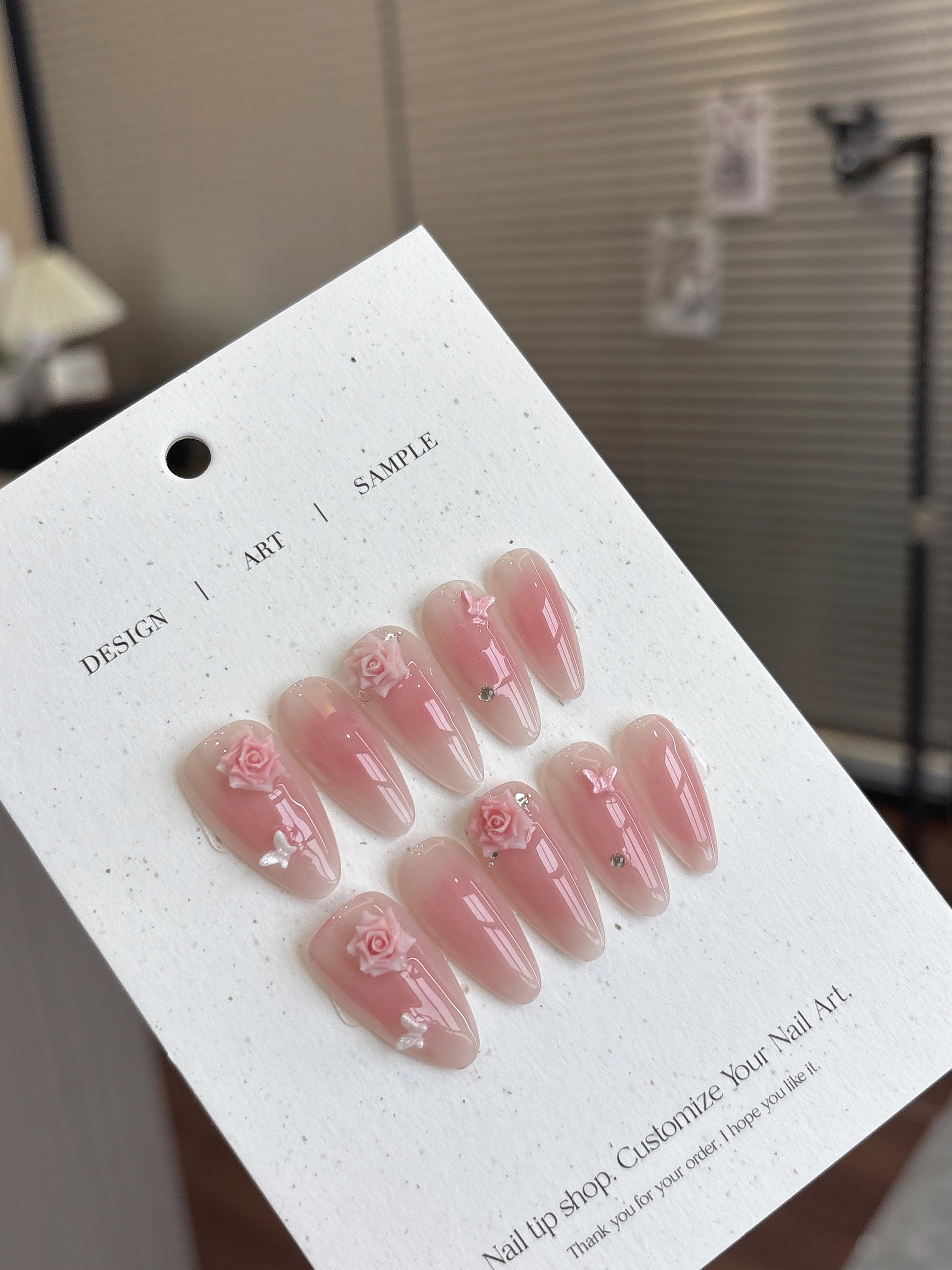 描述:浪漫裸粉漸變襯托立體玫瑰雕花,細緻蝴蝶點綴宛如飛舞於花間,輕柔又不失氣質。完美呈現優雅與愛意的指尖詩意,是甜美系女生的夢幻選擇。