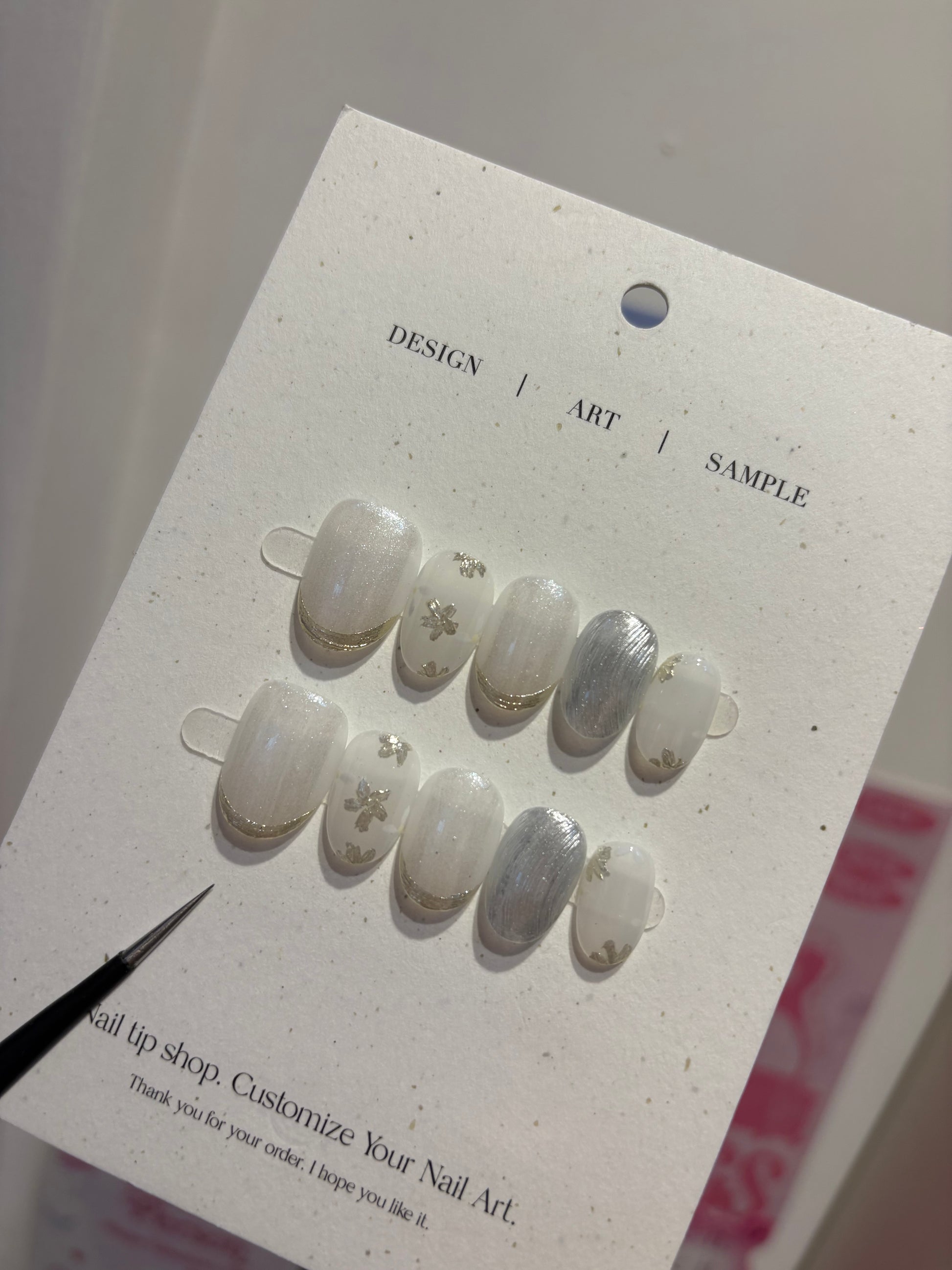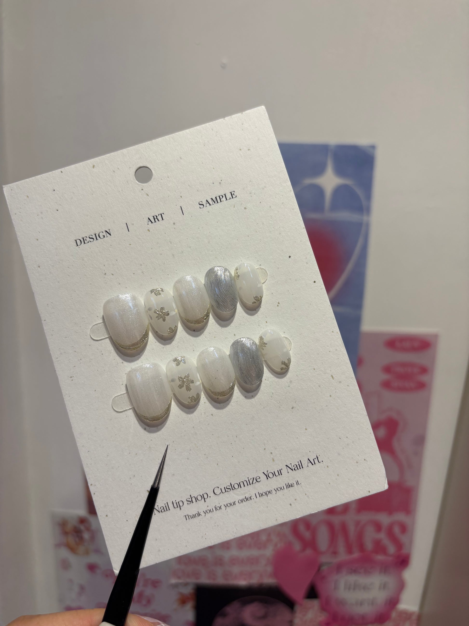 細緻銀白閃粉營造出如雪花般的純淨氛圍,金邊法式曲線低調卻精緻,搭配冰銀金屬感刷紋與立體星花點綴,展現優雅高冷氣質,如雪夜中一場浪漫的圓舞曲,靜謐中閃耀著獨特光芒。