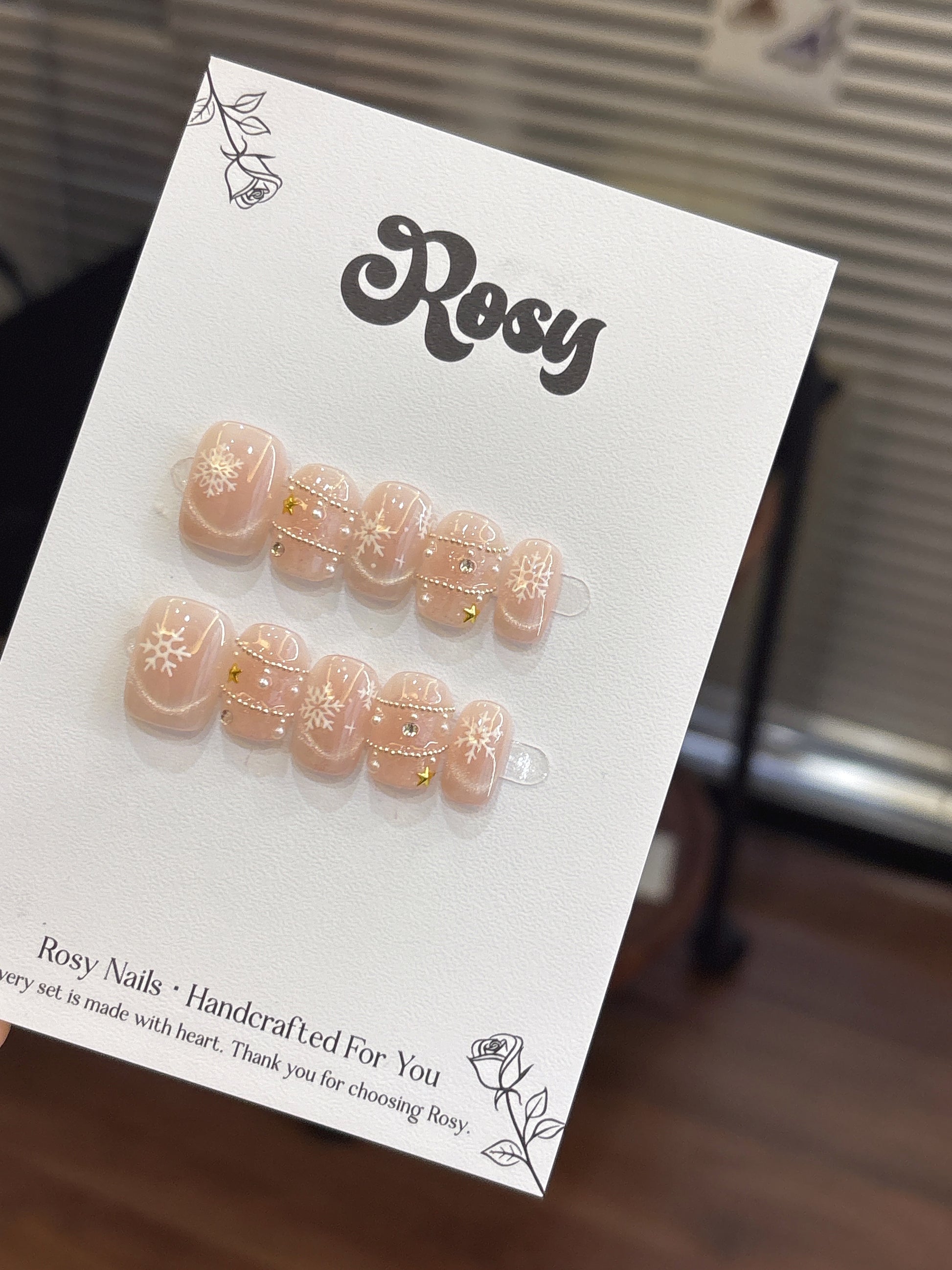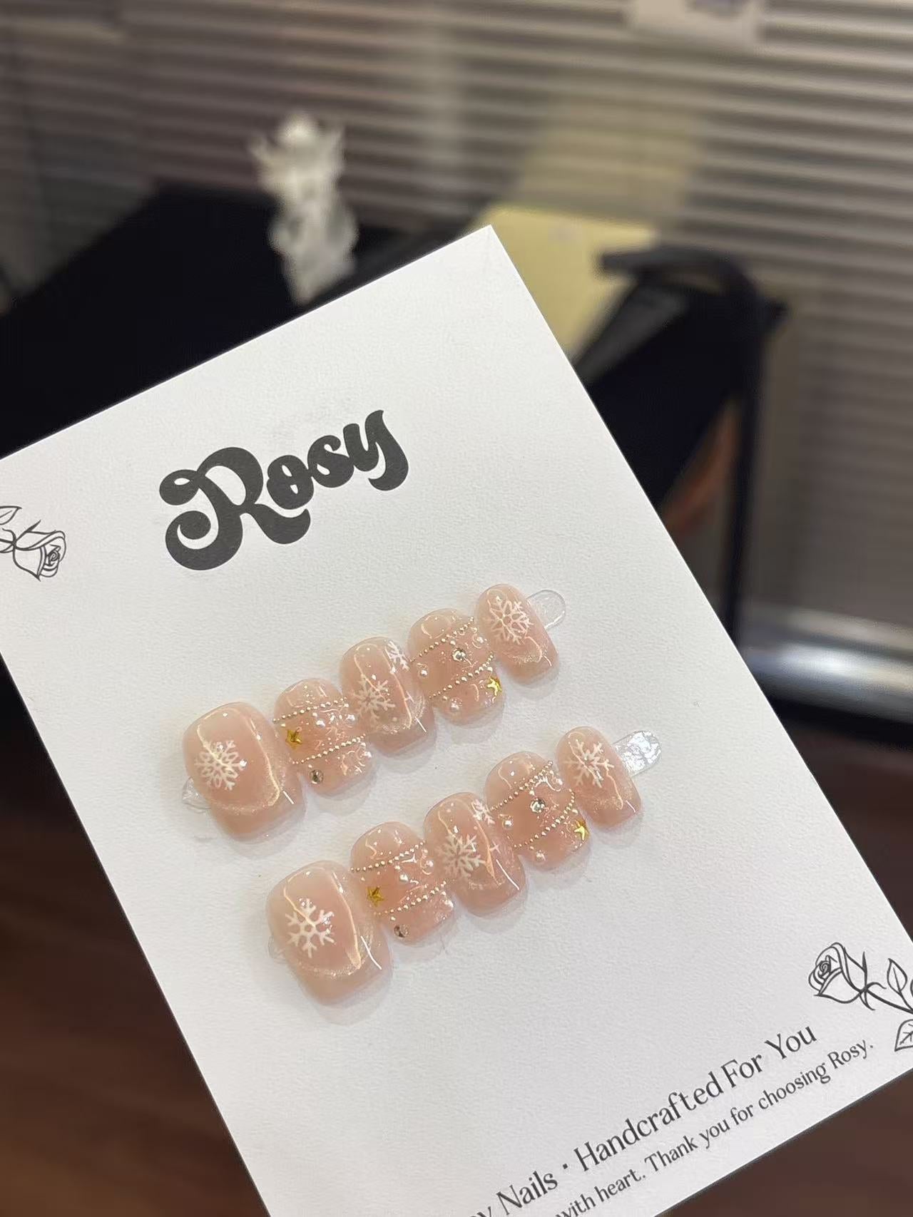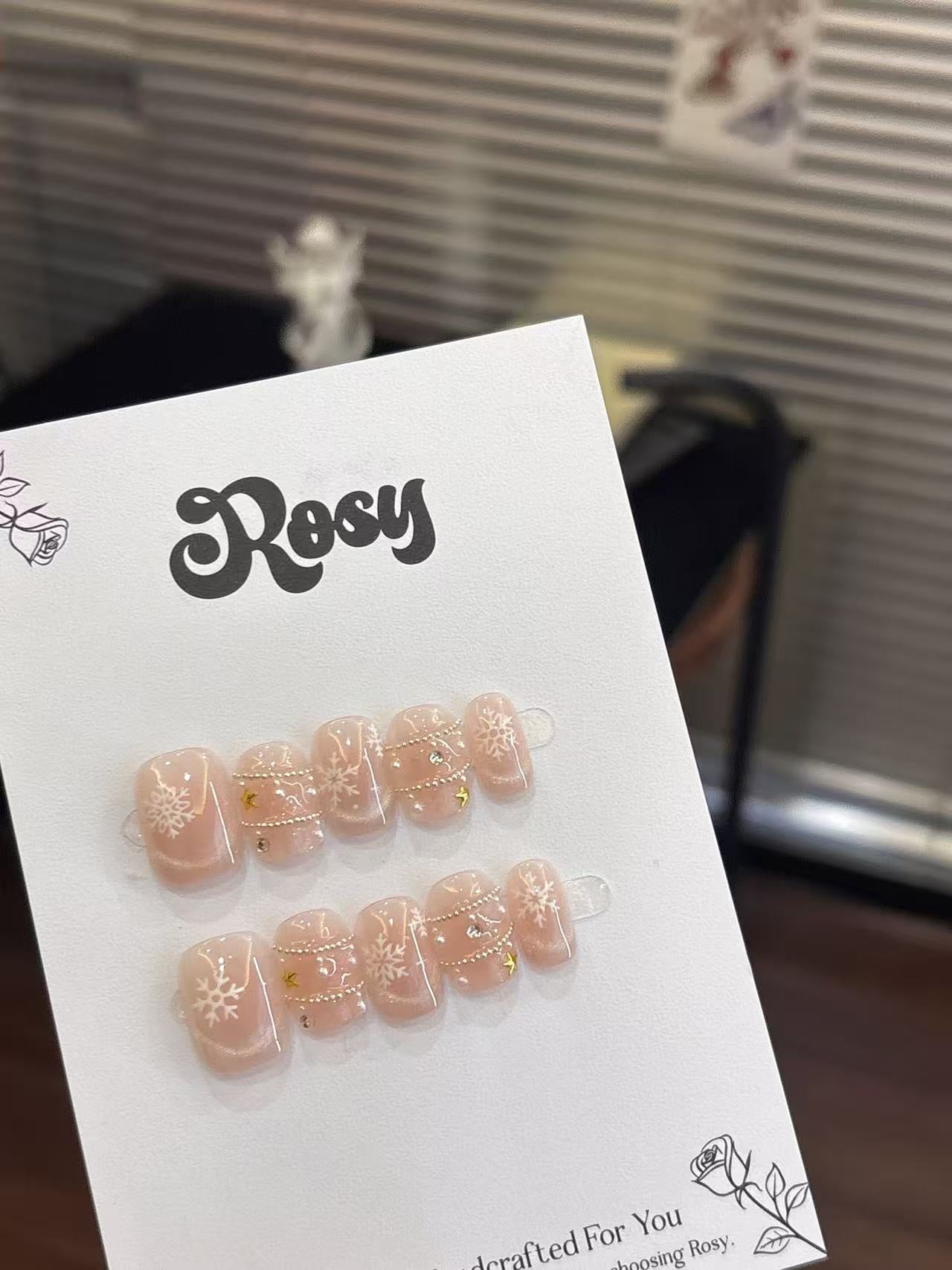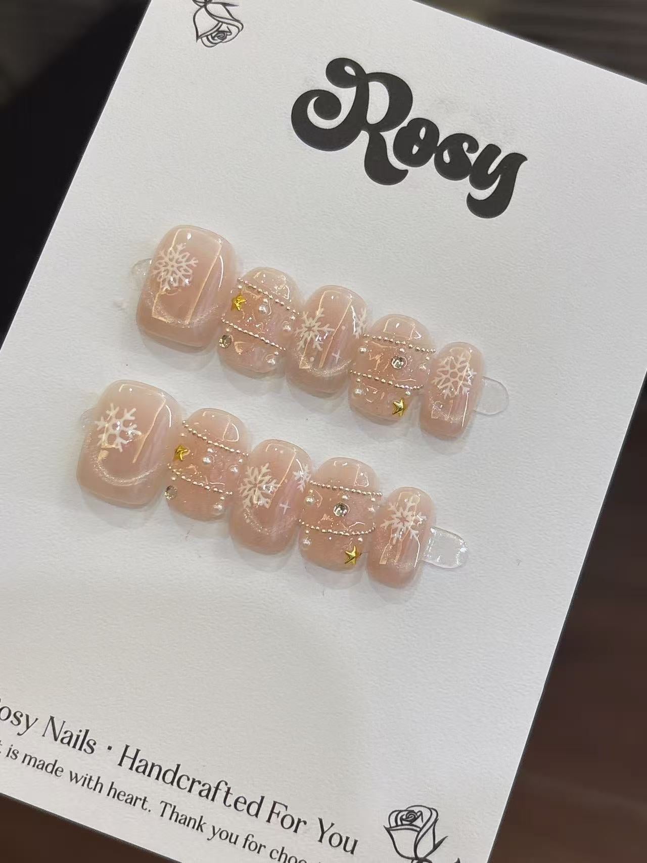❄️ 雪舞星語 · Snow Whisper 描述|Description:以柔粉作為底色,點綴細緻的白色雪花與金色星星,搭配閃亮珍珠與水鑽,層層堆疊出聖誕的夢幻氣息🎄。像雪夜中閃爍的星光,溫柔、閃耀、又浪漫💫。 特點|Features: 裸粉底色顯白氣質,百搭任何膚色💗 細膩雪花與星星點綴,節日感滿分❄️ 加入珍珠與水鑽設計,高貴又優雅✨ 適合聖誕節、冬季婚禮、約會造型🎀