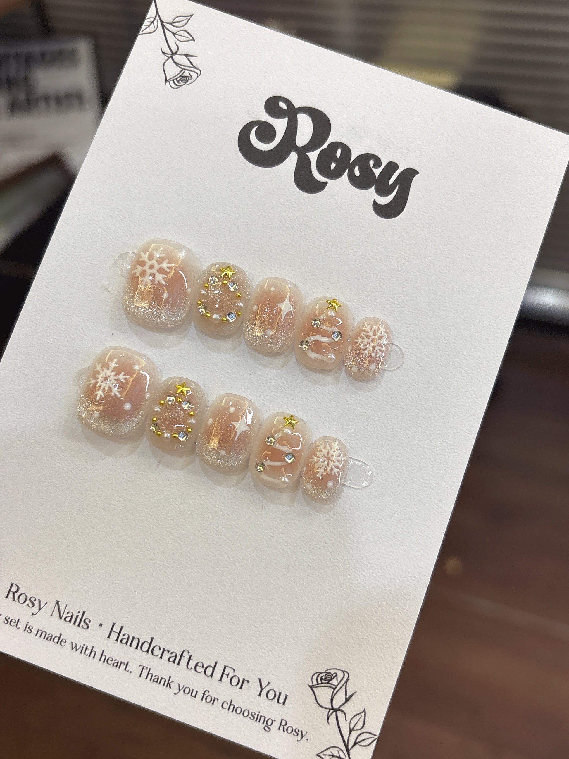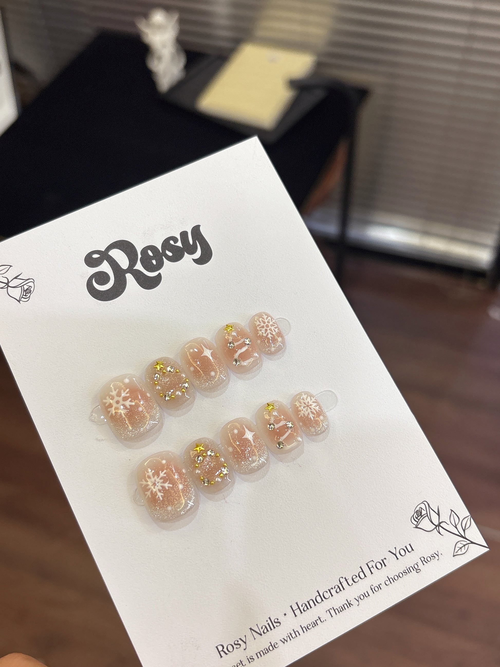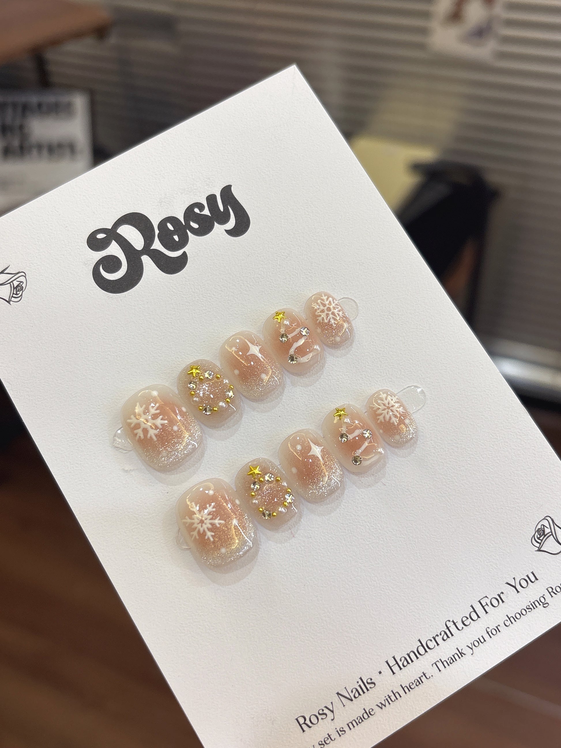 ❄️ 星雪花語 · Snowflake Whisper 描述|Description:以香檳金與銀白為主調,閃爍細粉猶如夜空中閃耀的雪光✨。雪花、星星與金鑽交織出冬日童話的浪漫氣息,柔和中帶著節日的華麗光芒,是聖誕季的完美選擇🎄。 特點|Features: 香檳粉閃耀底色 × 雪花立體設計❄️ 點綴星星與亮鑽,閃閃動人✨ 光澤柔和不俗艷,氣質滿分💎 適合冬季、聖誕節與派對造型🎀