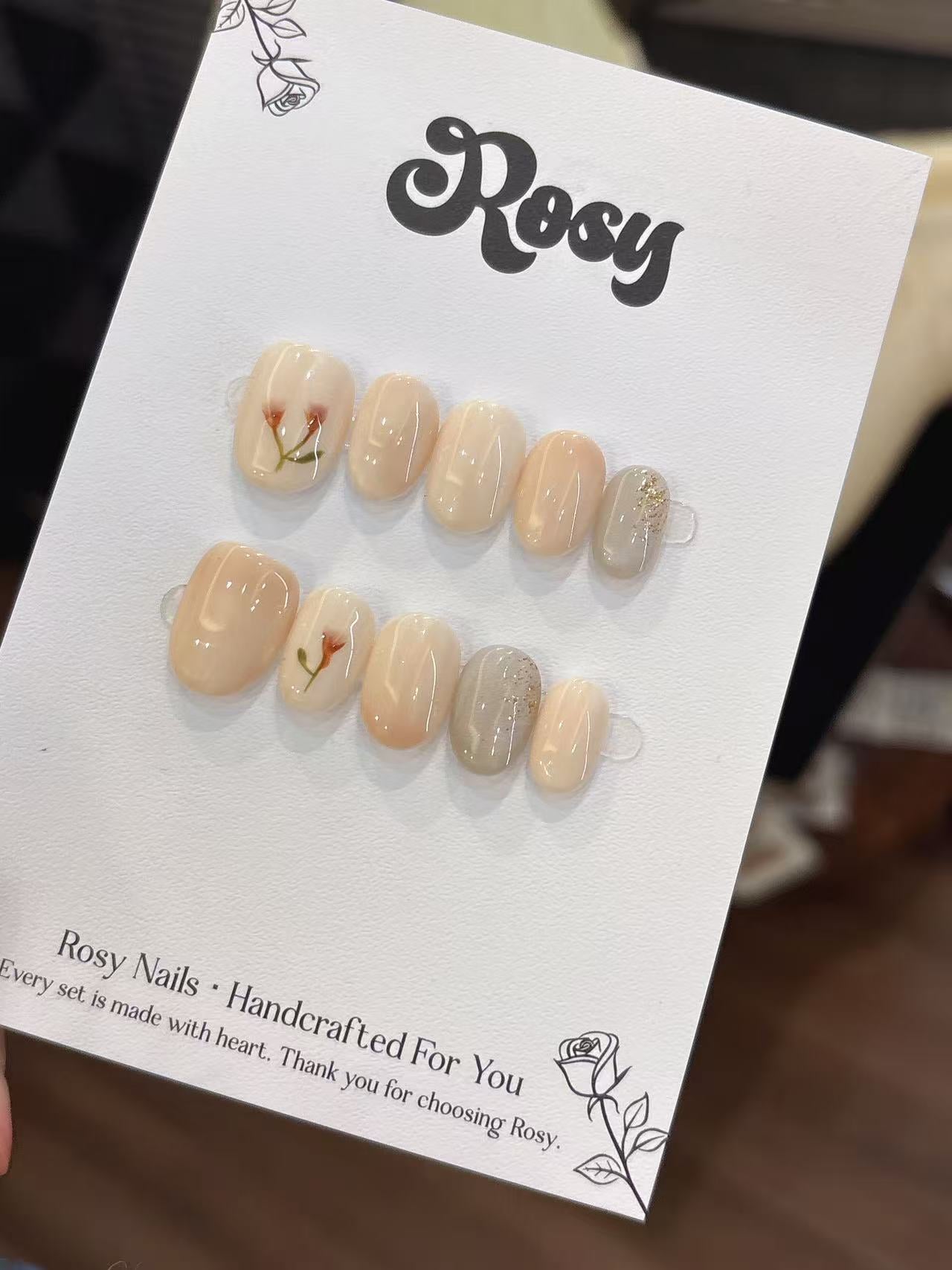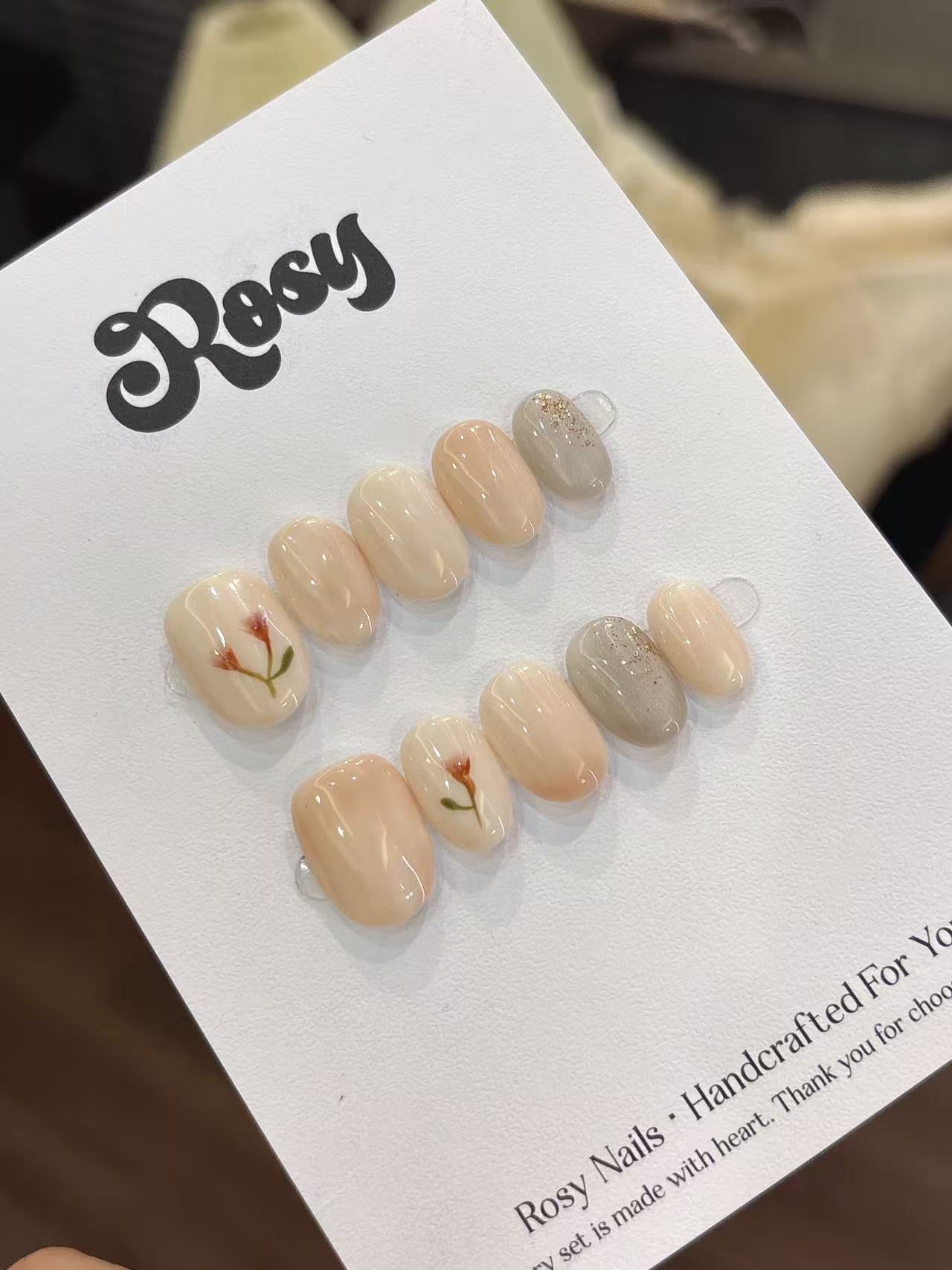 款式描述|以溫柔裸杏色為主調,整體色感清透柔和,帶輕微奶霧感,上手非常顯白又自然。設計加入手繪小花元素,線條細緻低調,呈現出靜靜綻放的溫柔氣質。配搭半透明灰米色與細緻亮粉點綴,增加層次感之餘依然保持簡約風格,不會過分浮誇。整體感覺清新、乾淨、耐看,非常適合日常配戴或想要溫柔氣質路線的女生。