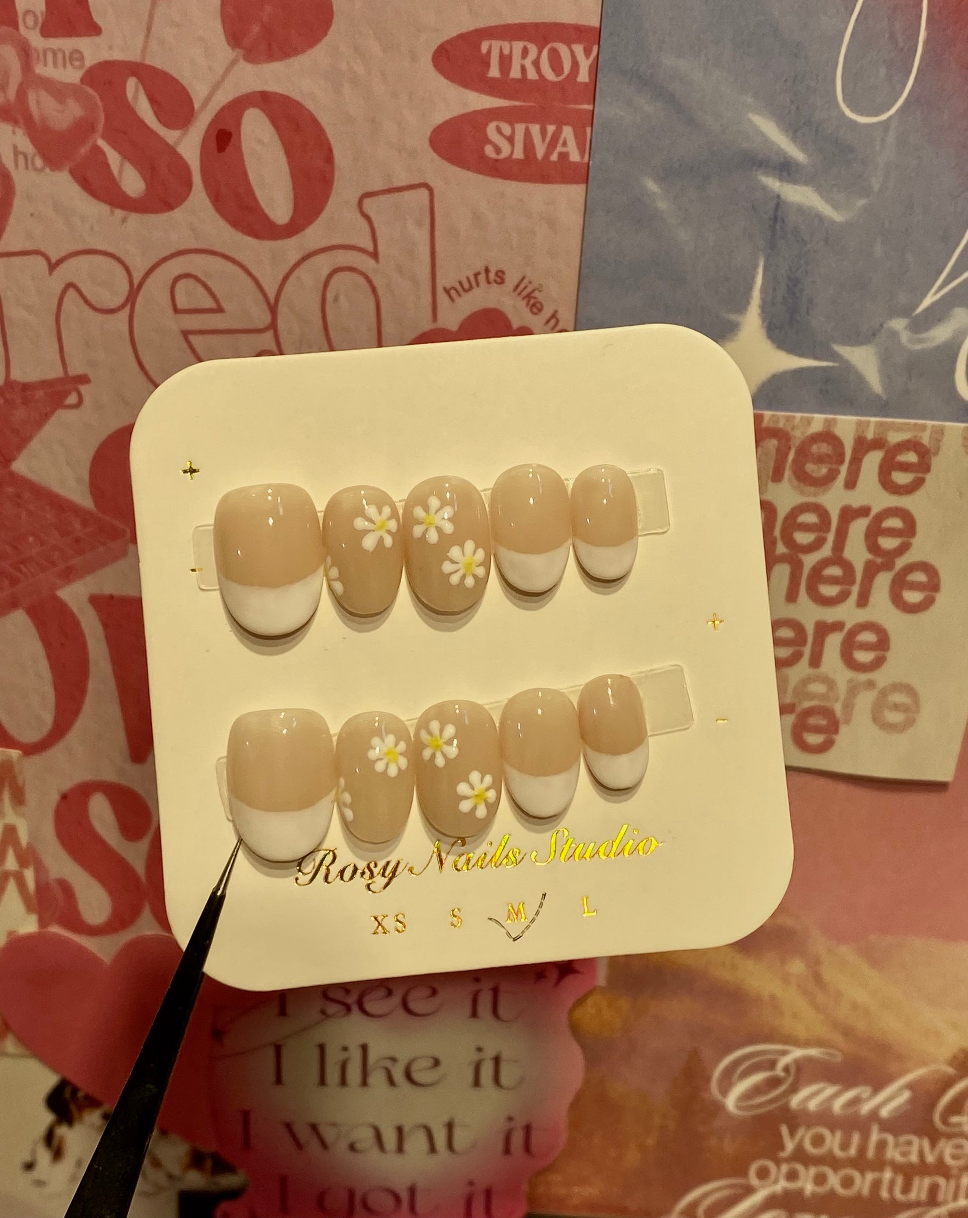 奶茶色調溫柔自然,搭配純白法式微笑線,點綴立體小雛菊🌼,簡單中散發出少女感與氣質兼具的魅力。是一款百搭又充滿春日氣息的溫柔系穿戴甲。