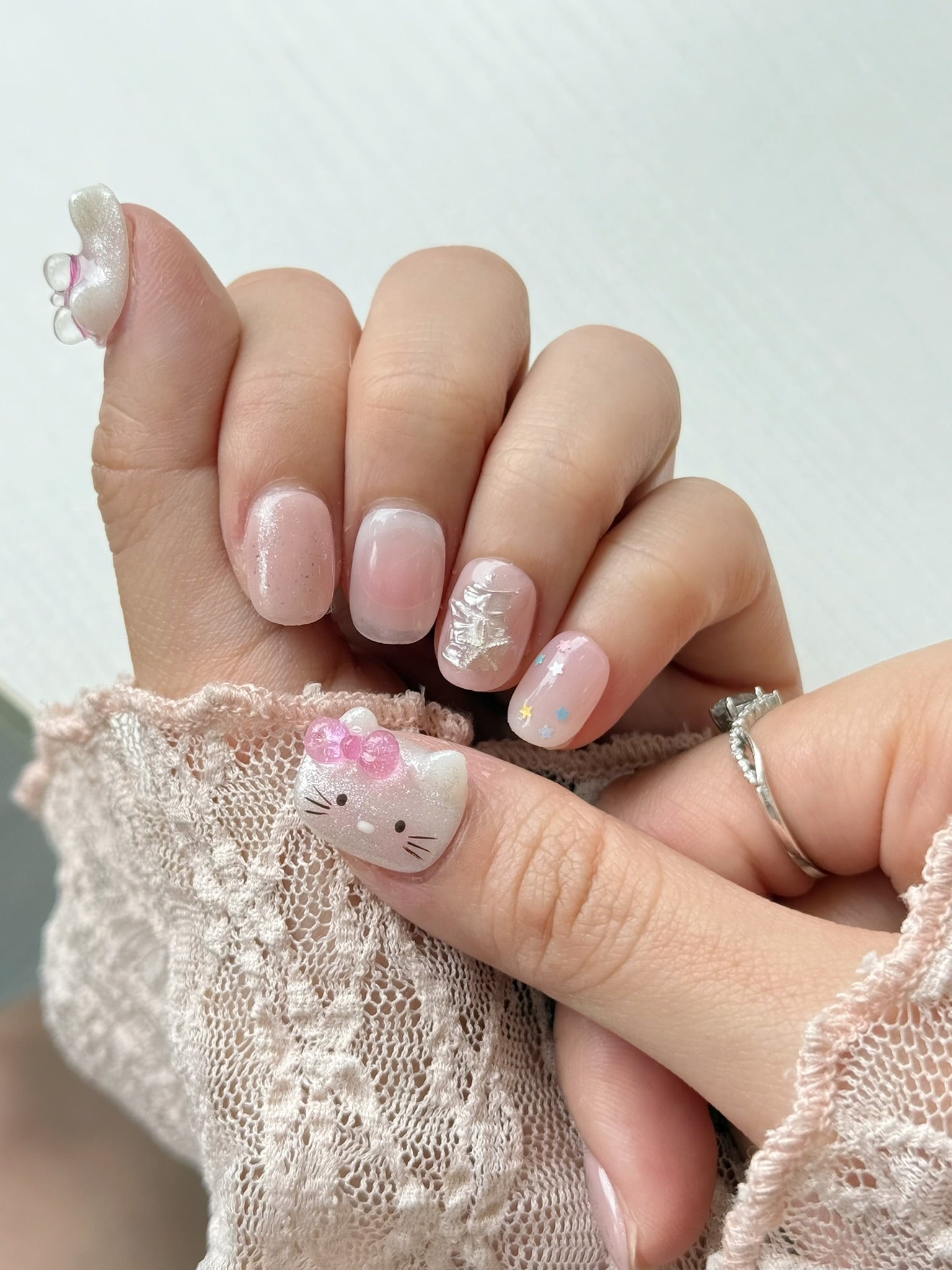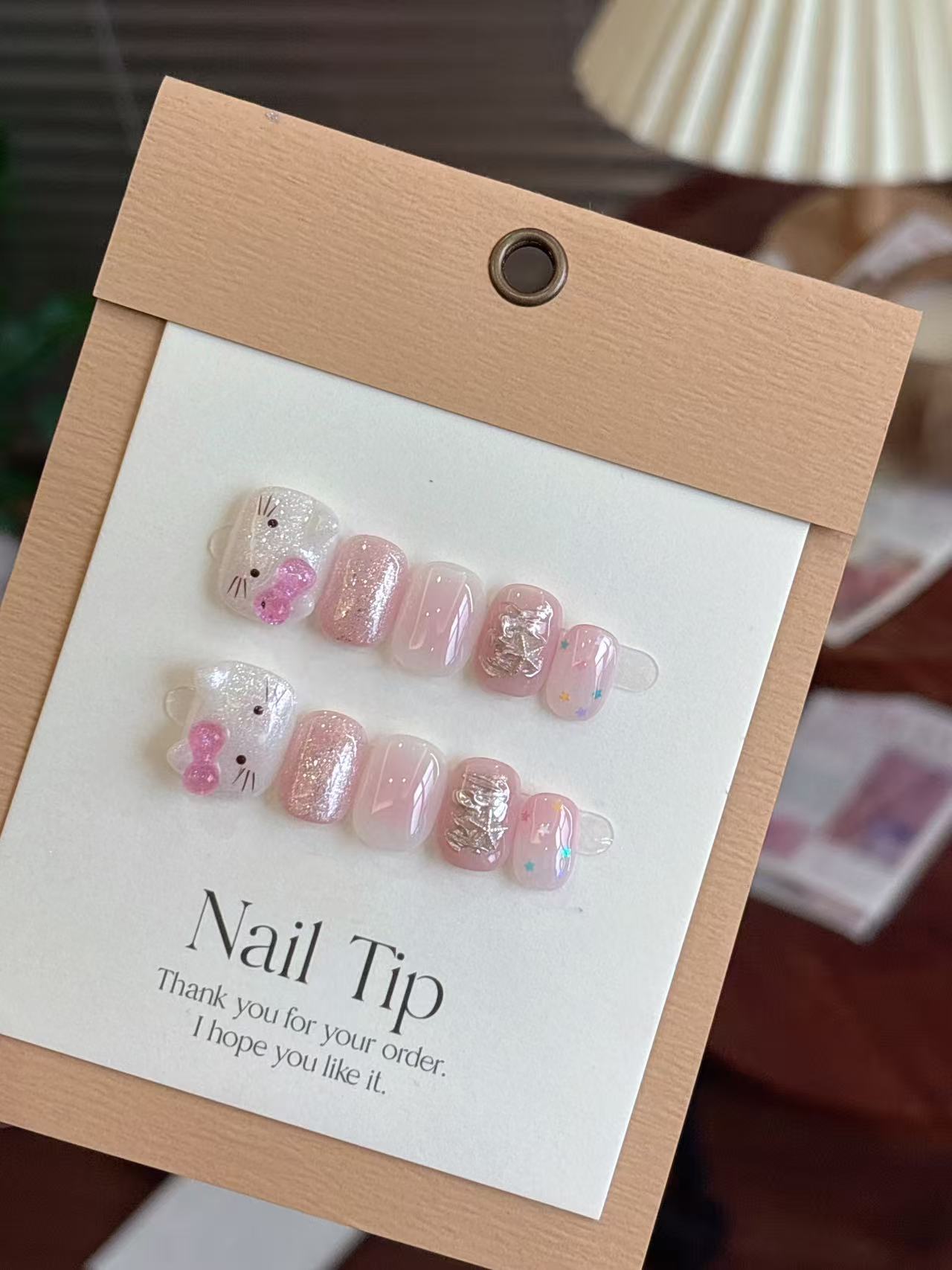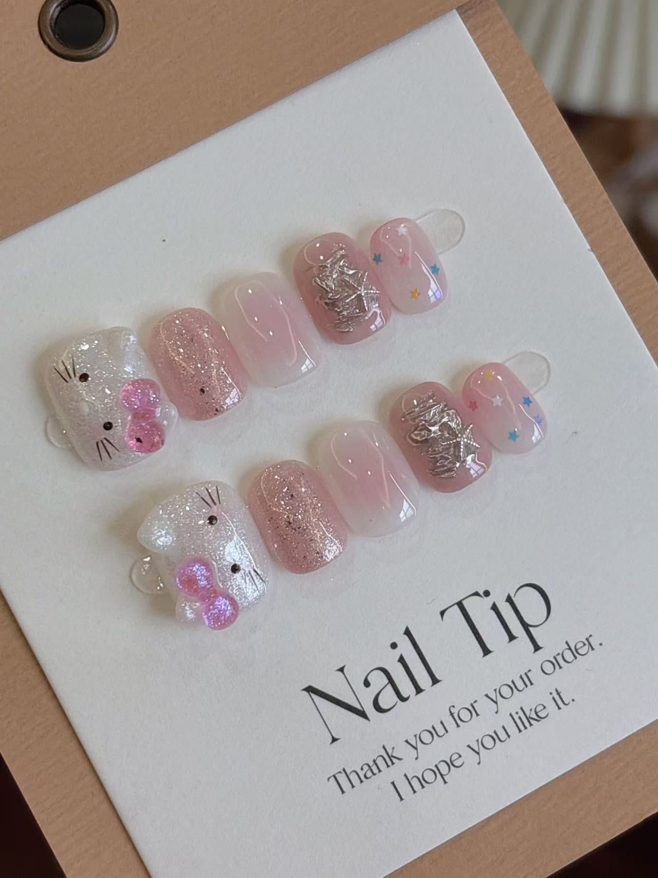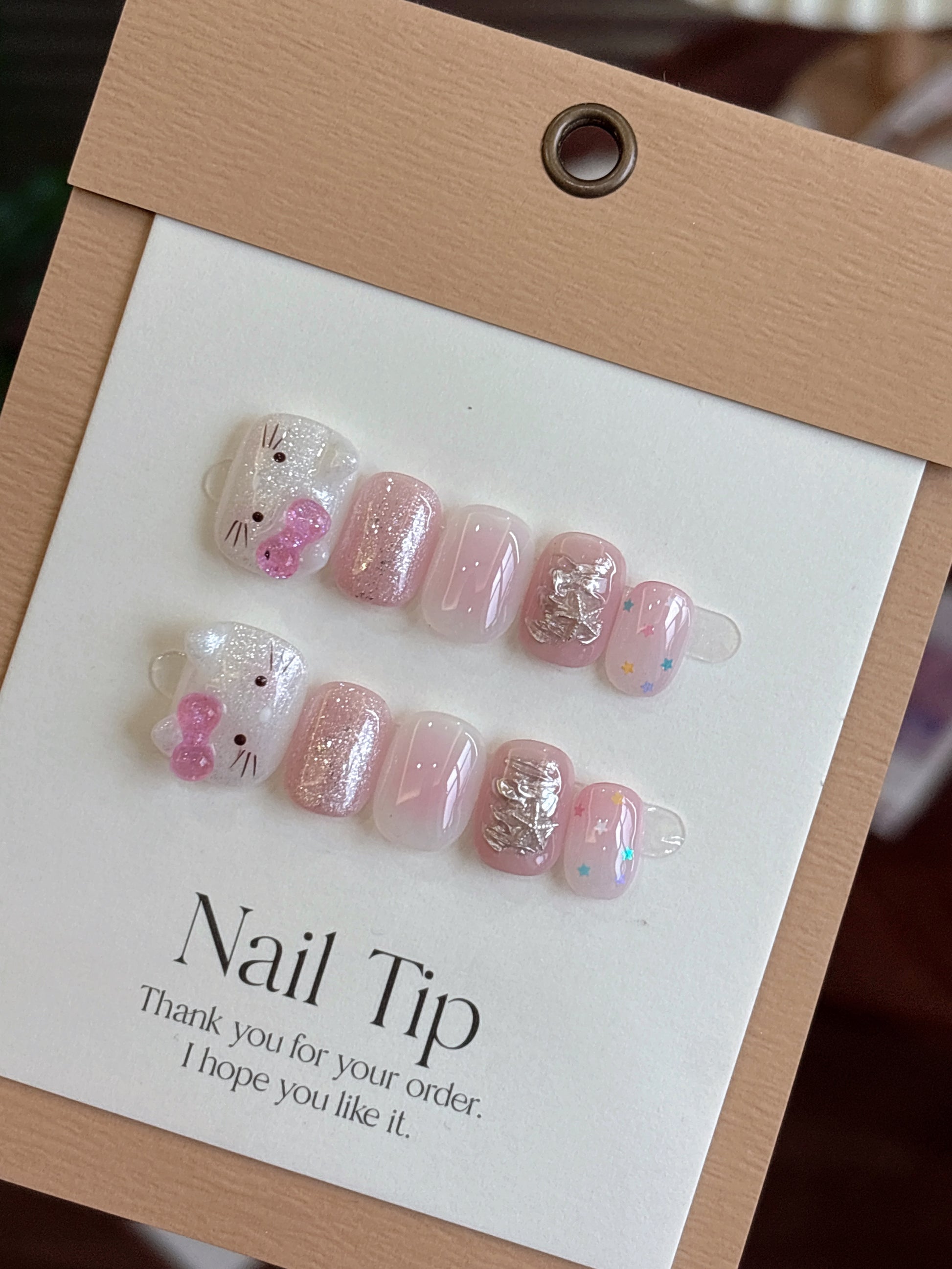 描述:粉嫩漸變與銀色箔片交織,閃爍星星點綴增添夢幻氣息。立體小貓造型配上亮粉蝴蝶結,甜美又俏皮,少女感滿滿。
