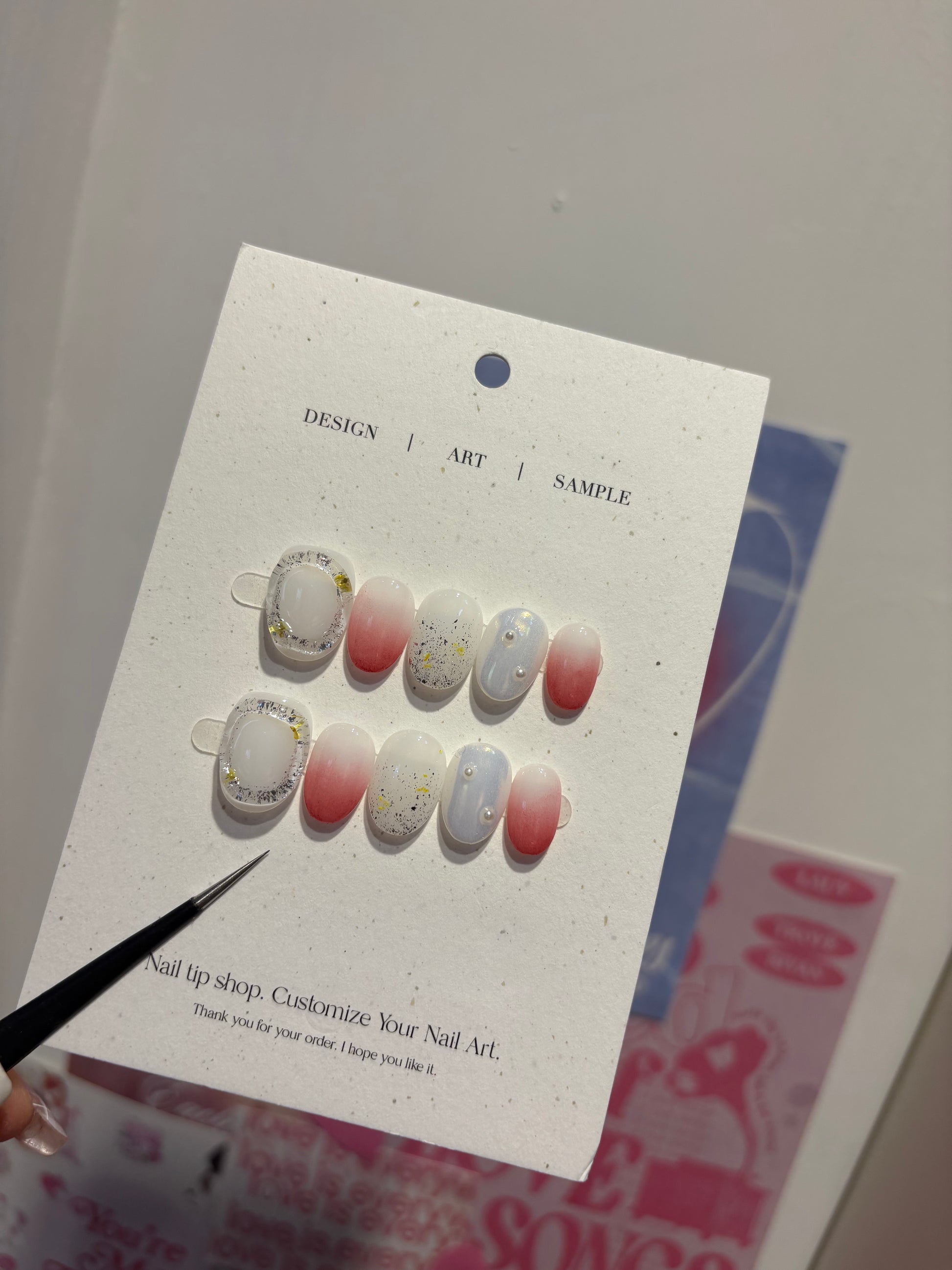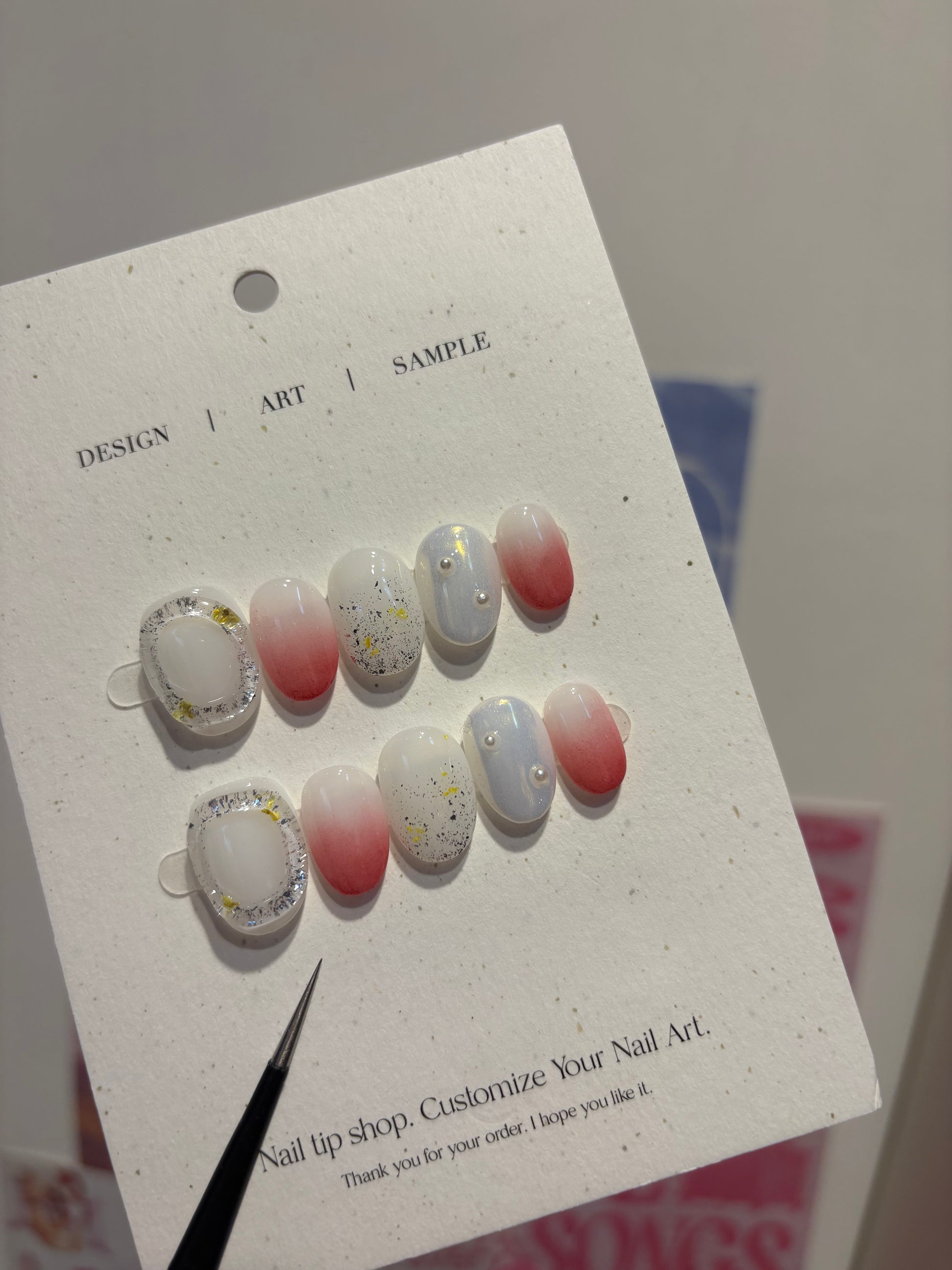 溫柔的莓紅漸層搭配珍珠白與微閃銀箔,營造如草莓奶霧般的柔和氛圍。細緻的亮片點綴其間,還有貝殼珠與透明外框設計,清新又不失華麗,甜美中藏著一點個性,適合春夏出遊或約會穿搭。