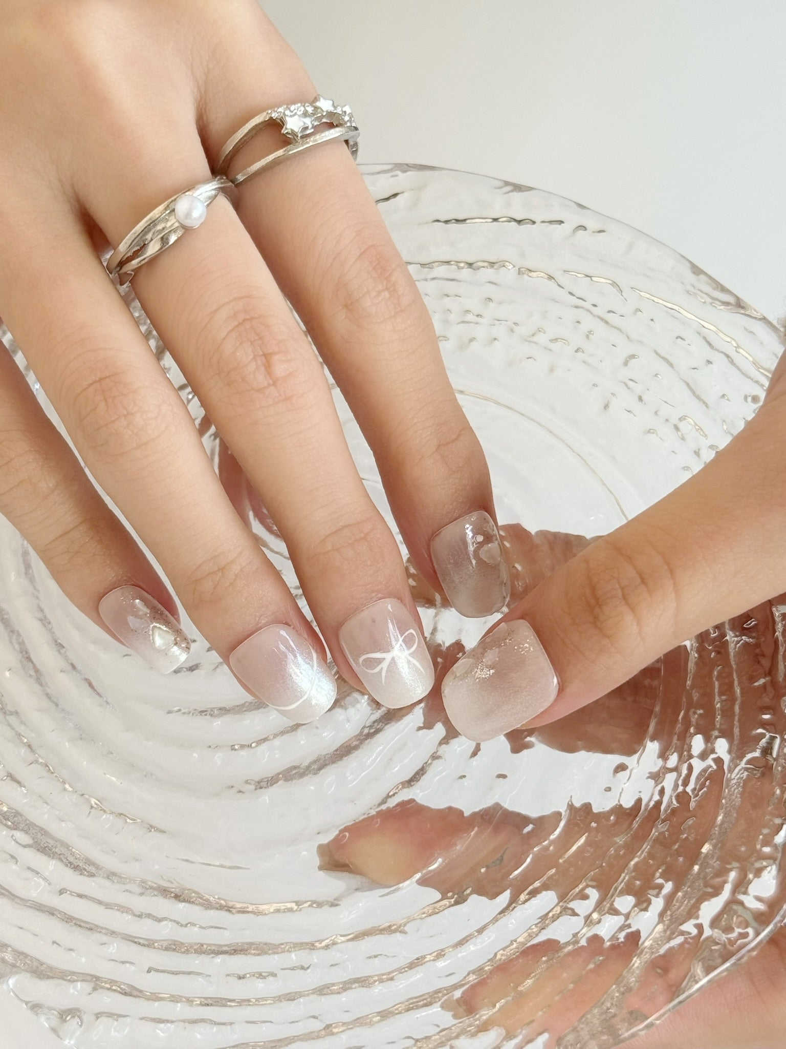 溫柔的香草裸米色調,融入閃片與手繪白色蝴蝶結,仿如穿上一件甜美蕾絲裙,細膩可愛又百搭。適合日常、約會或日系穿搭,低調中透露滿滿心思。🤍