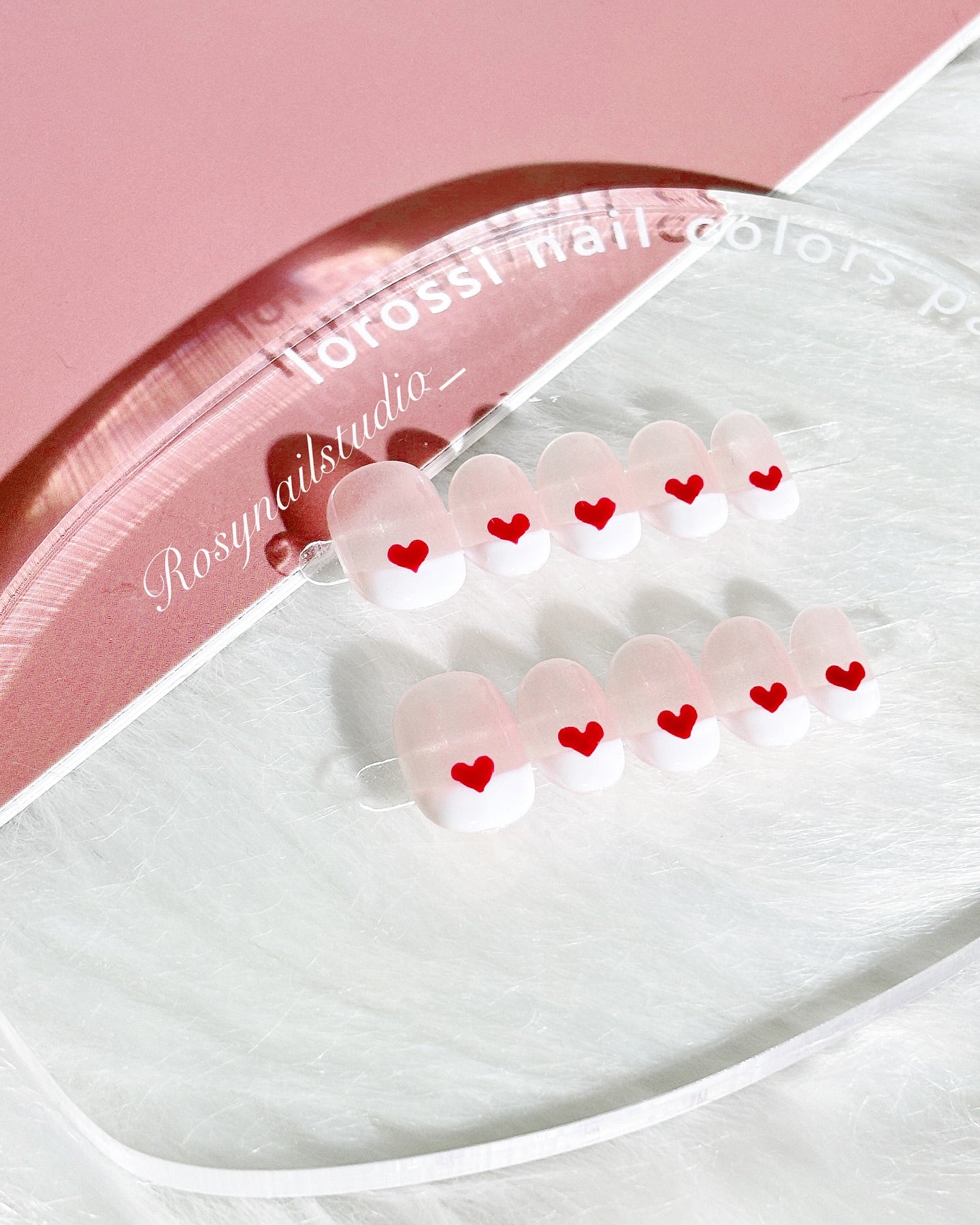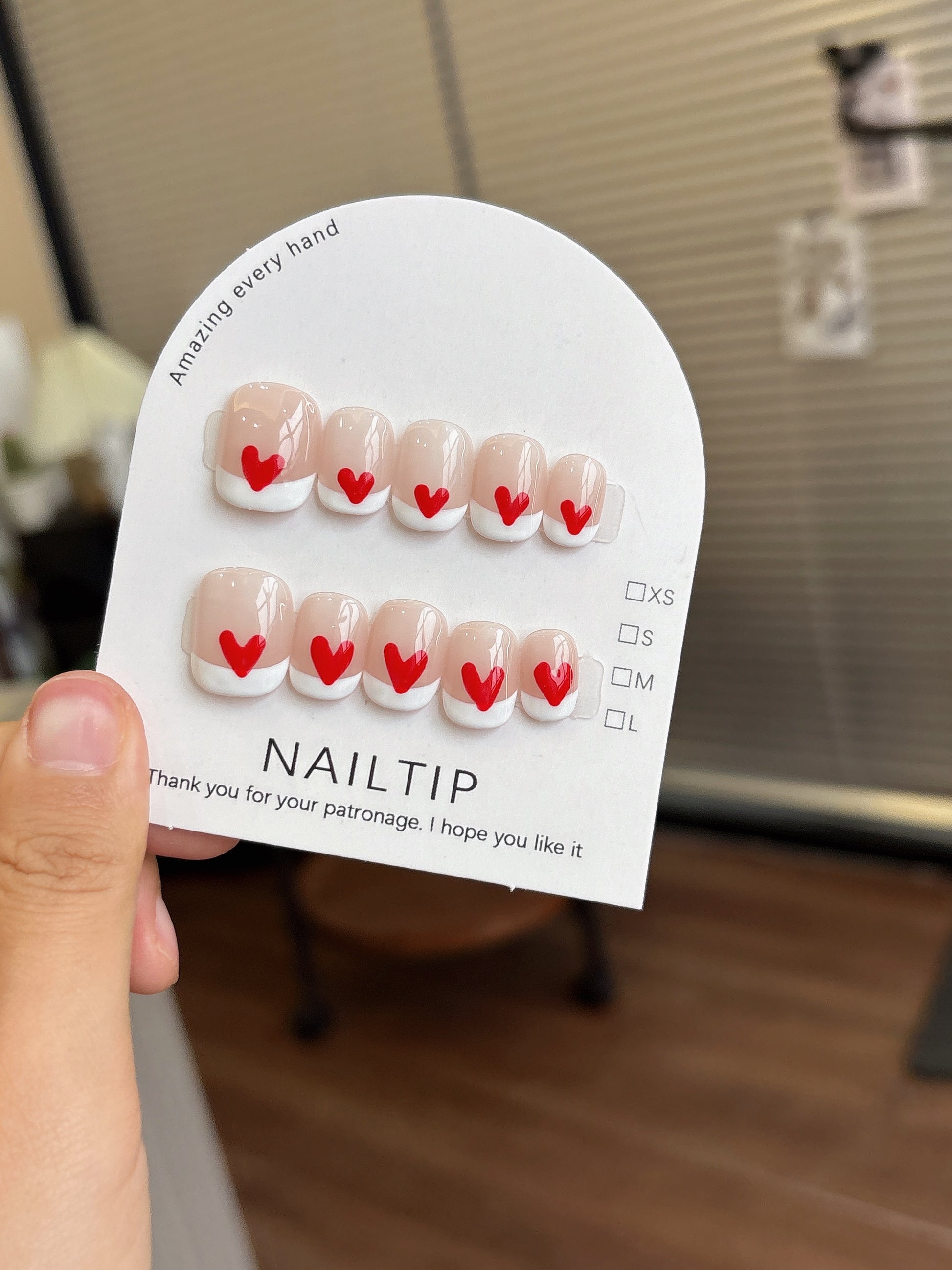這款穿戴甲融合經典法式美甲與甜美元素,以溫柔的裸粉色作為基底,搭配俐落的純白法式微笑線,展現簡約優雅風格 💅。每片指甲中央點綴鮮紅愛心 ❤️,為整體增添一抹俏皮與浪漫氛圍 💕。這款設計適合約會、情人節或日常穿搭,讓你的指尖時刻散發甜美氣息 ✨。