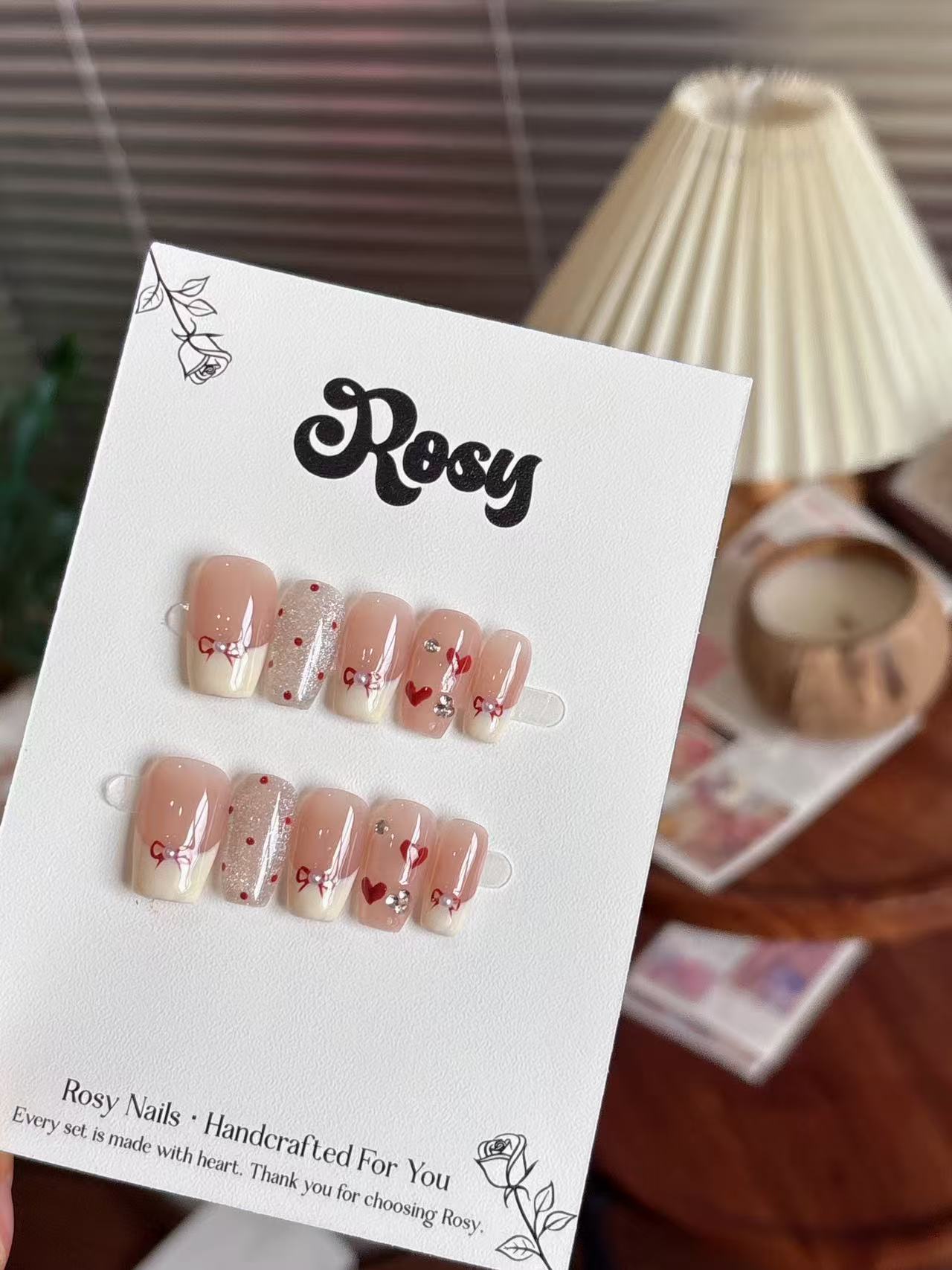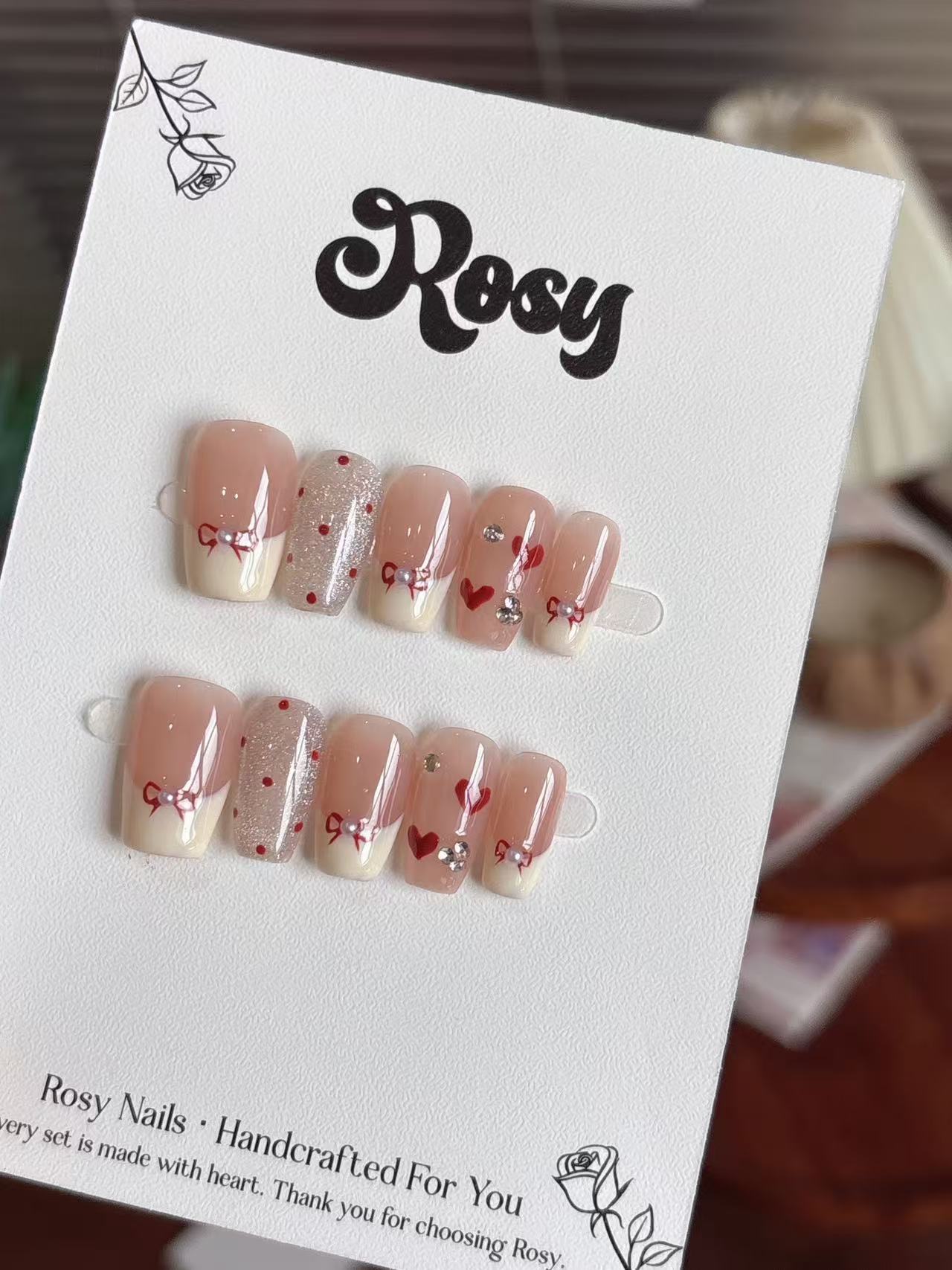 描述: 裸粉漸變打底,搭配白色法式邊,點綴紅色小蝴蝶結、心形與水鑽,並加入細緻亮片,整體呈現甜美浪漫又帶點俏皮感。