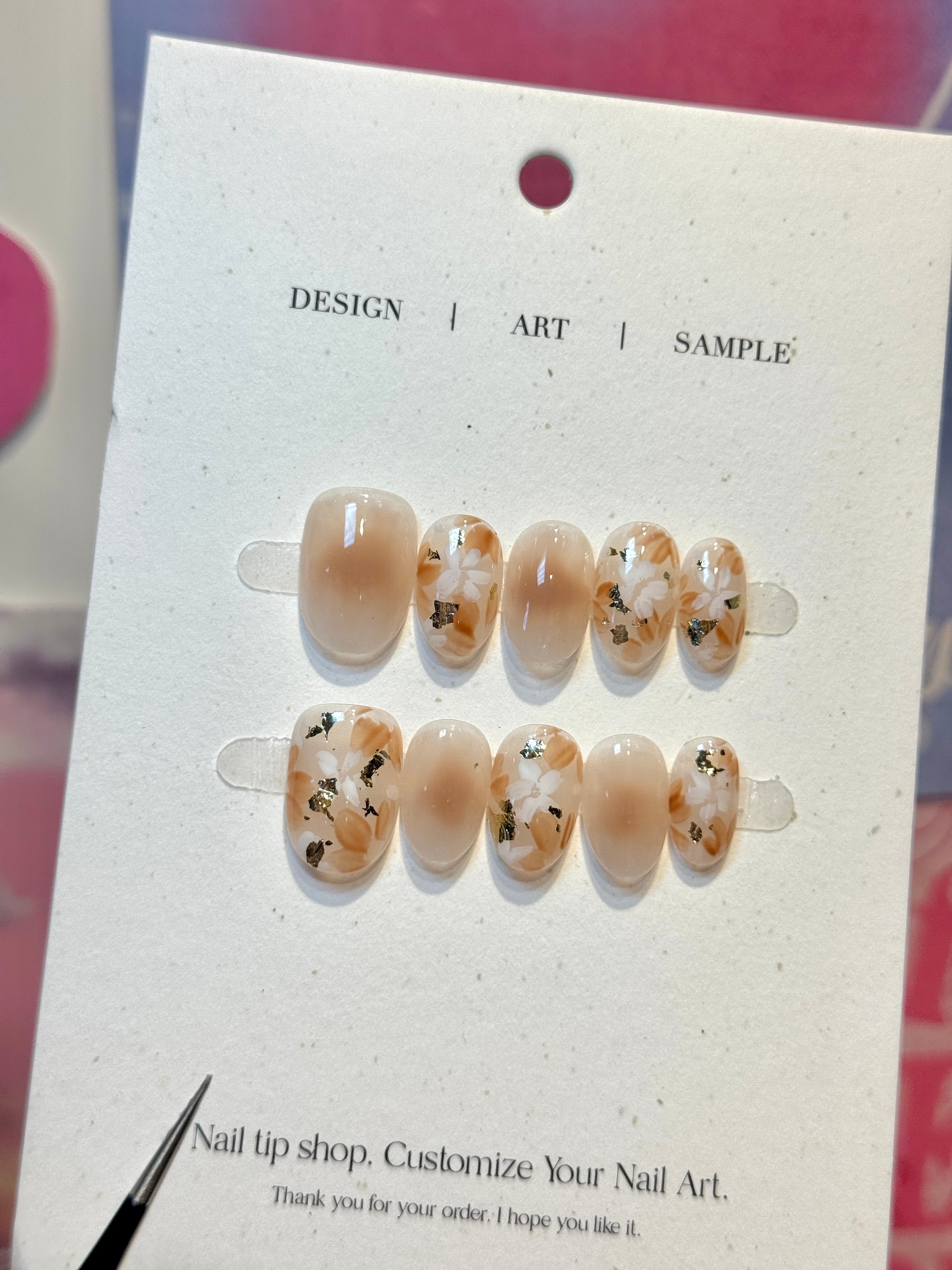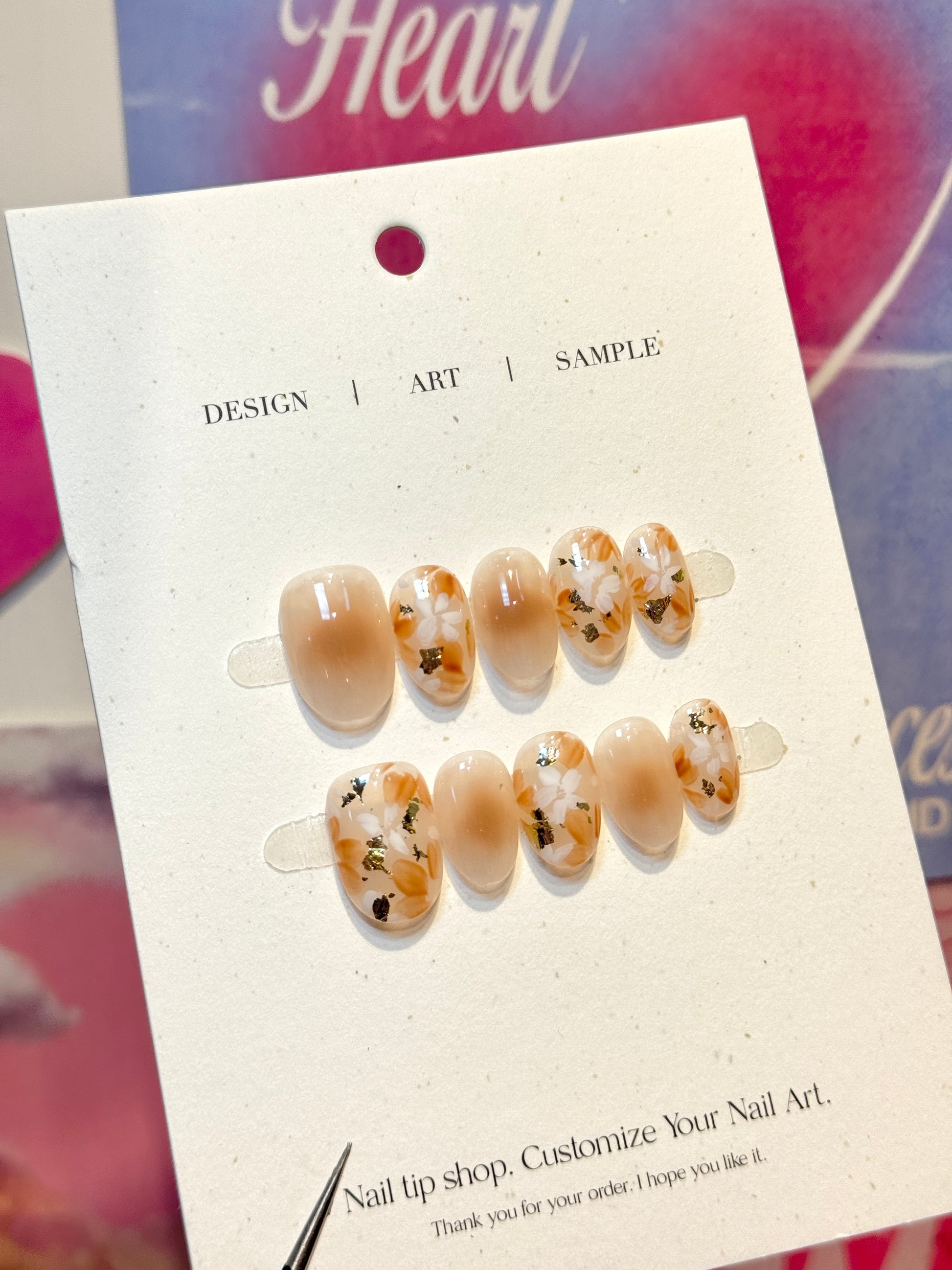 Toffee Bloom 🍯🌼 太妃花語以奶油太妃糖色為主調,搭配手繪白色小花與金箔點綴,甜美中帶點復古感。柔和的暈染過渡讓整體更加自然細膩,充滿春日午後的溫柔氣息,適合愛簡約又不失設計感的你。