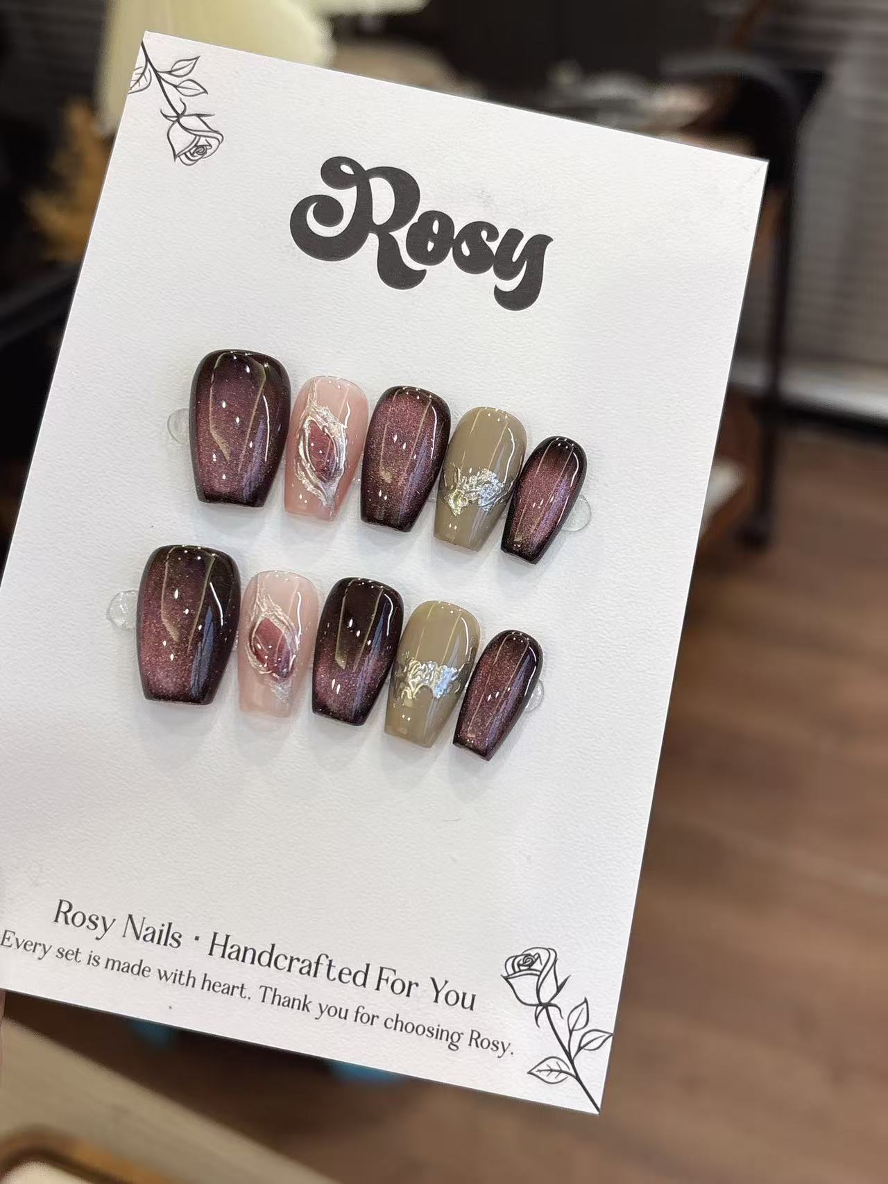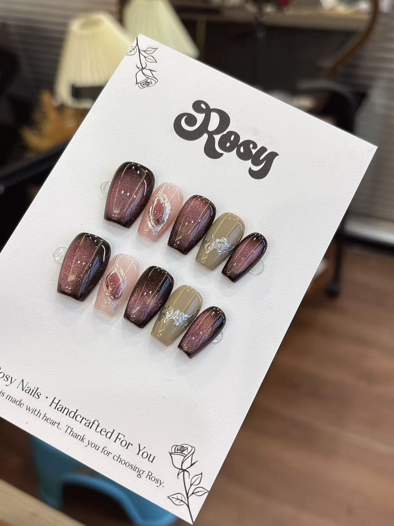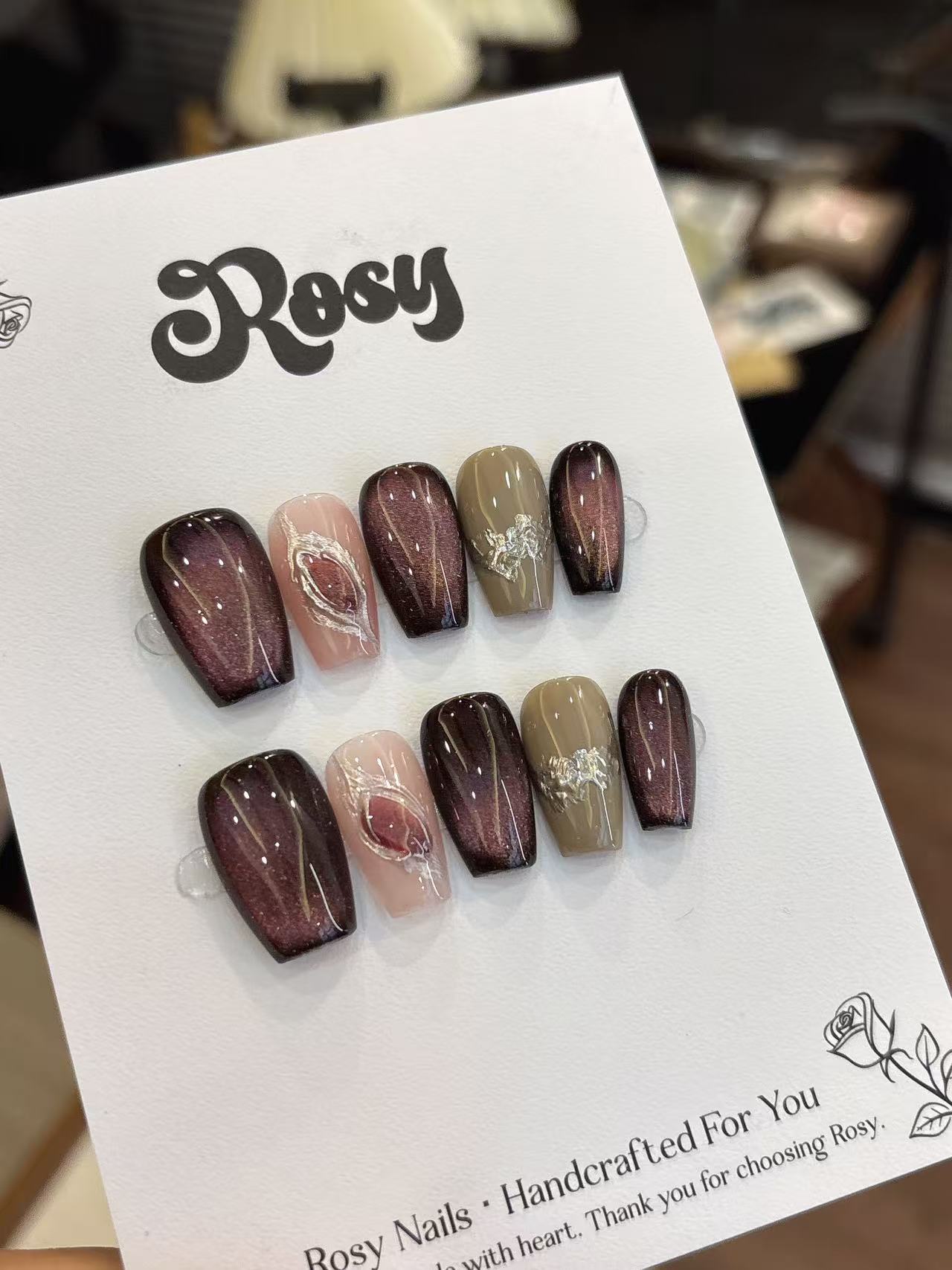 描述|Description:低調卻充滿層次的酒紅與霧灰漸層,宛如夜色中輕語的微光,溫柔又神秘。金屬銀線與光貓眼折射出冷冽光澤,讓整體氣質更顯高級與成熟,是冬夜最耐看的靜謐系美甲。✨ 特點|Features: 酒紅×灰調漸層設計,氣質穩重🖤 金屬細節點綴,增添質感💫 微貓眼反光,光影流轉間展現手部曲線🌌 適合秋冬穿搭、聚會造型💅🏻