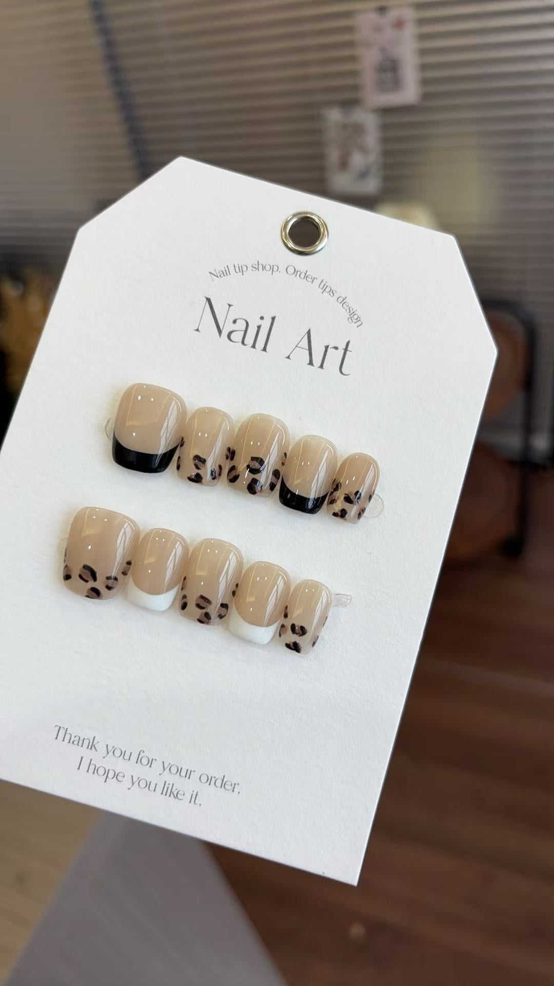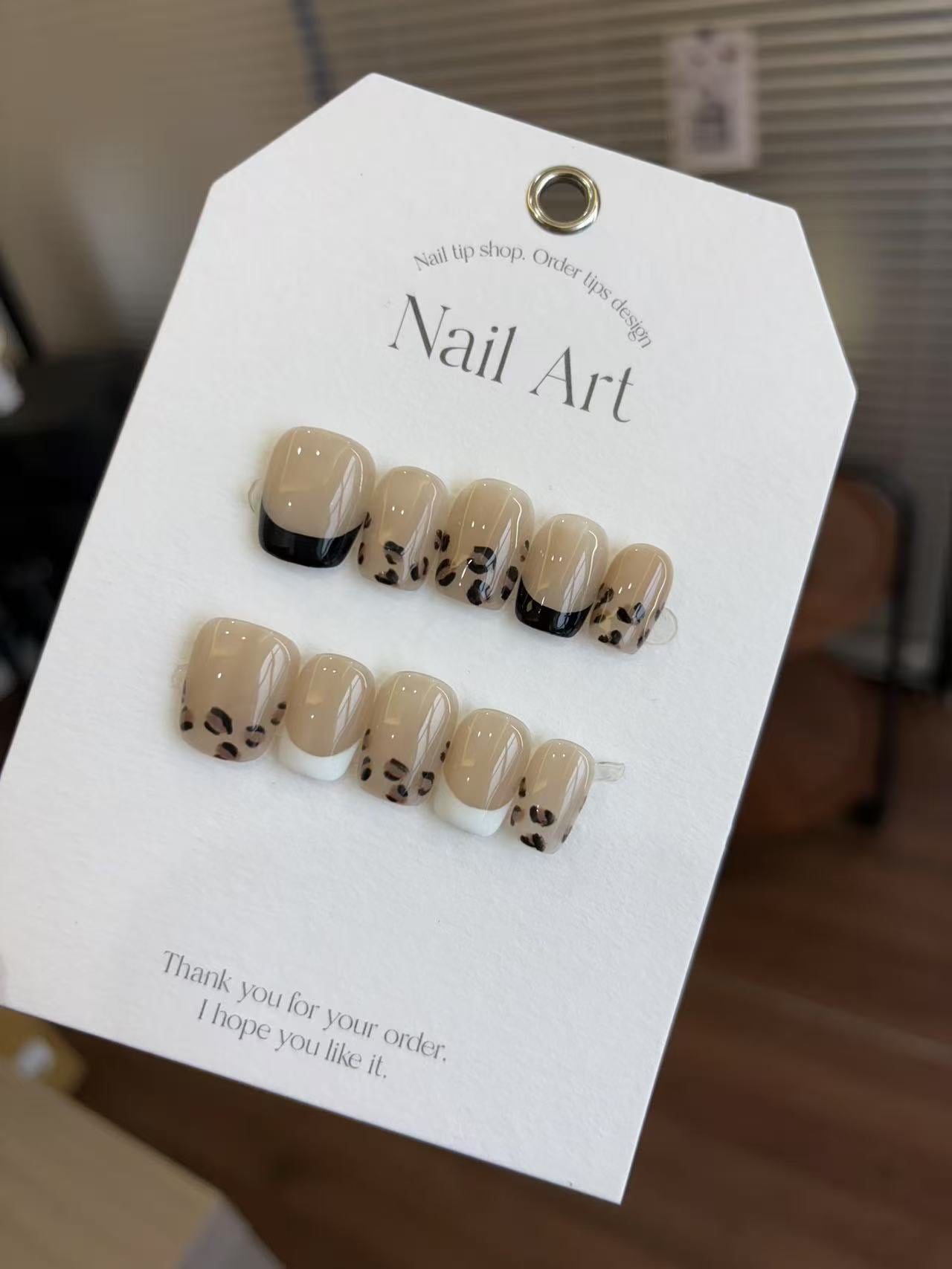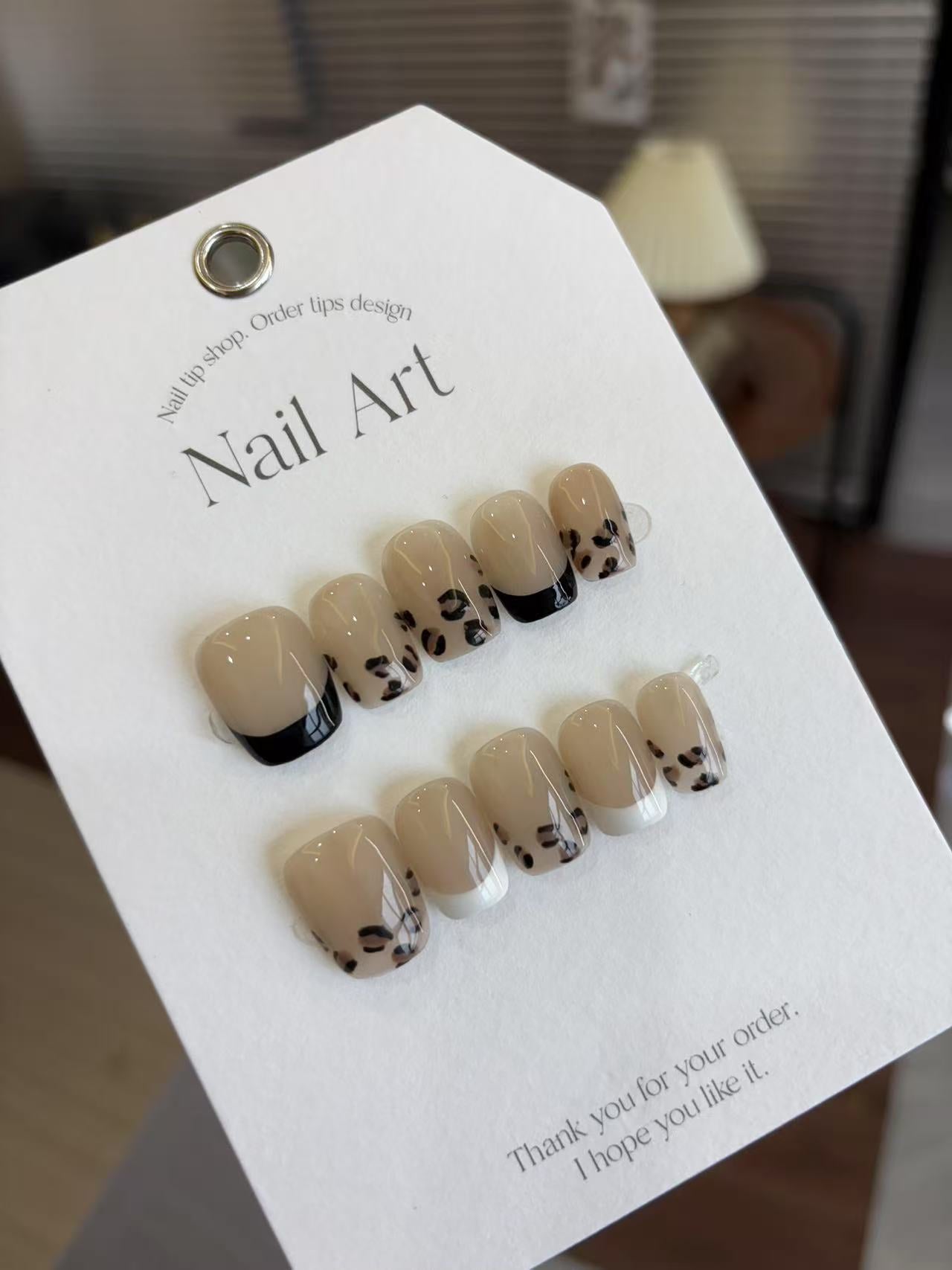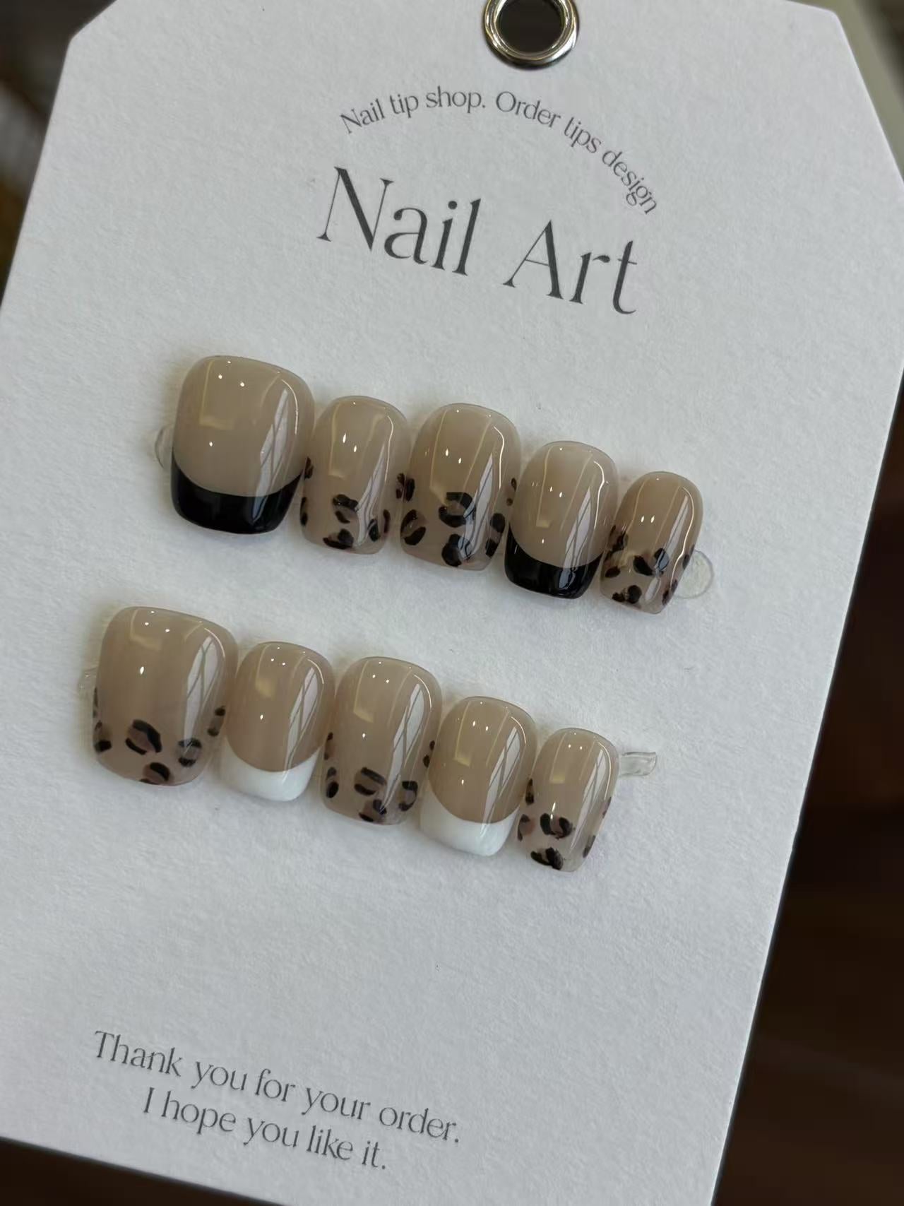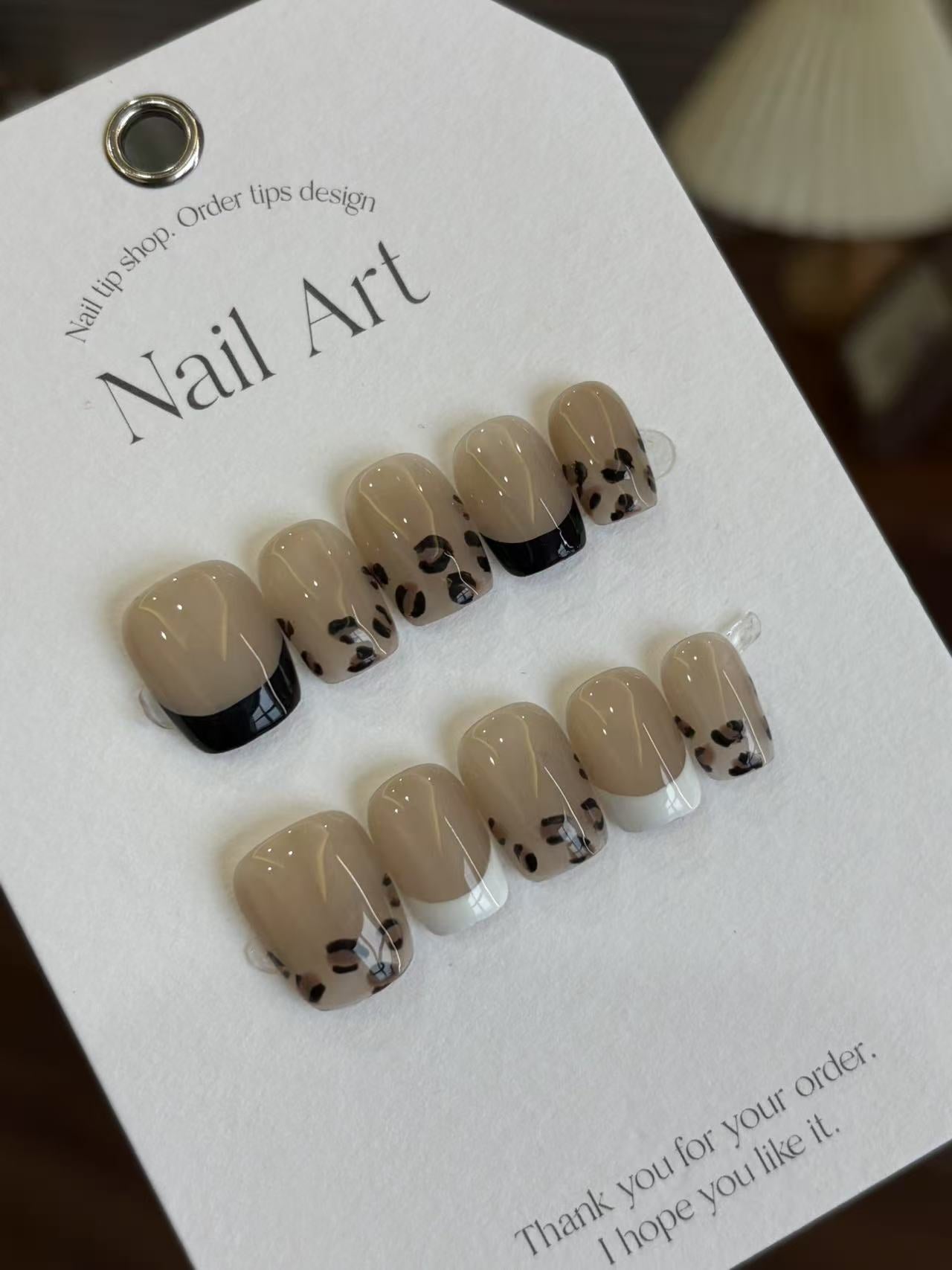 以高級奶茶裸色為基底,融合個性豹紋與經典黑白法式邊,展現野性與優雅並存的時尚氣息。